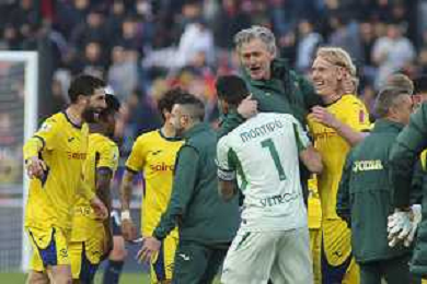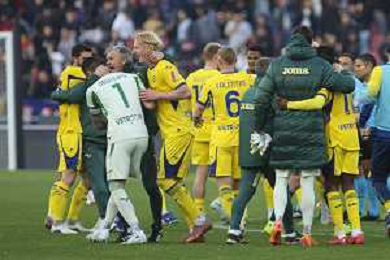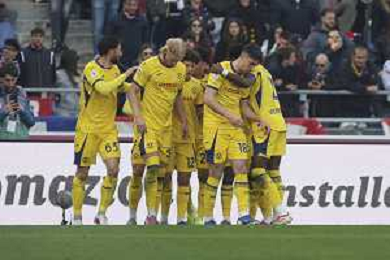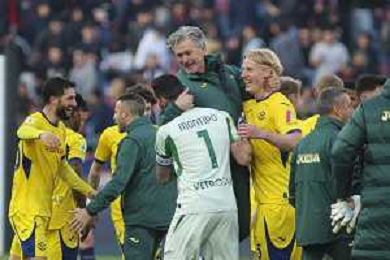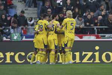 Hellas Veorna players celebrate the victory at the end of Bologna FC vs Hellas Verona, 28° Serie A Enilive 2025-26 game at Renato Dall'Ara stadium in Bologna (BO), Italy, on March 08, 2026. (Photo by Davide Casentini)- AGENZIA ALDO LIVERANI SAS