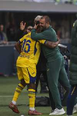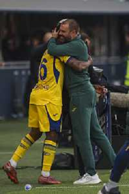 Paolo Sammarco Head Coach of Hellas Verona FC hugs Gift Orban of Hellas Verona FC for celebrate the victory at the end of Bologna FC vs Hellas Verona, 28° Serie A Enilive 2025-26 game at Renato Dall'Ara stadium in Bologna (BO), Italy, on March 08, 2026. (Photo by Davide Casentini)- AGENZIA ALDO LIVERANI SAS
