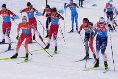 Nora Elisabeth FALSTER, NOR, bib number 9, run 1, Leonie PERRY, FRA, bib number 1, run 1, Marina KAELIN, SUI, bib number 5, run 1, Nadine LAURENT, ITA, bib number 13, run 1, Elin HENRIKSSON, SWE, bib number 7, run 1, Alison MACKIE, CAN, bib number 2, run 1, Lisa ERIKSSON, SWE, bib number 6, run 1, Liv COUPAT, FRA, bib number 17, run 1, Siri WIGGER, SUI, bib number 28, run 1, action photo, U23 Women's 20km Mass Start Free at FIS Junior and U23 World Cross-Country Ski Championships in Lillehammer, Norway, 2026-03-05, Photo Credit: action press / David Soldati / KarmaPress - AGENZIA ALDO LIVERANI SAS ITALY ONLY EDITORIAL USE ONLY