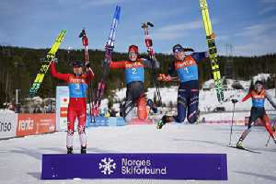 Eva INGEBRIGTSEN, NOR, bib number 3, run 1, Alison MACKIE, CAN, bib number 2, run 1, Leonie PERRY, FRA, bib number 1, run 1, Anna STEWART, CAN, bib number 46, run 1, winner photo, U23 Women's 20km Mass Start Free at FIS Junior and U23 World Cross-Country Ski Championships in Lillehammer, Norway, 2026-03-05, Photo Credit: action press / Fredrik Hagen / KarmaPress - AGENZIA ALDO LIVERANI SAS ITALY ONLY EDITORIAL USE ONLY