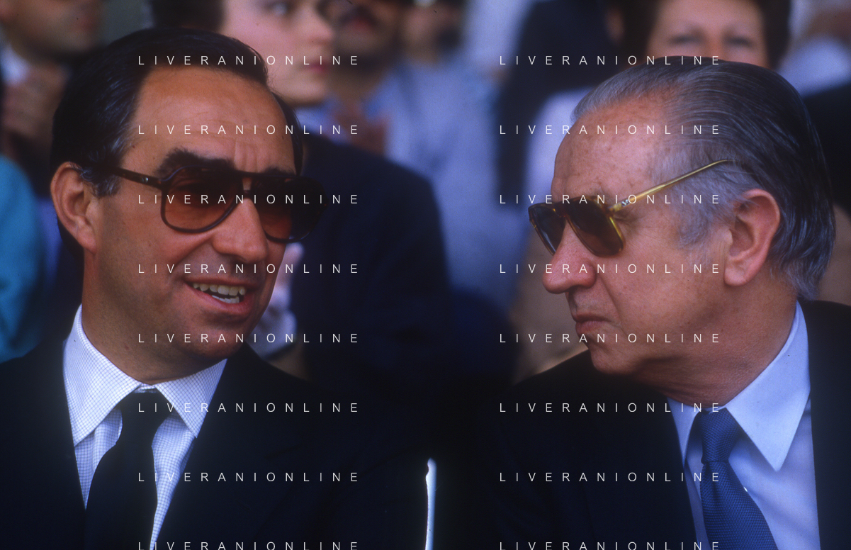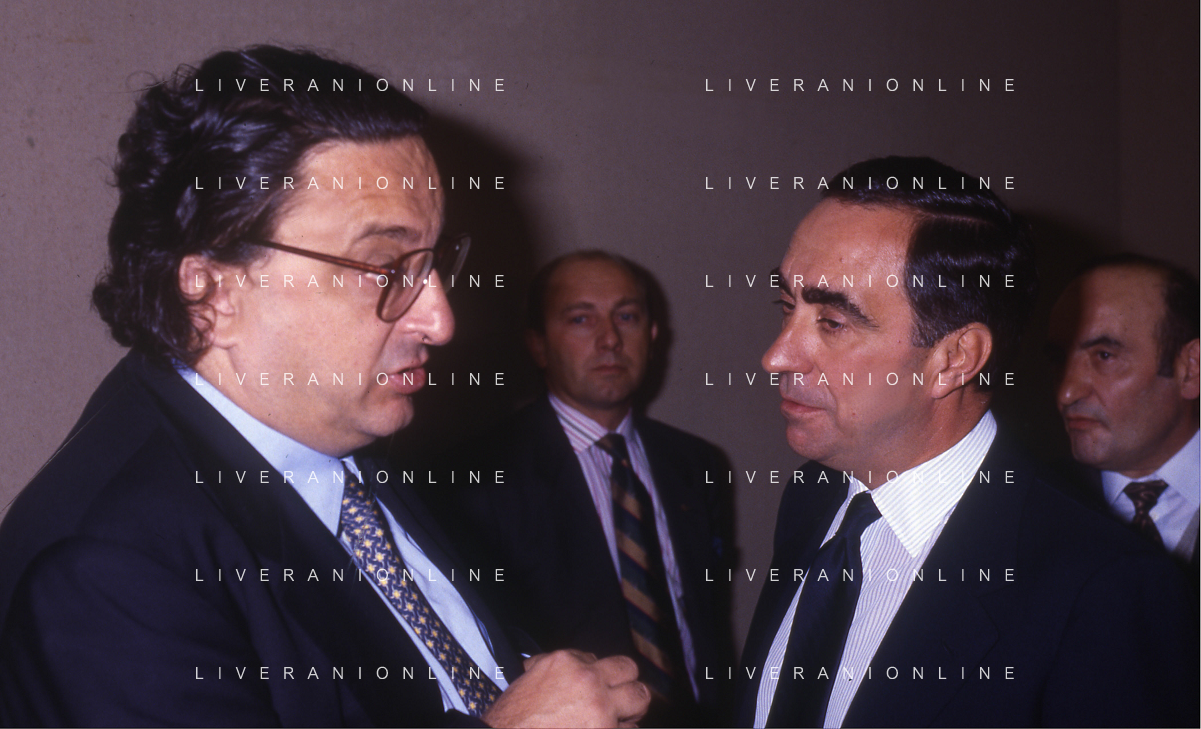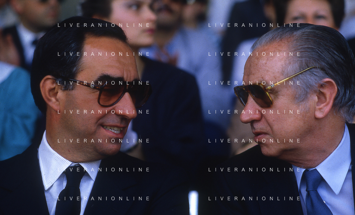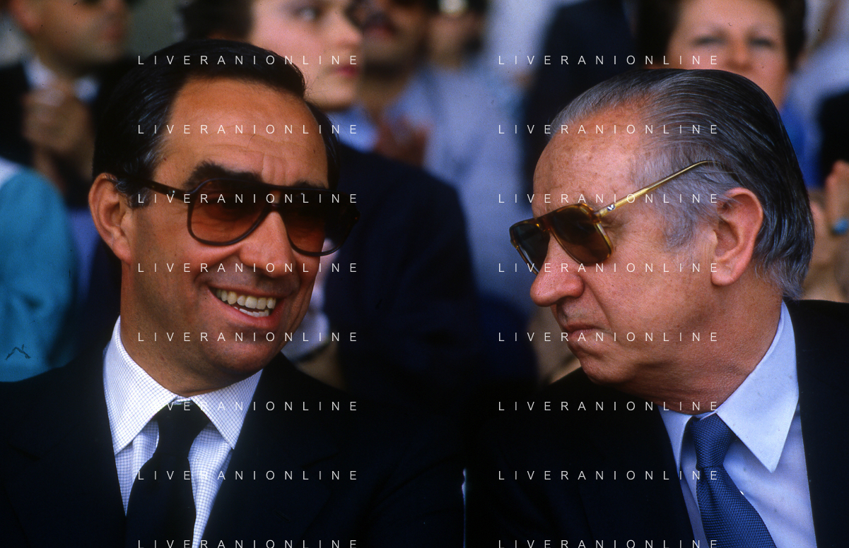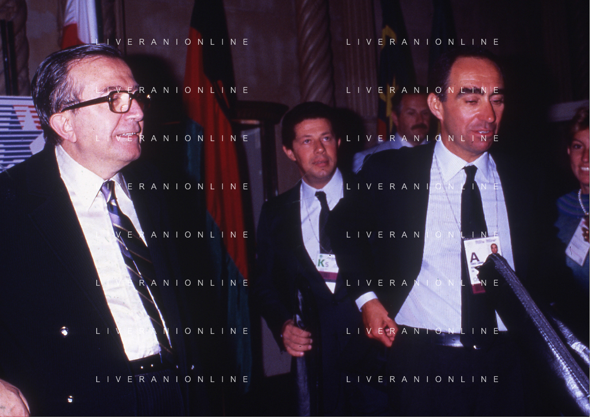 RETROSPETTIVA FRANCO CARRARO DIRIGENTE SPORTIVO E POLITICO NELLA FOTO FRANCO CARRARO NELL'ANNO 1987 A MILANO CON GIANNI DE MICHELIS AG ALDO LIVERANI SAS