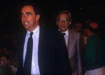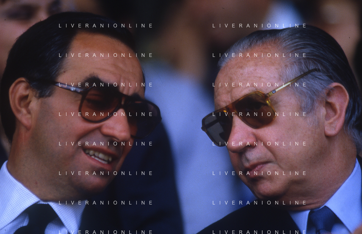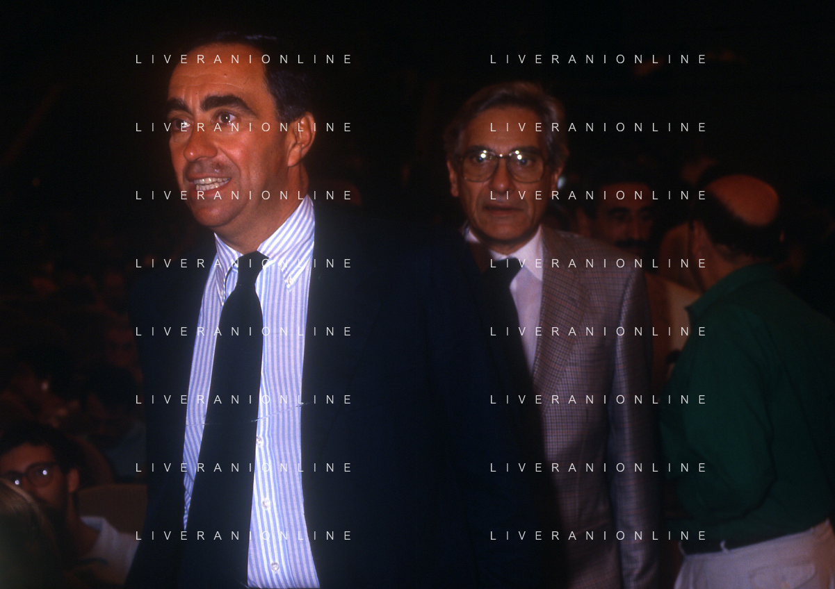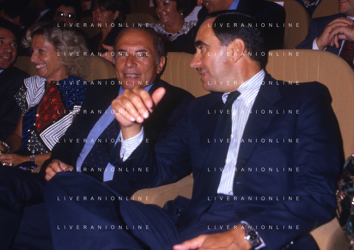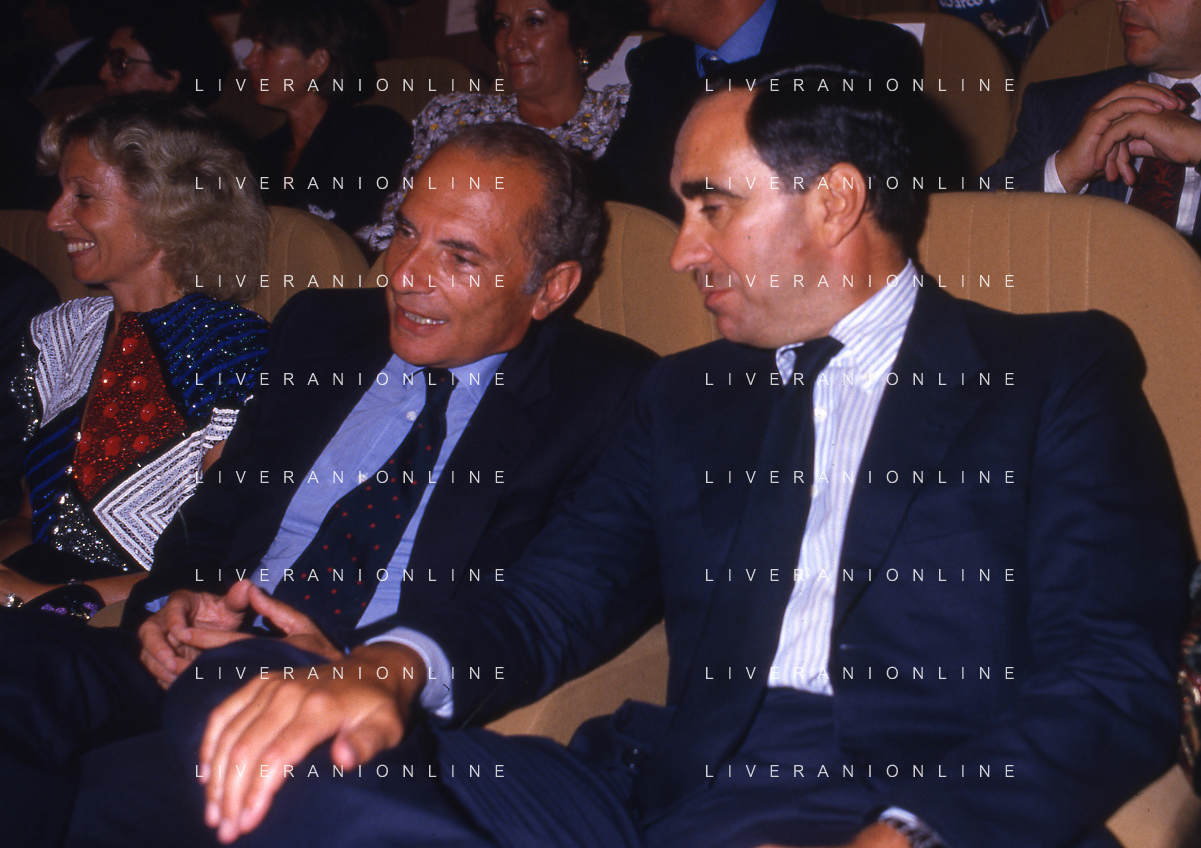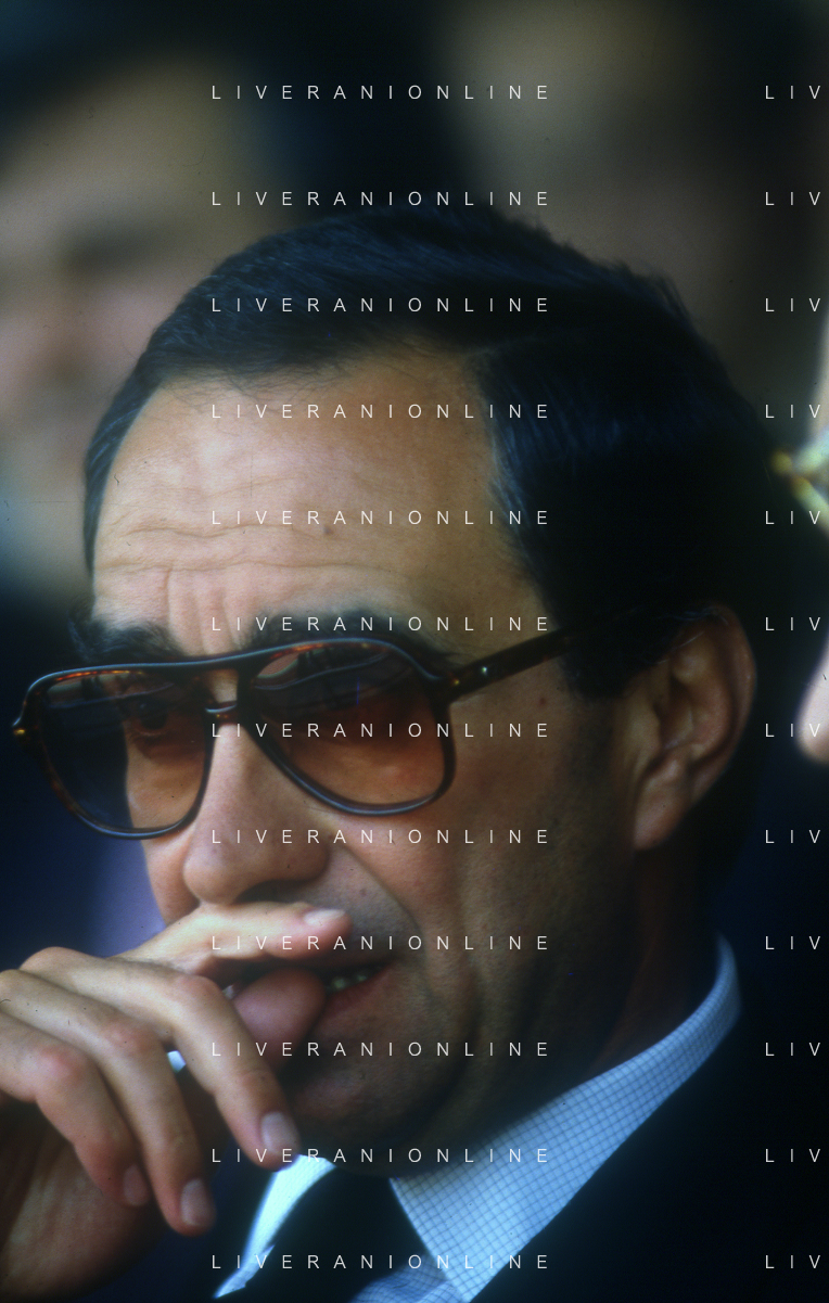 RETROSPETTIVA FRANCO CARRARO DIRIGENTE SPORTIVO E POLITICO NELLA FOTO FRANCO CARRARO NELL'ANNO 1987 A MILANO CON GIANNI DE MICHELIS AG ALDO LIVERANI SAS