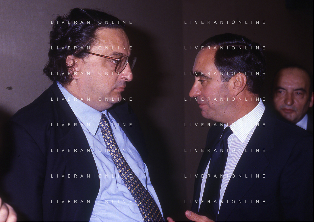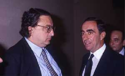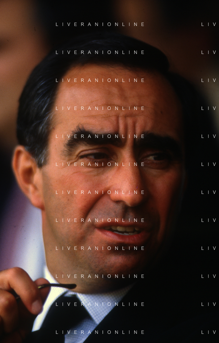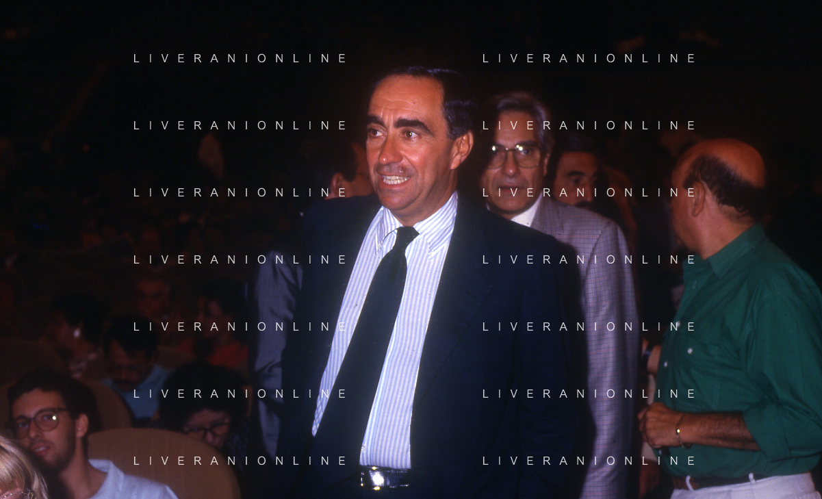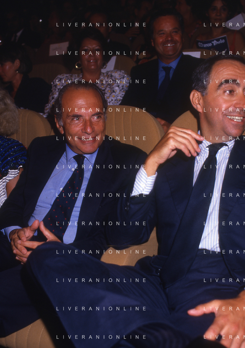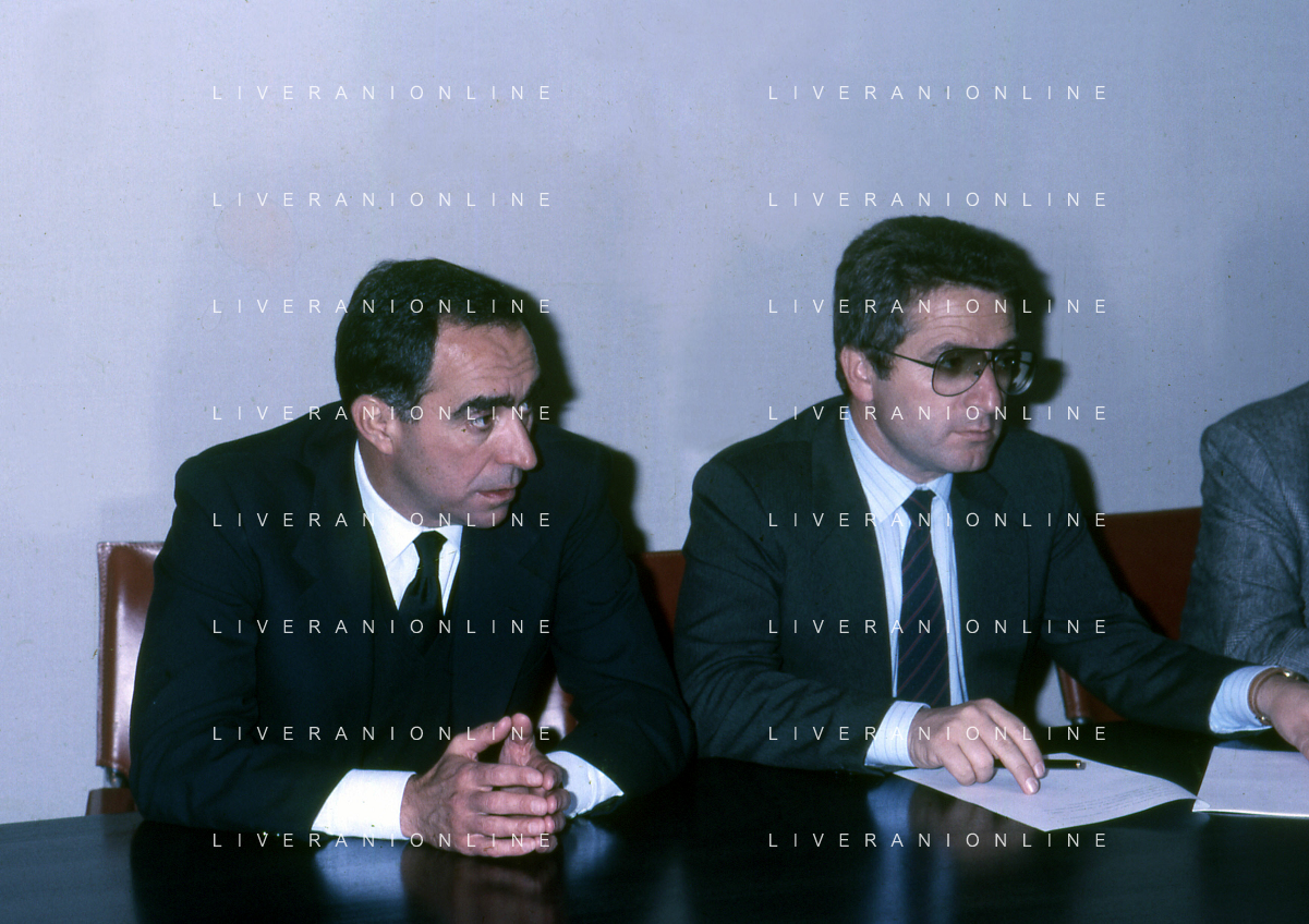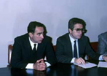 RETROSPETTIVA FRANCO CARRARO DIRIGENTE SPORTIVO E POLITICO NELLA FOTO FRANCO CARRARO NELL'ANNO 1987 A MILANO CON GIANNI DE MICHELIS AG ALDO LIVERANI SAS