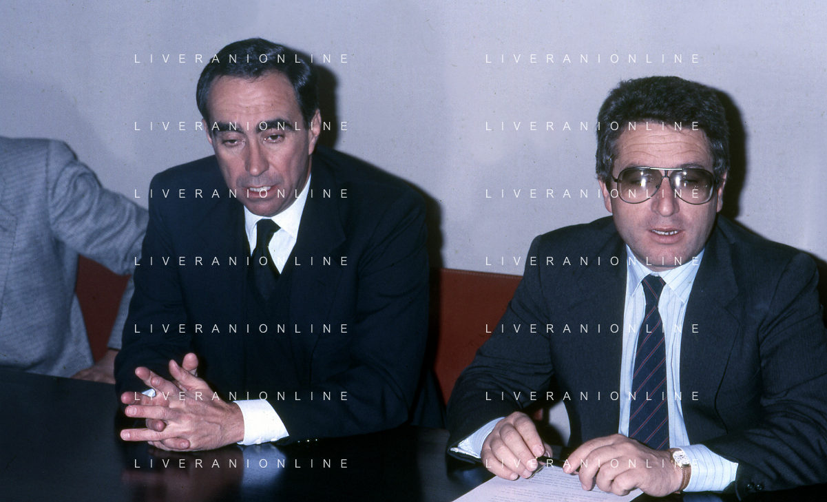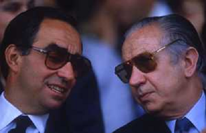 RETROSPETTIVA FRANCO CARRARO DIRIGENTE SPORTIVO E POLITICO NELLA FOTO FRANCO CARRARO NELL'ANNO 1986 A MILANO CON ANTONIO MATARRESE AG ALDO LIVERANI SAS