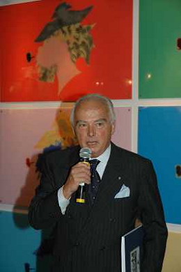 Genova, 15/06/06 Inaugurazione della mostra 'Semper uniti in gloria. I sessant'anni della Sampdoria' Nella foto: Il Presidente Riccardo Garrone posa davanti alla parete con il simbolo della Societa' blucerchiata stilizzato ed in vari colori ph a