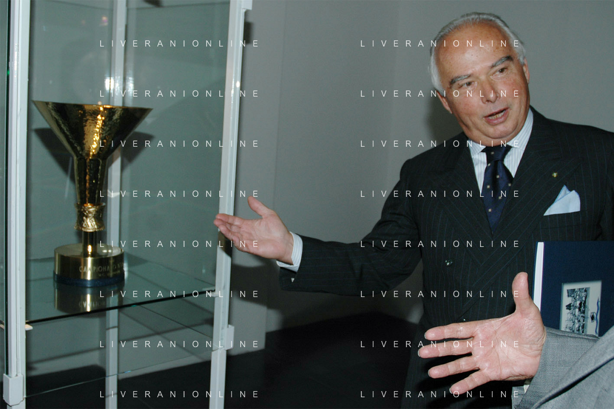 Genova, 15/06/06 Inaugurazione della mostra 'Semper uniti in gloria. I sessant'anni della Sampdoria' Nella foto: Il Presidente Riccardo Garrone indica la coppa vinta nel 1991, in occasione della conquista del primo ed unico scudetto vinto dalla