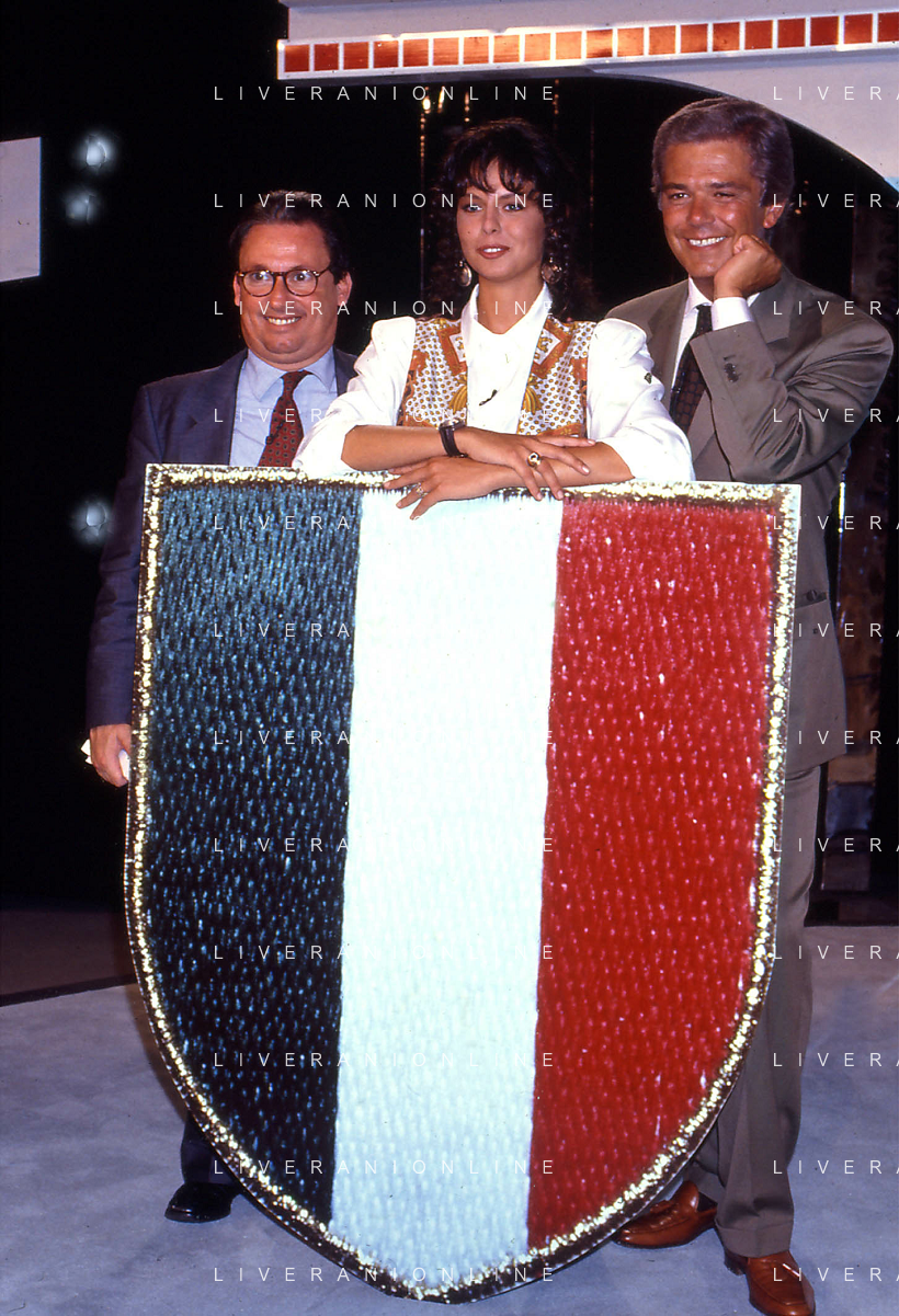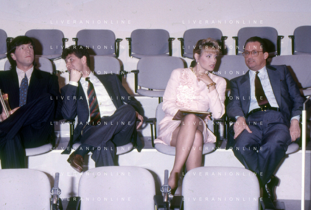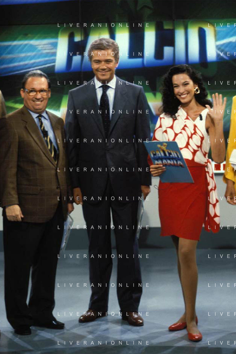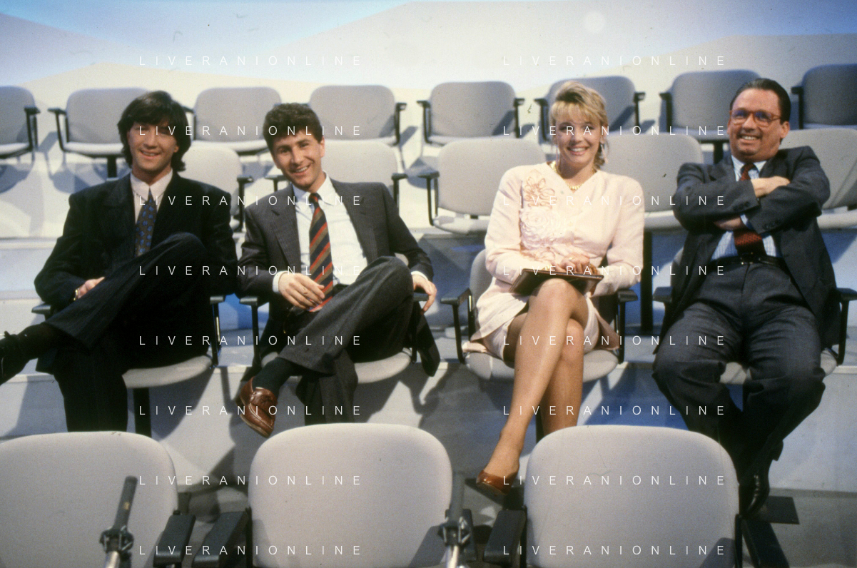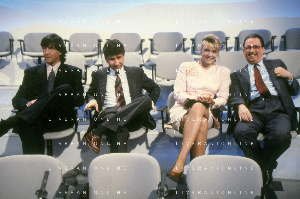 DIAP-RETROSPETTIVA MAURIZIO MOSCA GIORNALISTA NELLA FOTO MAURIZIO MOSCA CON FABIO FAZIO ROBERTA TERMALI E WALTER ZENGA TRASMISSIONE TELEVISIVA “FORZA ITALIA“ NELL'ANNO 1988 A MILANO AG ALDO LIVERANI SAS