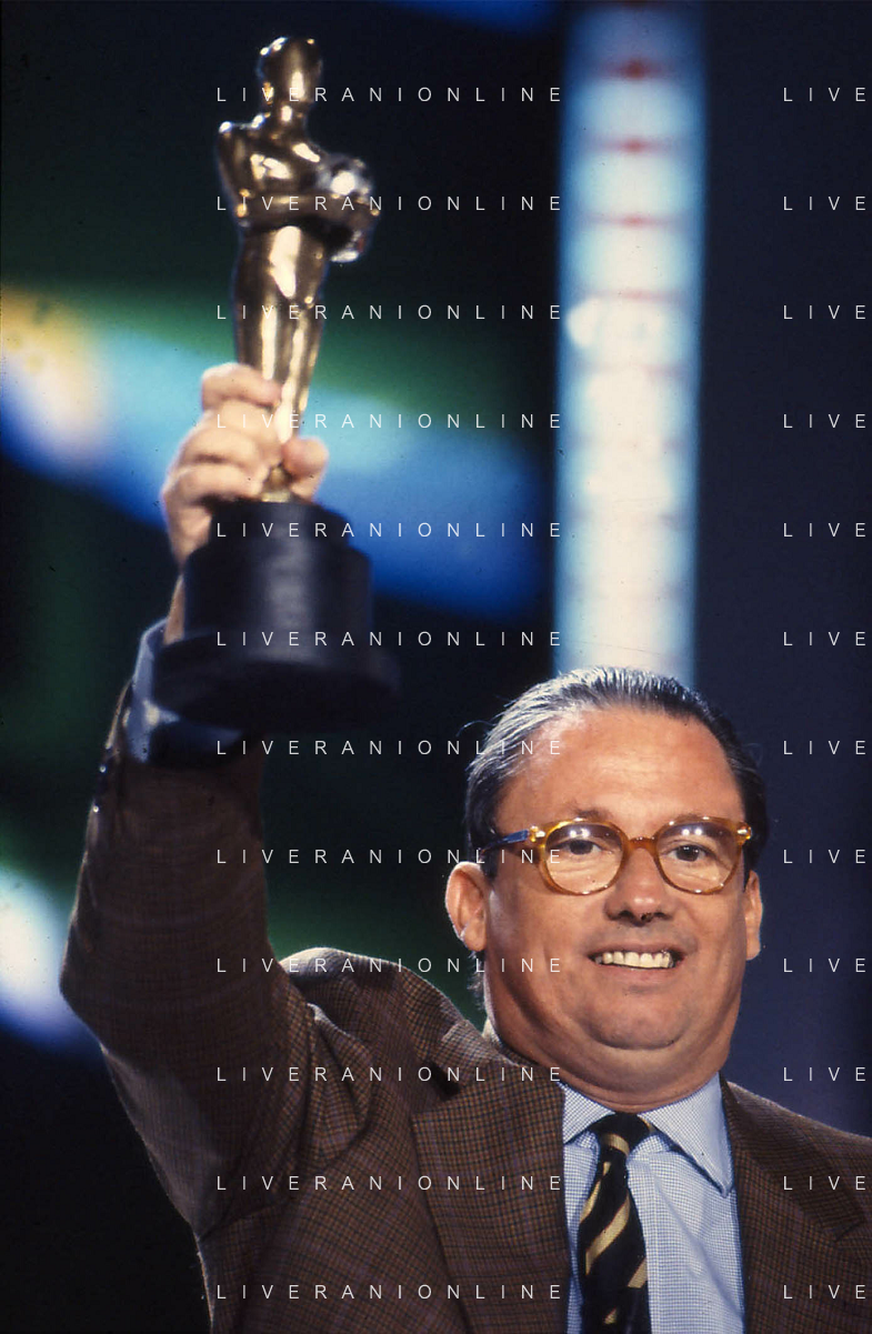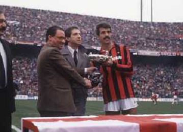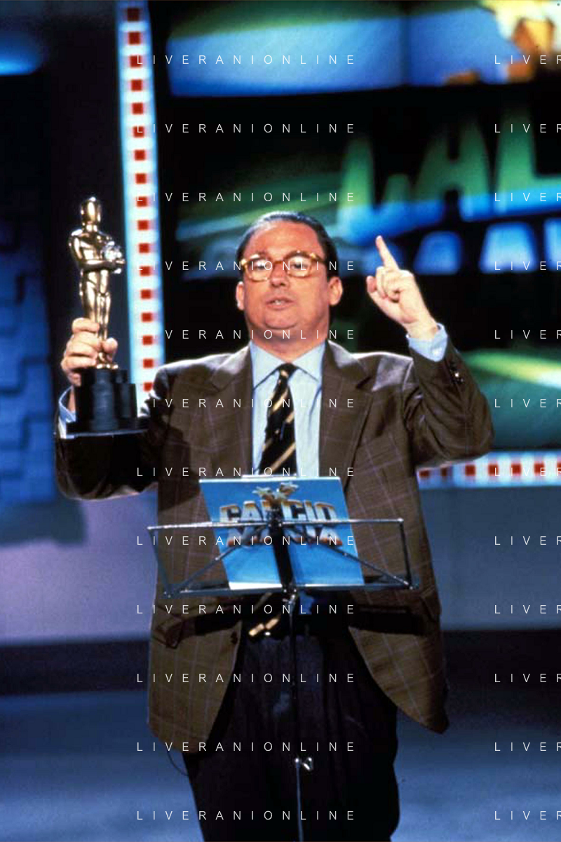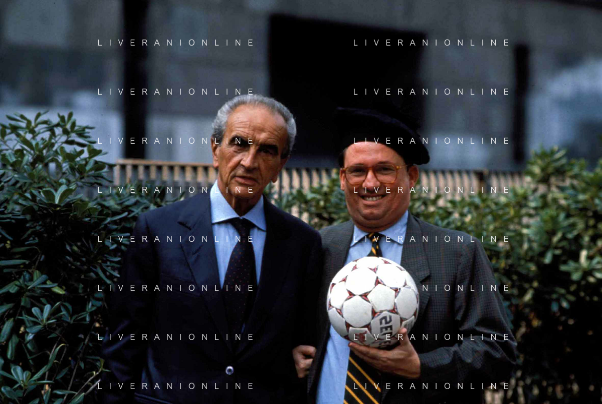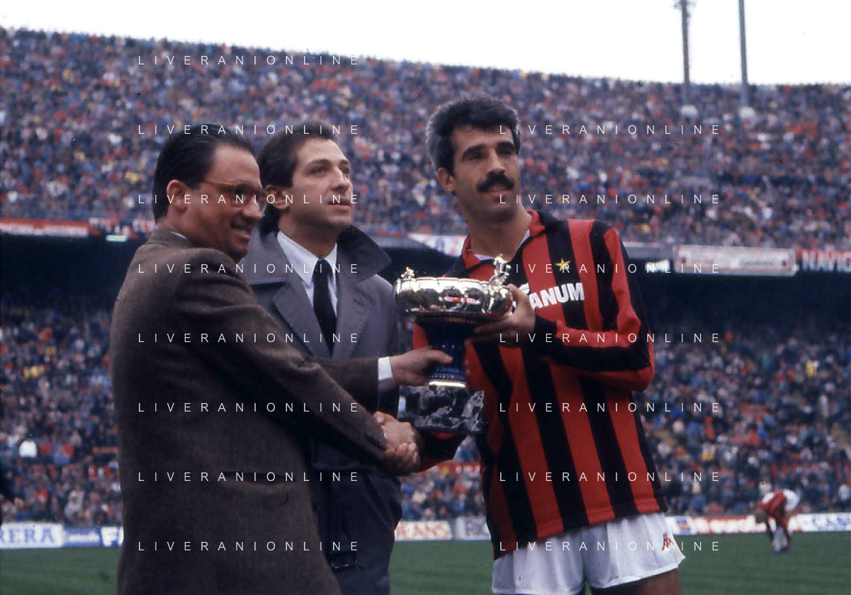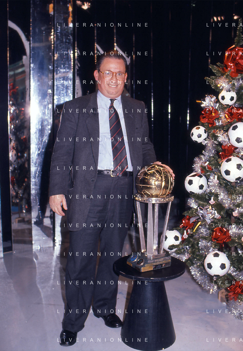 DIAP-RETROSPETTIVA MAURIZIO MOSCA GIORNALISTA NELLA FOTO MAURIZIO MOSCA PREMIA PIETRO PAOLO VIRDIS CON PAOLO BERLUSCONI NELL'ANNO 1987 A SAN SIRO AG ALDO LIVERANI SAS