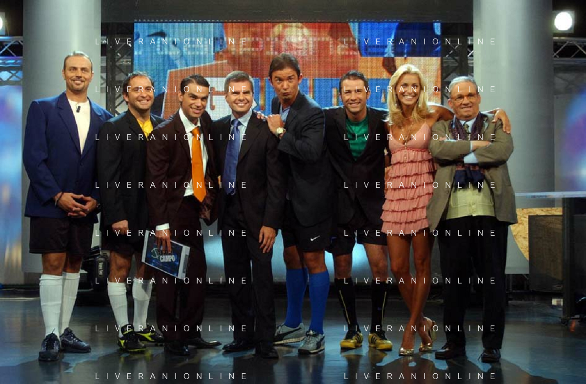 MILANO, 11 SETTEMBRE 2005 TRASMISSIONE "GUIDA AL CAMPIONATO " - TUTTE LE DOMENICHE ALLE 13 SU ITALIA UNO NELLA FOTO : ALBERTO BRANDI, FEDERICA FONTANA, MAURIZIO MOSCA, I TURBOLENTI E ANDREA PERRONI © CODEX/ALDO LIVERANI