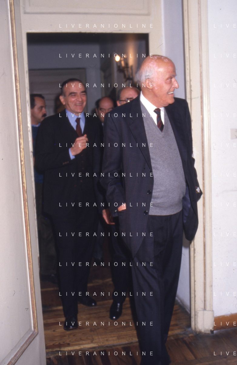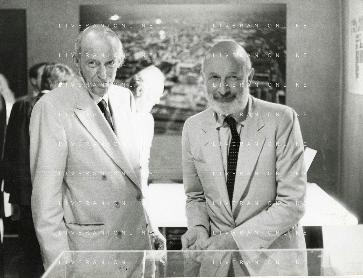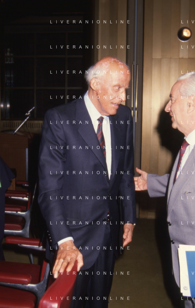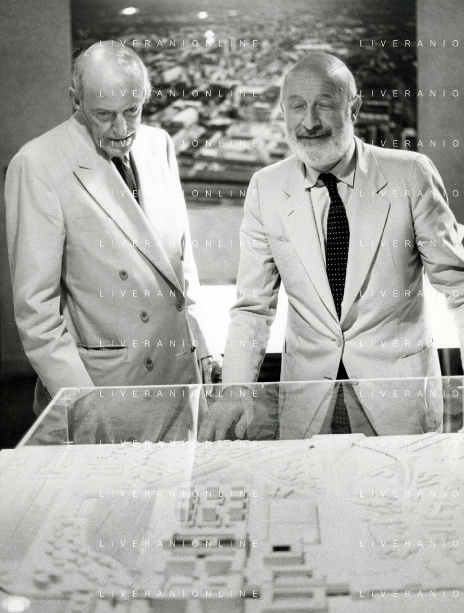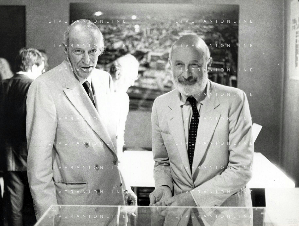 ST-RETROSPETTIVA LEOPOLDO PIRELLI INDUSTRIALE NELLA FOTO LEOPOLDO PIRELLI NELL'ANNO 1988 A MILANO CON VITTORIO GREGOTTI AG ALDO LIVERANI SAS