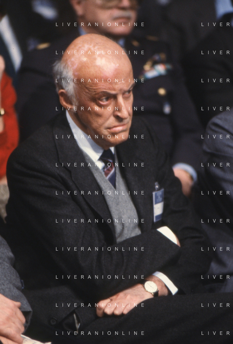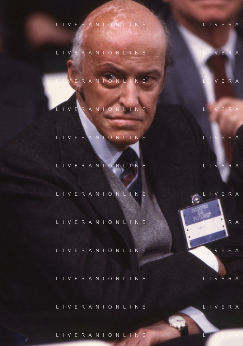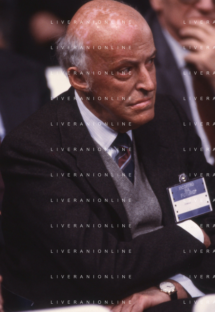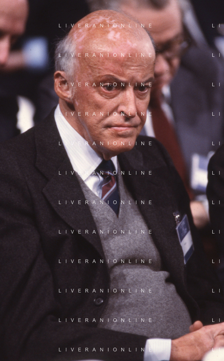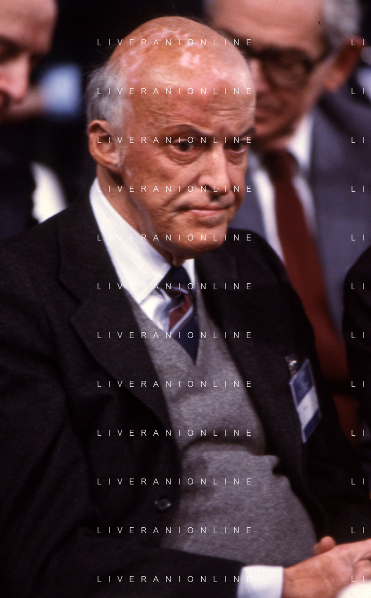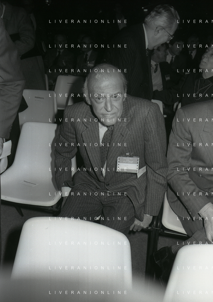 RETROSPETTIVA LEOPOLDO PIRELLI INDUSTRIALE NELLA FOTO LEOPOLDO PIRELLI PRESENZIA A UN CONVEGNO A MILANO DI CONFINDUSTRIA NELL'ANNO 1984 AG ALDO LIVERANI SAS