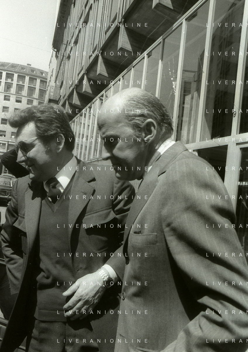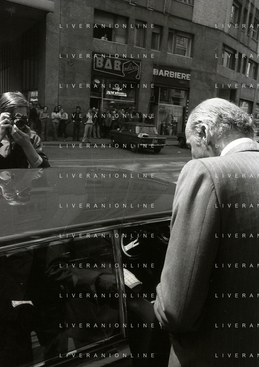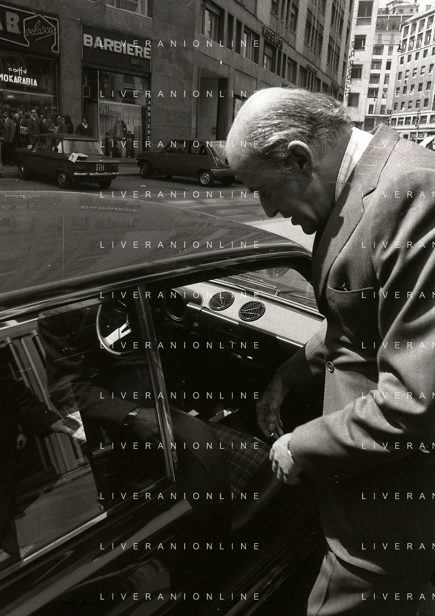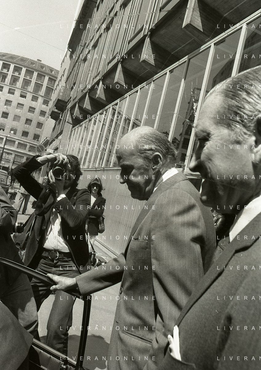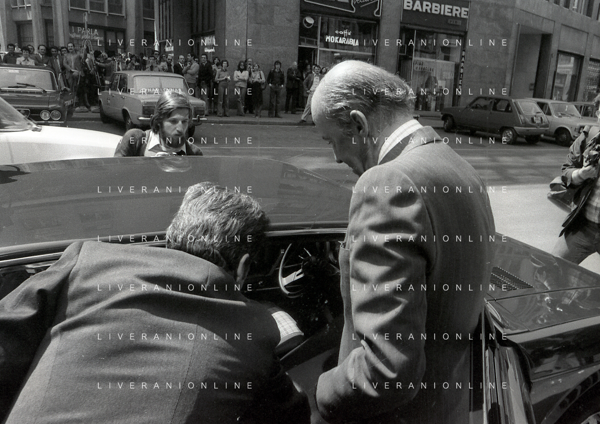 RETROSPETTIVA LEOPOLDO PIRELLI INDUSTRIALE NELLA FOTO LEOPOLDO PIRELLI ALL'USCITA IN VIA PANTANO DA ASSOLOMBARDA NELL'ANNO 1976 AG ALDO LIVERANI SAS