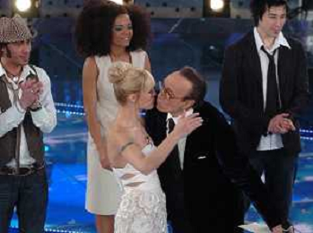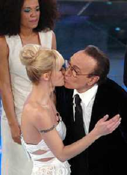 SAN REMO 27/2/2007 57∞ FESTIVAL DELLA CANZONE ITALIANA NELLA FOTO MICHELLE HUNZIKER E PIPPO BAUDO SI BACIANO ALLA FINE DELLA TRASMISSIONE FOTO AG ALDO LIVERANI