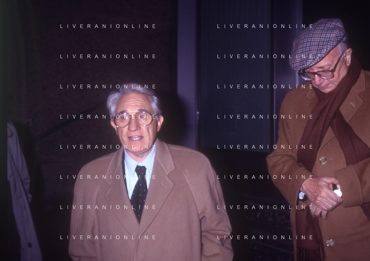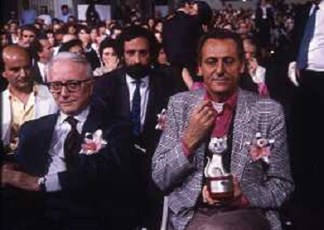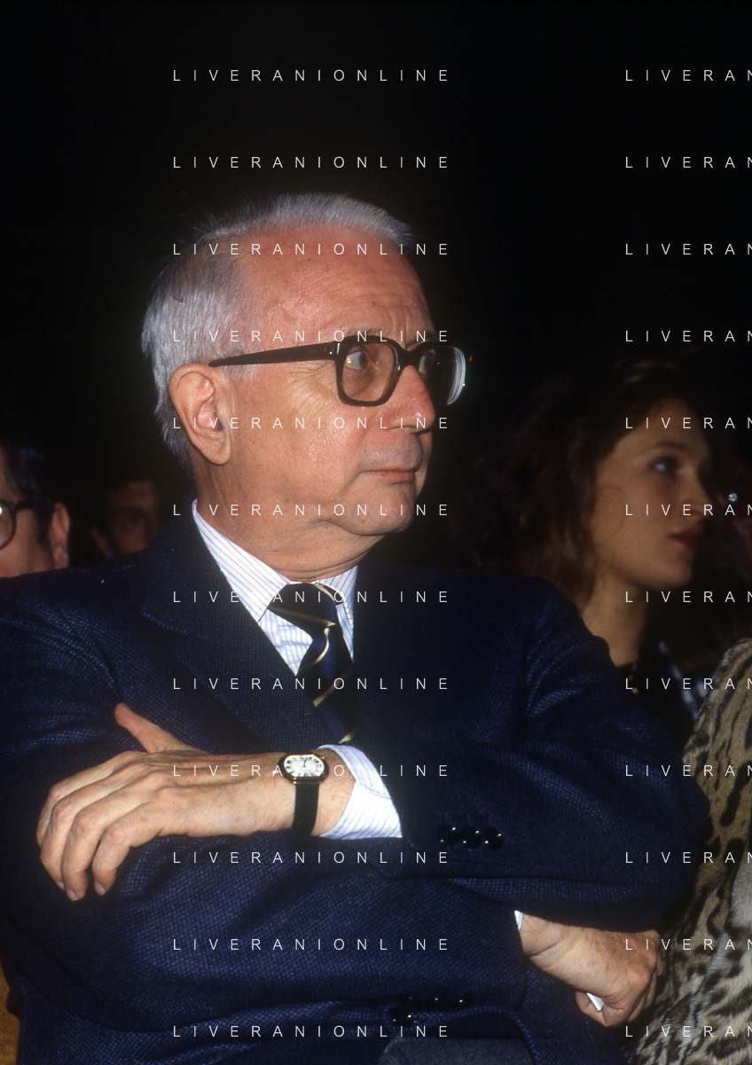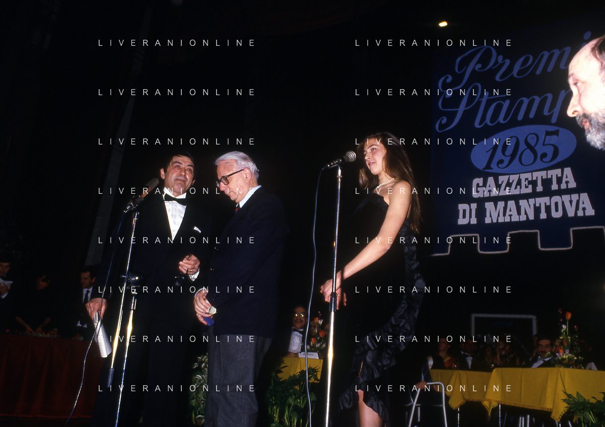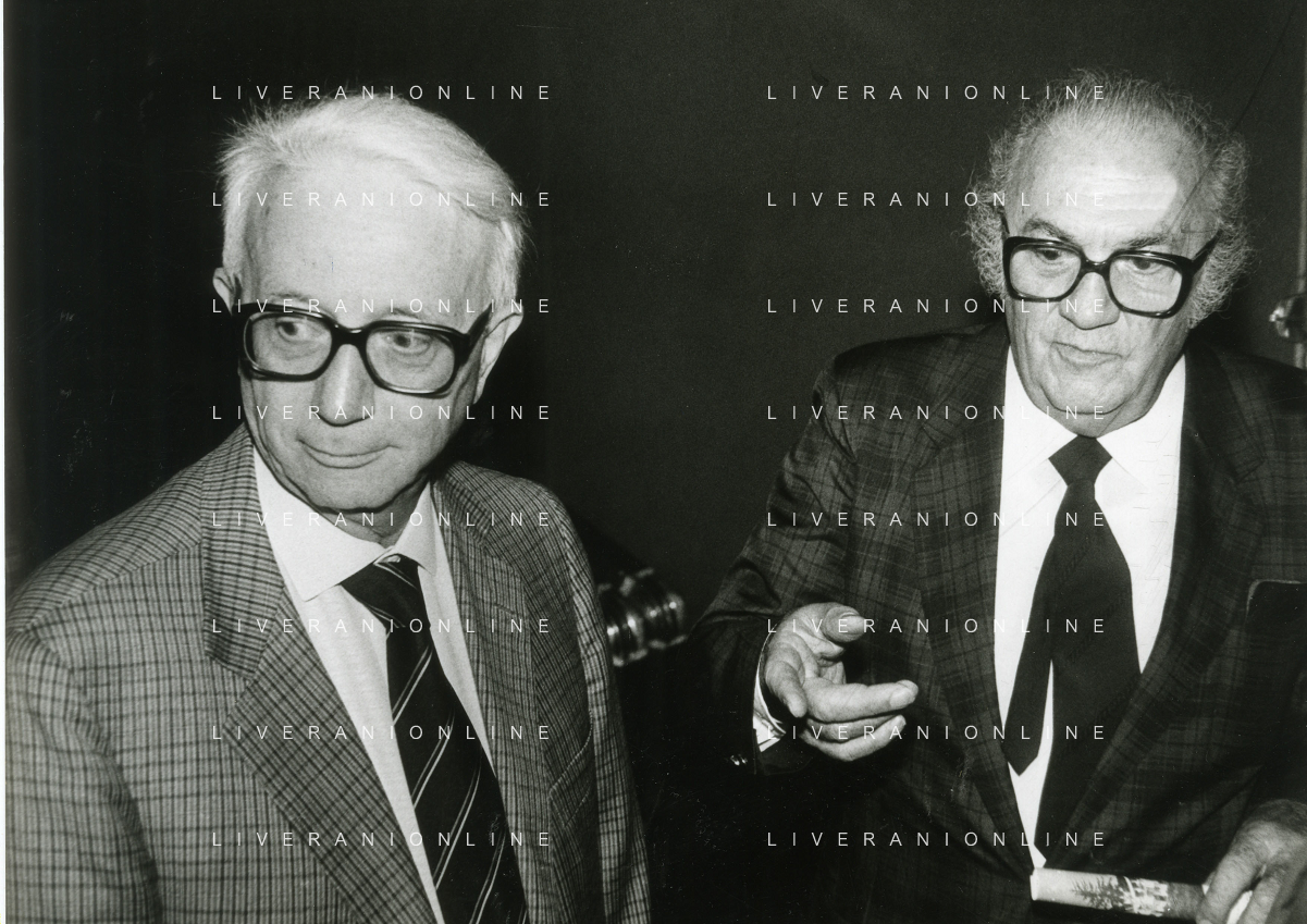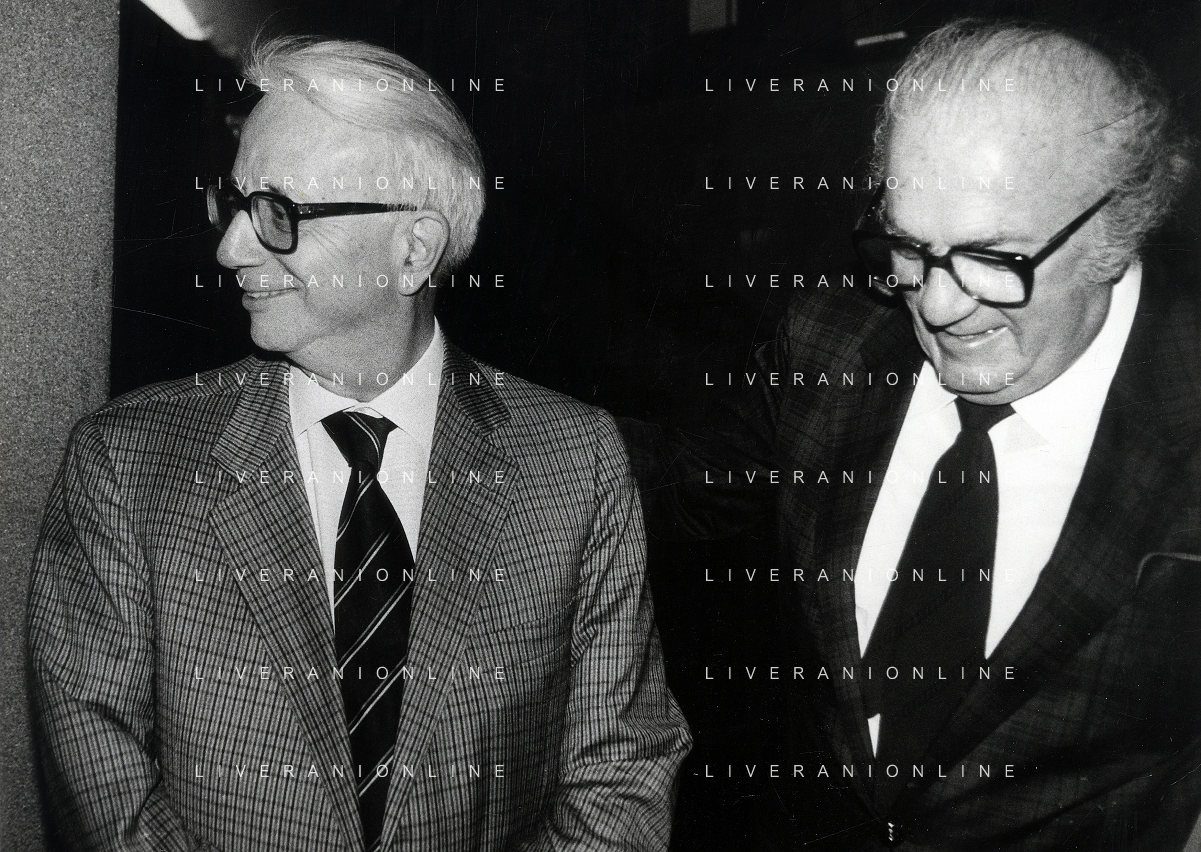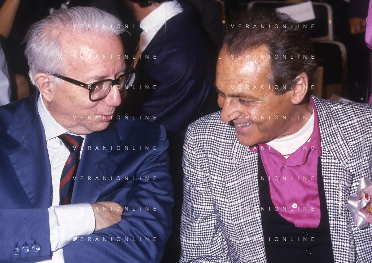 RETROSPETTIVA ENZO BIAGI GIORNALISTA E SCRITTORE E CONDUTTORE TELEVISIVO NELLA FOTO ENZO BIAGI NELL'ANNO 1985 AL PREMIO REGIA TELEVISIVA CON GIANFRANCO FERRE' AG ALDO LIVERANI SAS