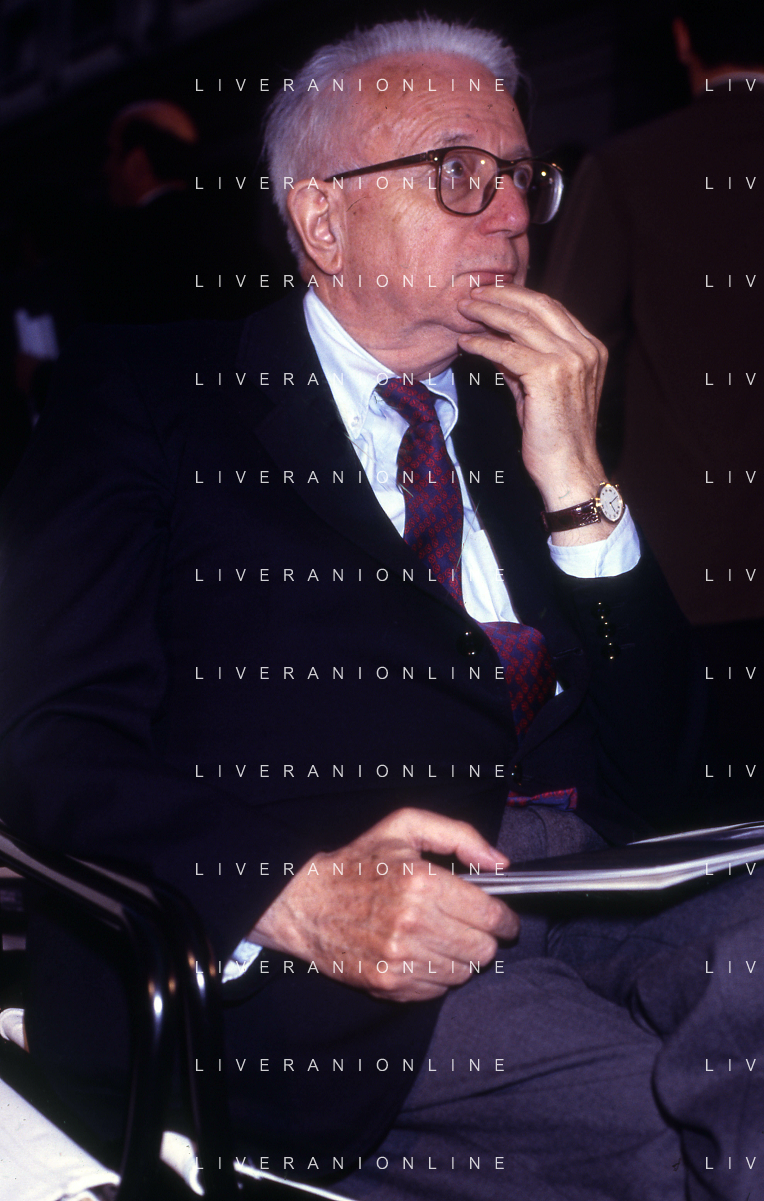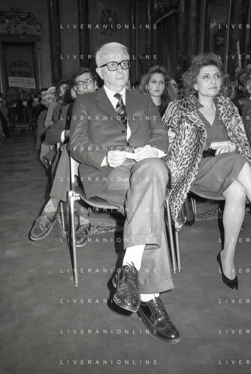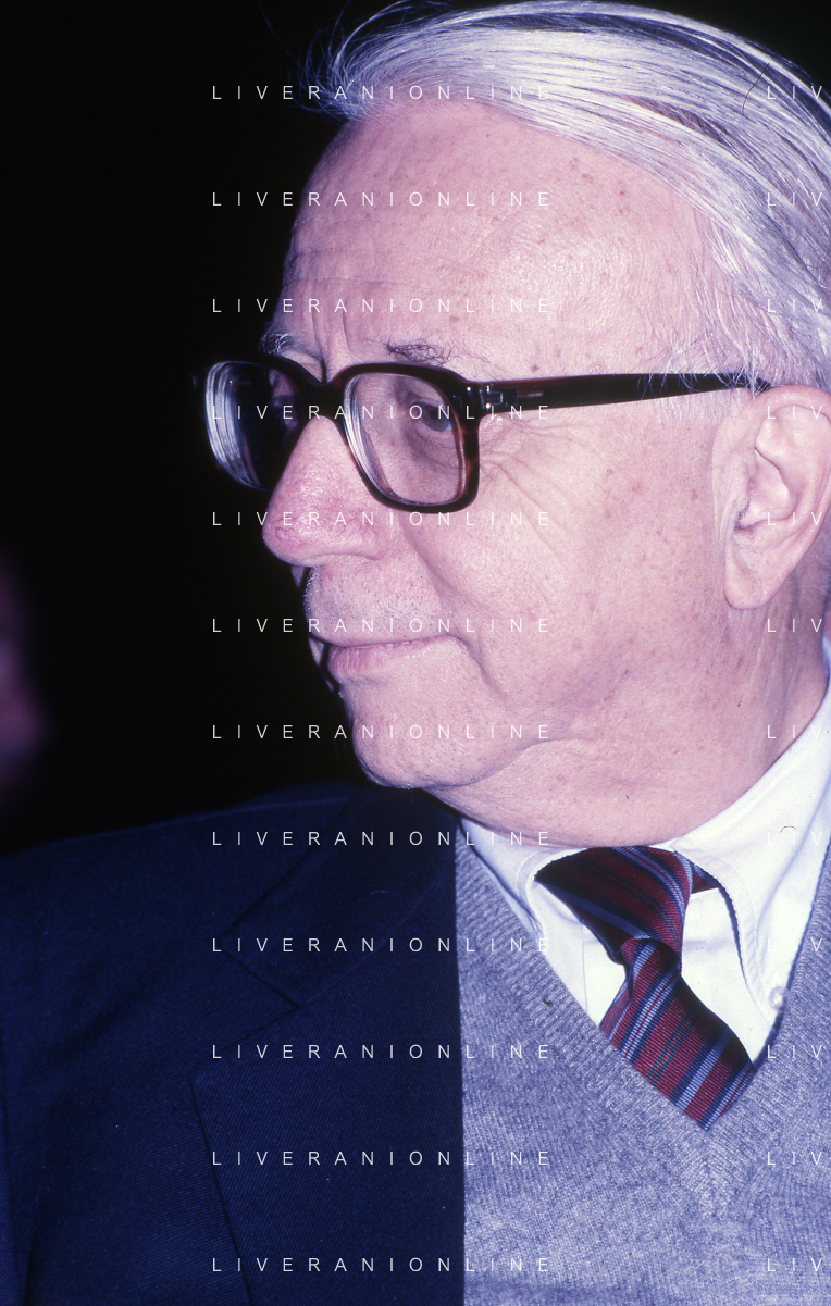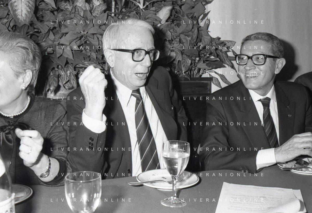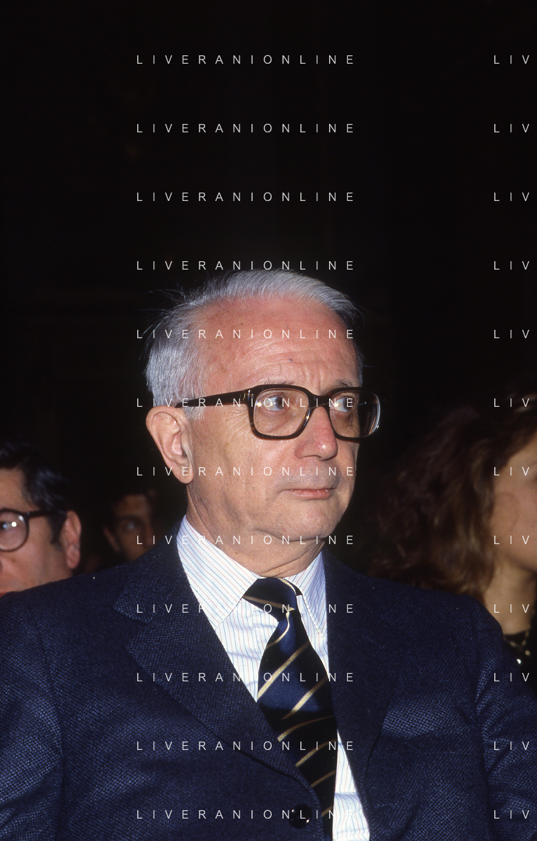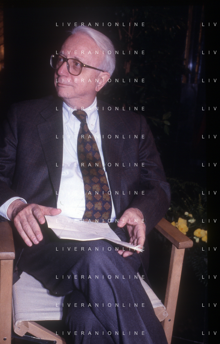 RETROSPETTIVA ENZO BIAGI GIORNALISTA E SCRITTORE E CONDUTTORE TELEVISIVO NELLA FOTO ENZO BIAGI NELL'ANNO 1985 AL PREMIO REGIA TELEVISIVA CON GIANFRANCO FERRE' AG ALDO LIVERANI SAS