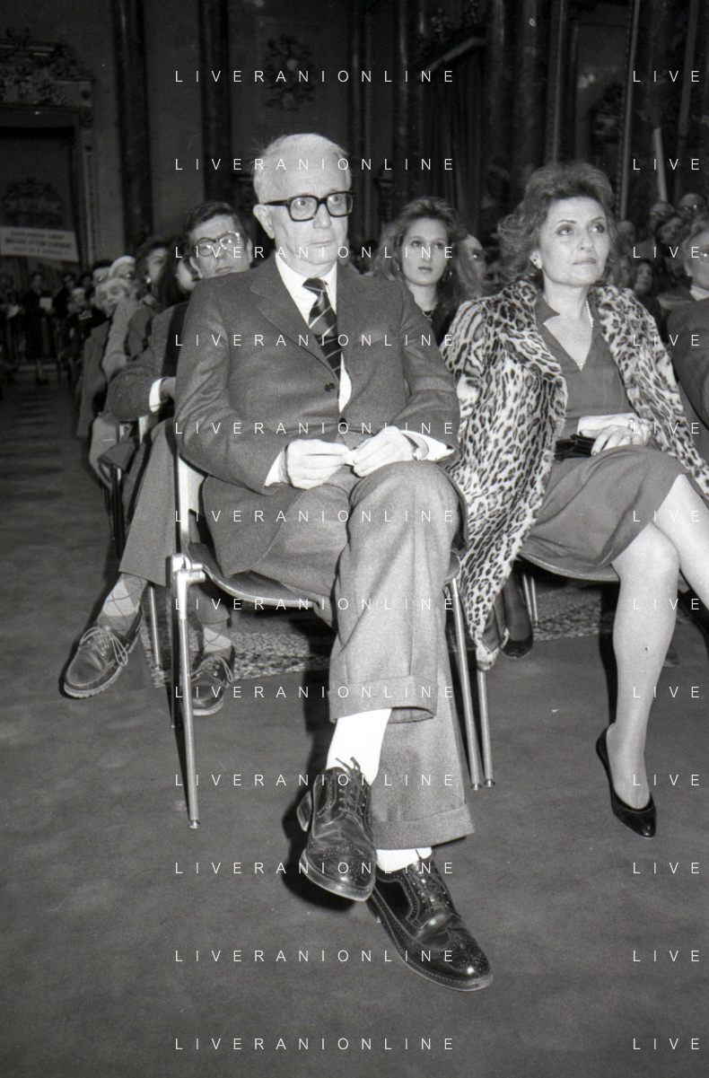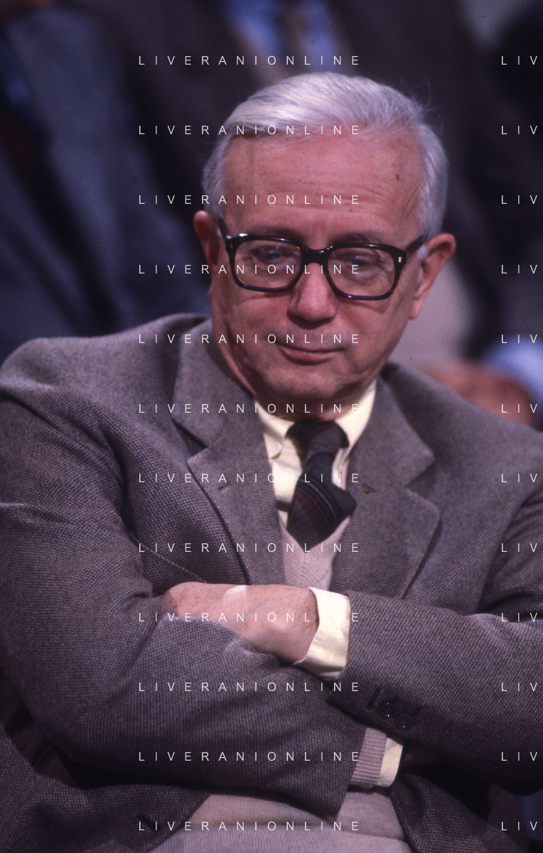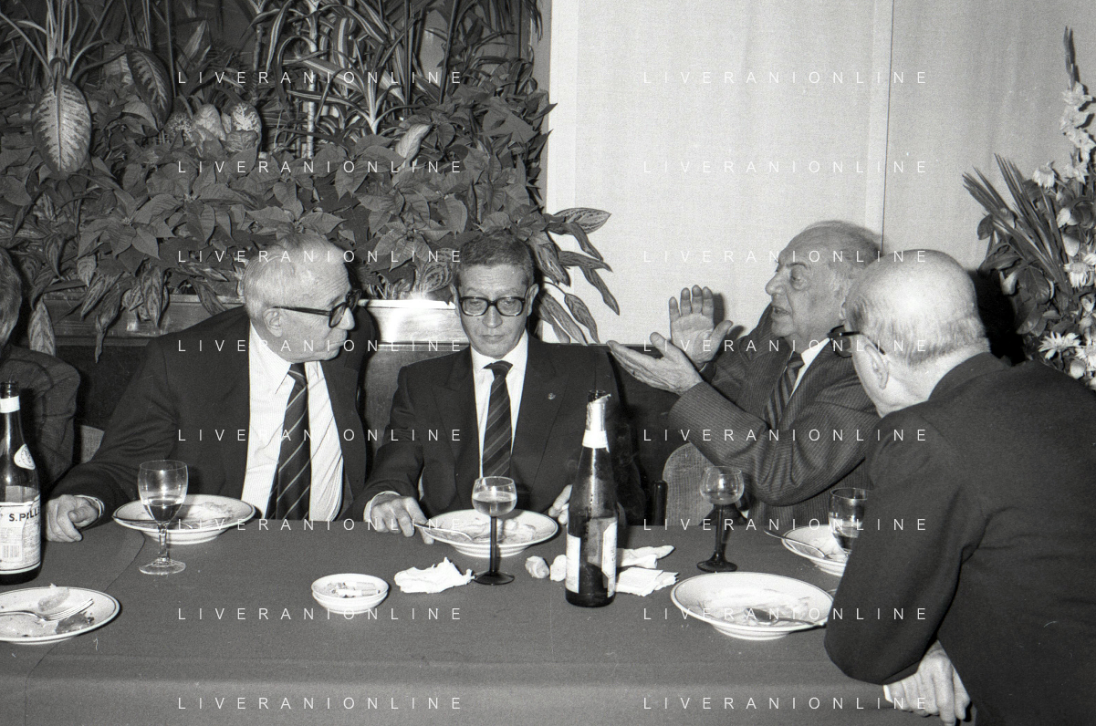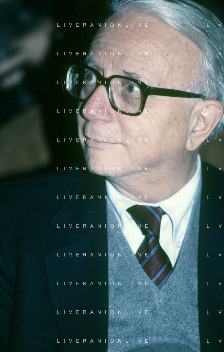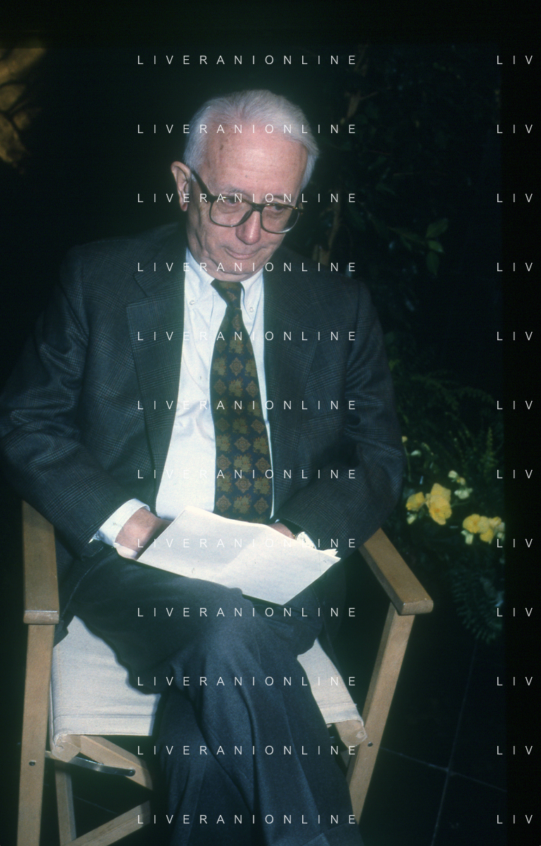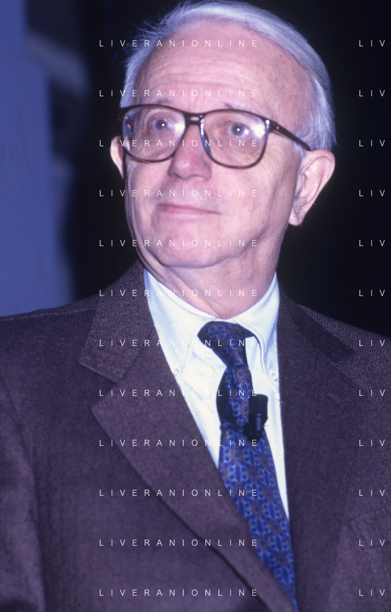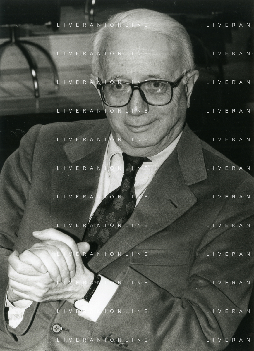 RETROSPETTIVA ENZO BIAGI GIORNALISTA E SCRITTORE E CONDUTTORE TELEVISIVO NELLA FOTO ENZO BIAGI NELL'ANNO 1985 AL PREMIO REGIA TELEVISIVA CON GIANFRANCO FERRE' AG ALDO LIVERANI SAS