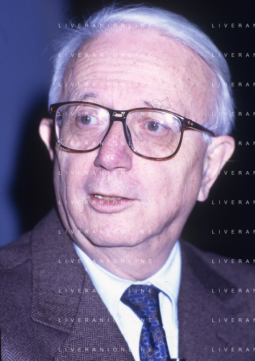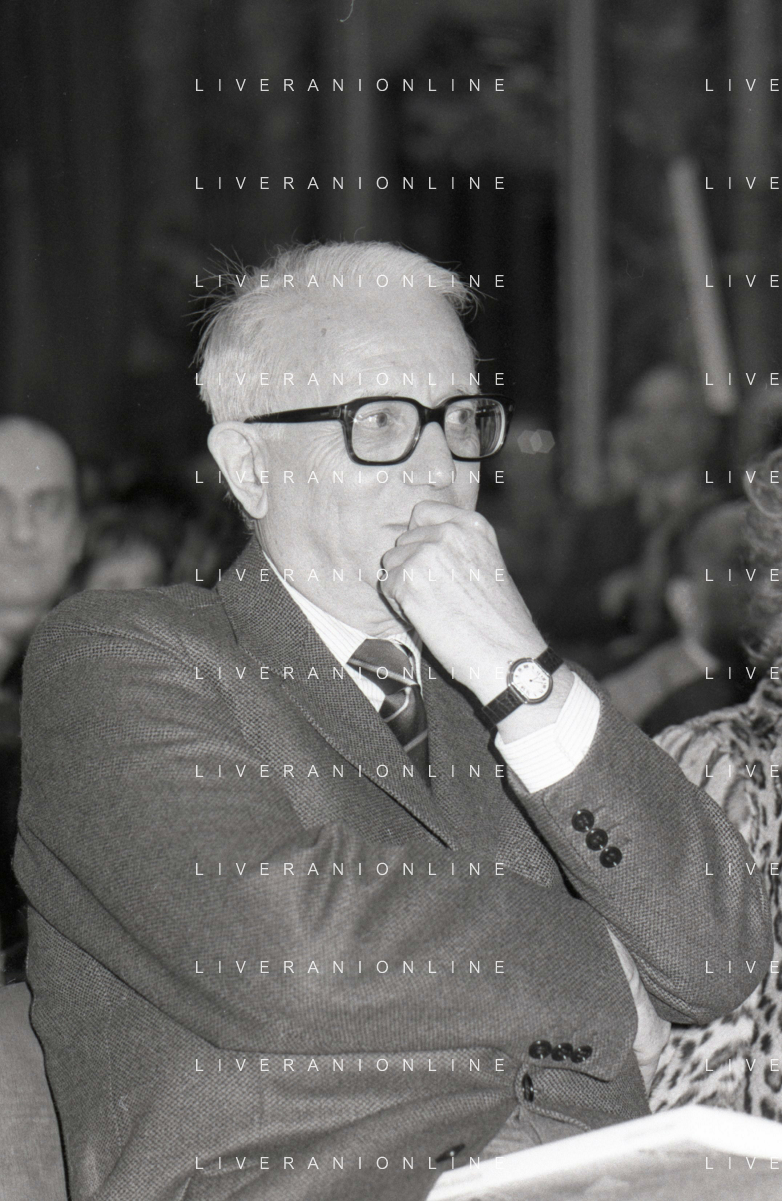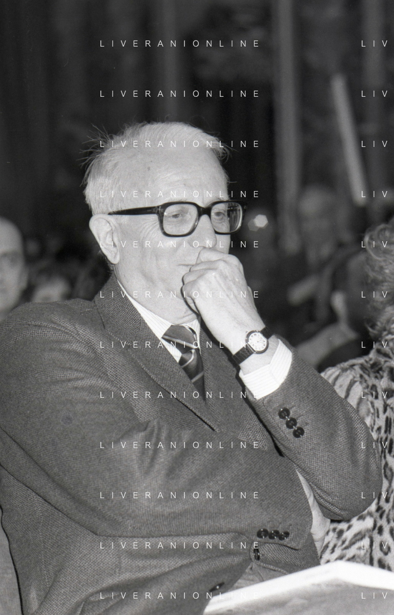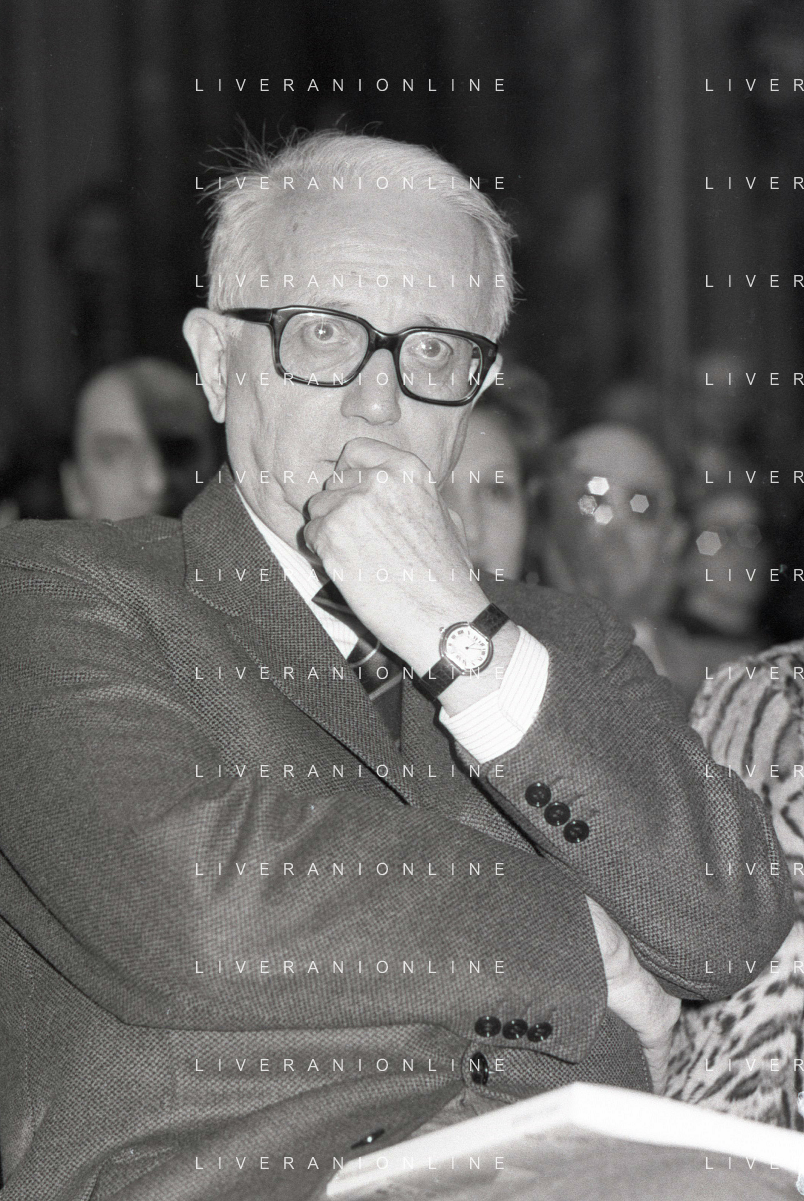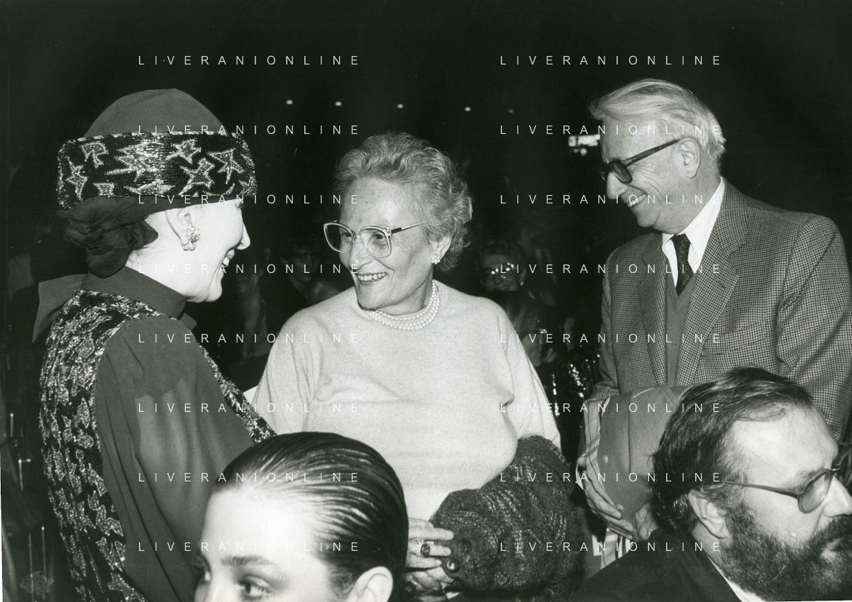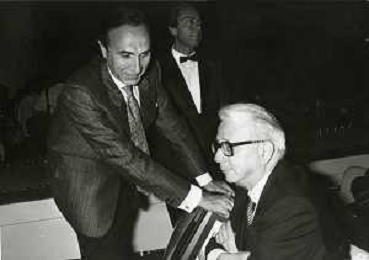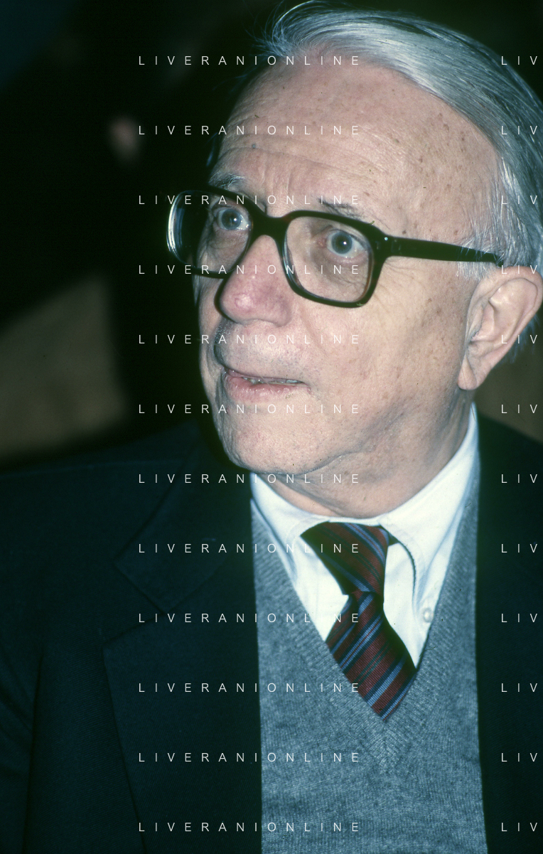 RETROSPETTIVA ENZO BIAGI GIORNALISTA E SCRITTORE E CONDUTTORE TELEVISIVO NELLA FOTO ENZO BIAGI NELL'ANNO 1985 AL PREMIO REGIA TELEVISIVA CON GIANFRANCO FERRE' AG ALDO LIVERANI SAS