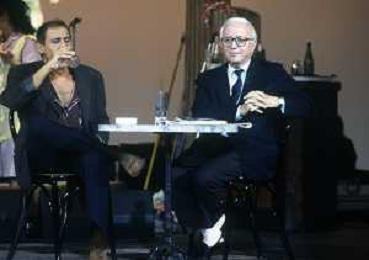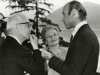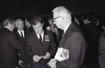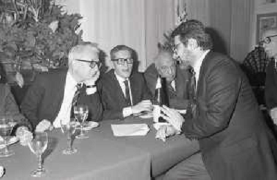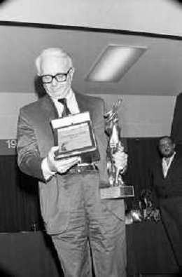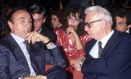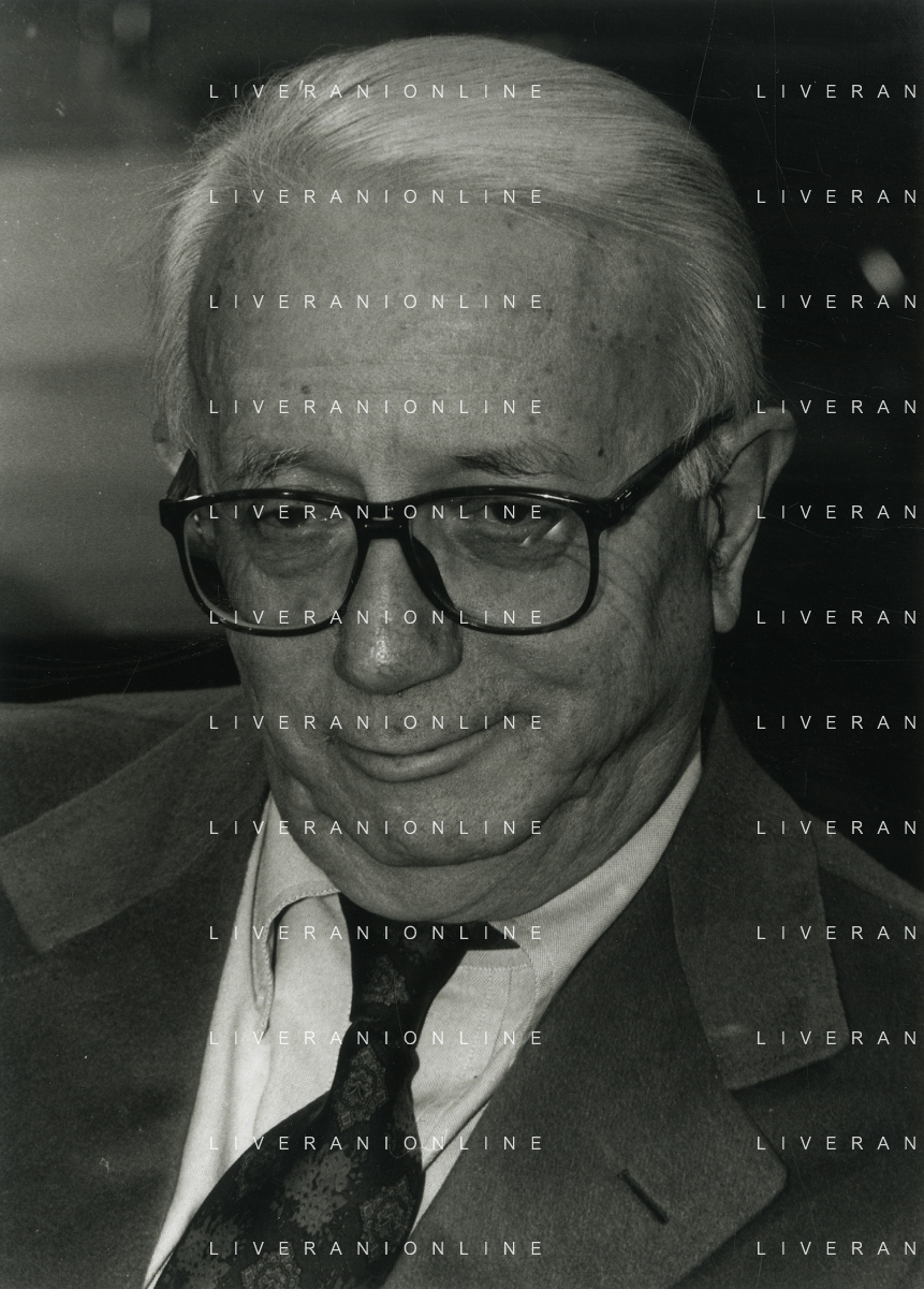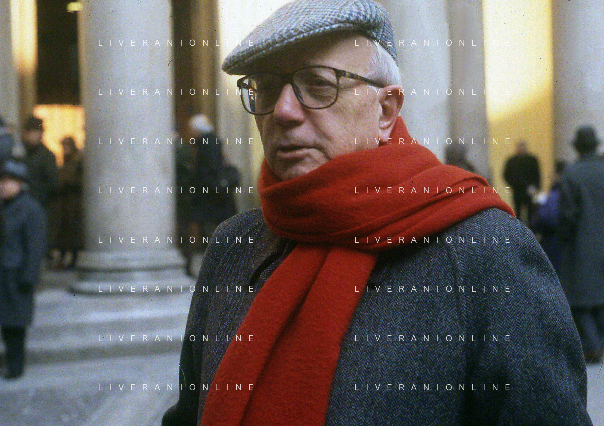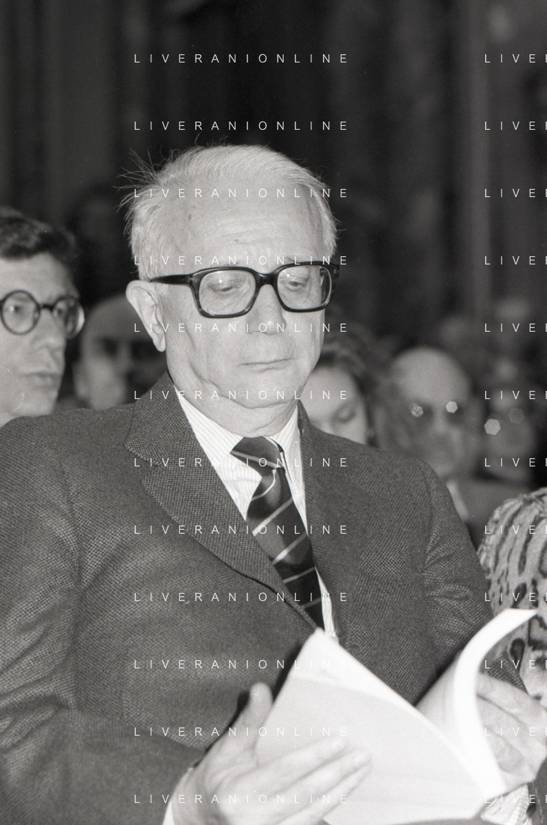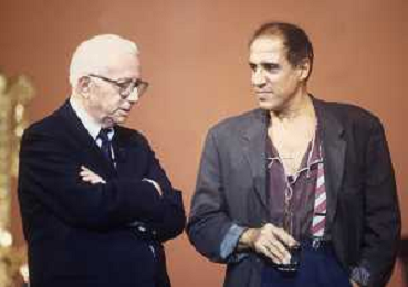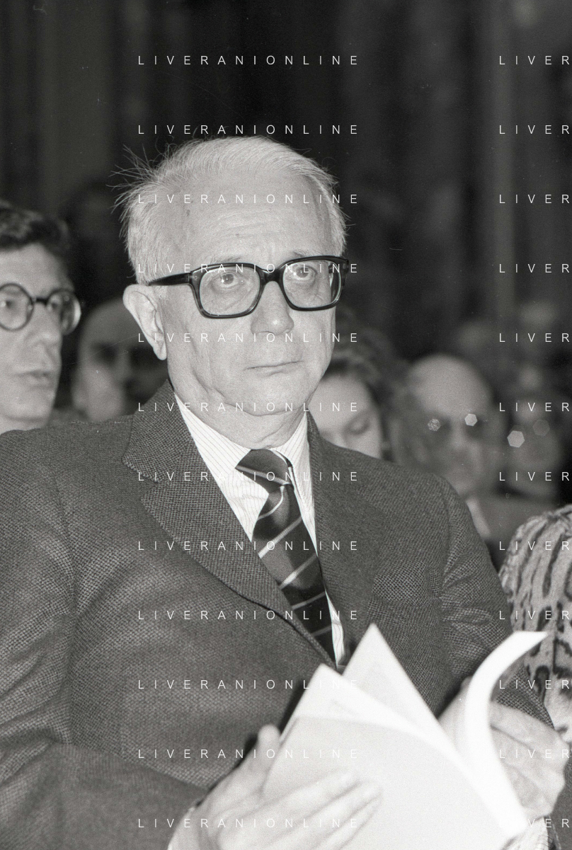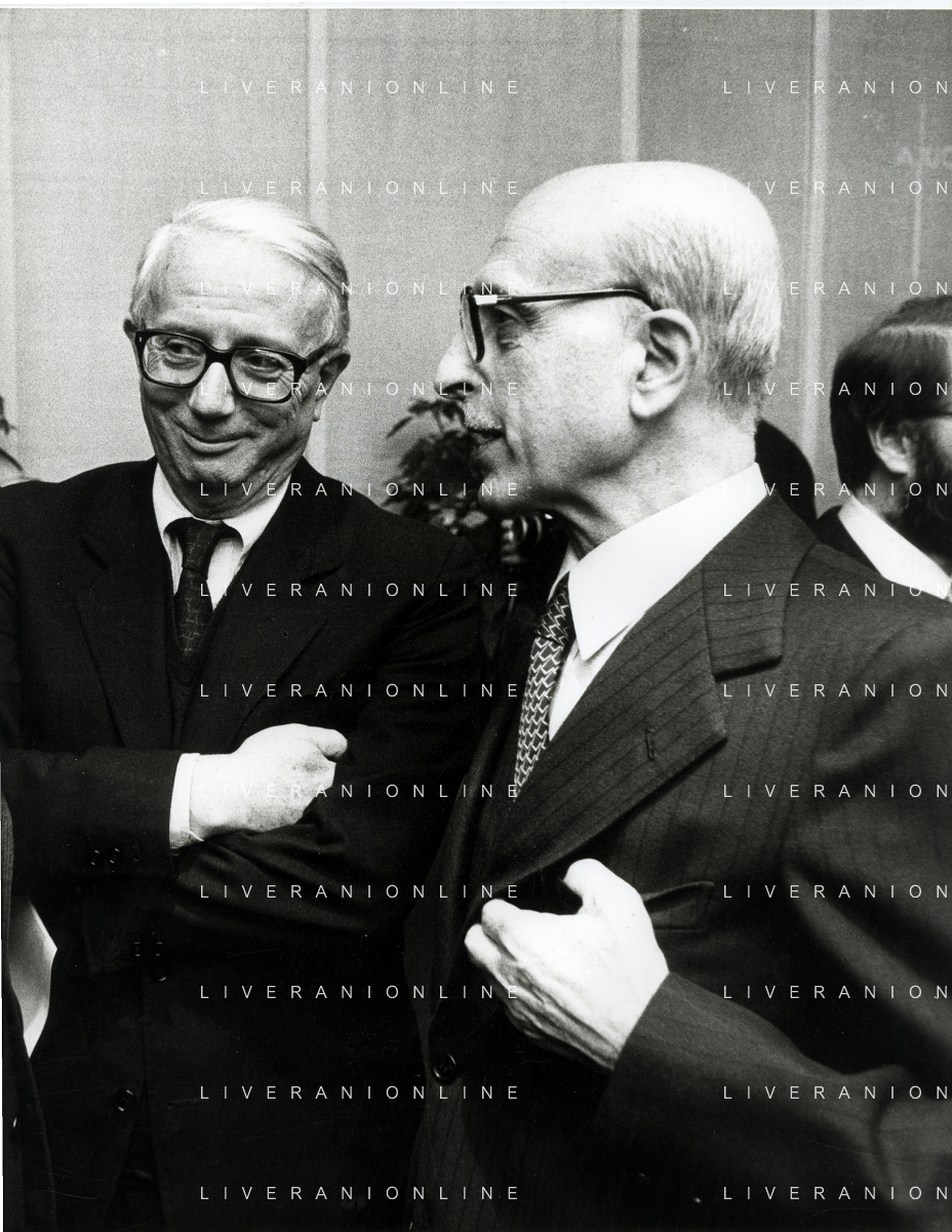 RETROSPETTIVA ENZO BIAGI GIORNALISTA E SCRITTORE E CONDUTTORE TELEVISIVO NELLA FOTO ENZO BIAGI NELL'ANNO 1985 AL PREMIO REGIA TELEVISIVA CON GIANFRANCO FERRE' AG ALDO LIVERANI SAS