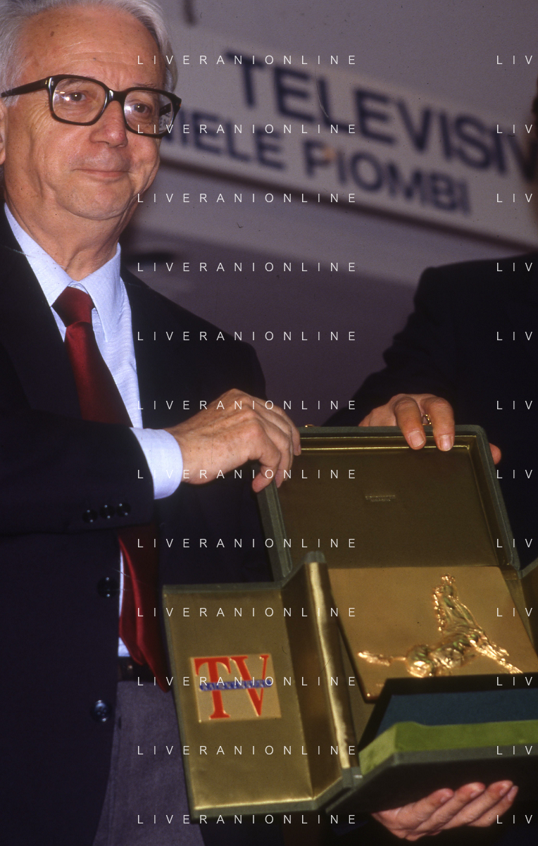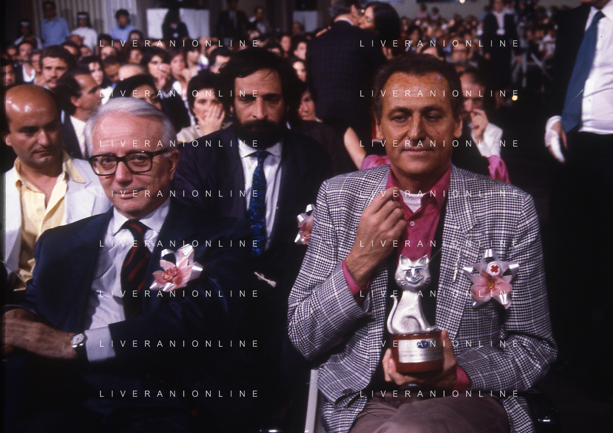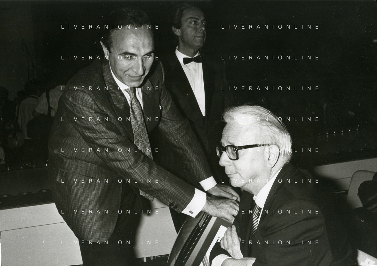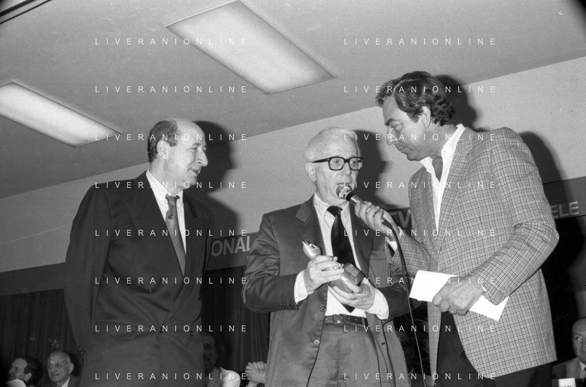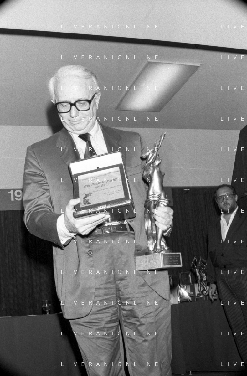 RETROSPETTIVA ENZO BIAGI GIORNALISTA E SCRITTORE E CONDUTTORE TELEVISIVO NELLA FOTO ENZO BIAGI NELL'ANNO 1985 AL PREMIO REGIA TELEVISIVA CON DANIELE PIOMBI E RENZO ARBORE AG ALDO LIVERANI SAS