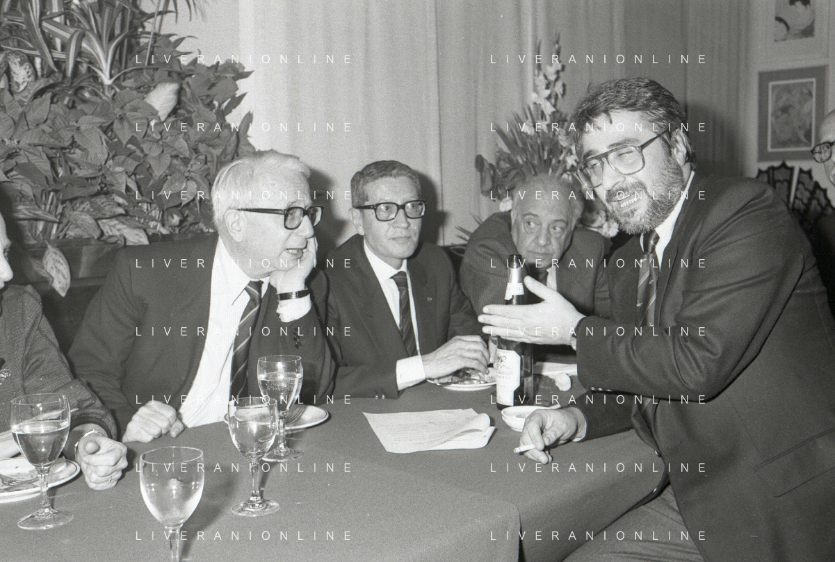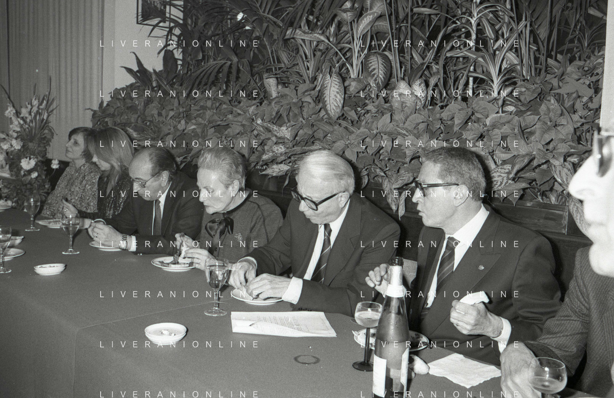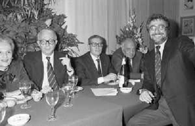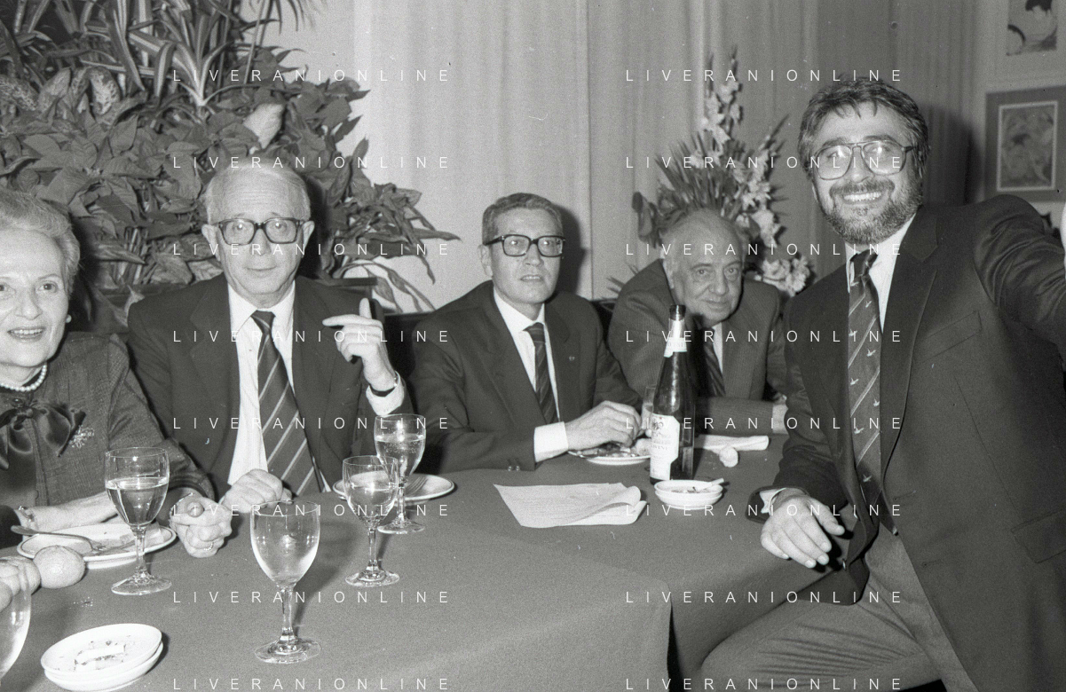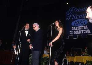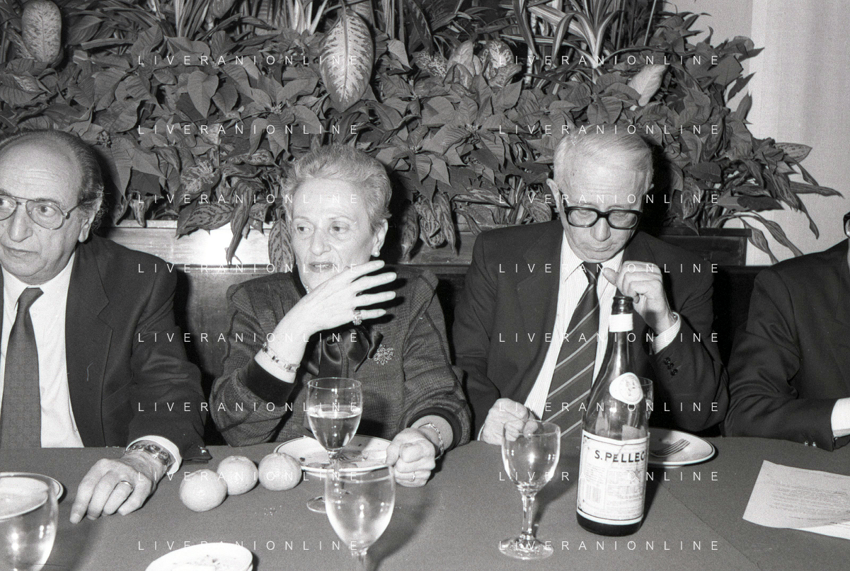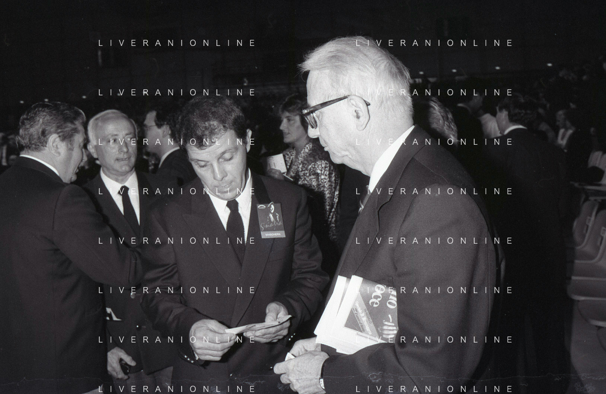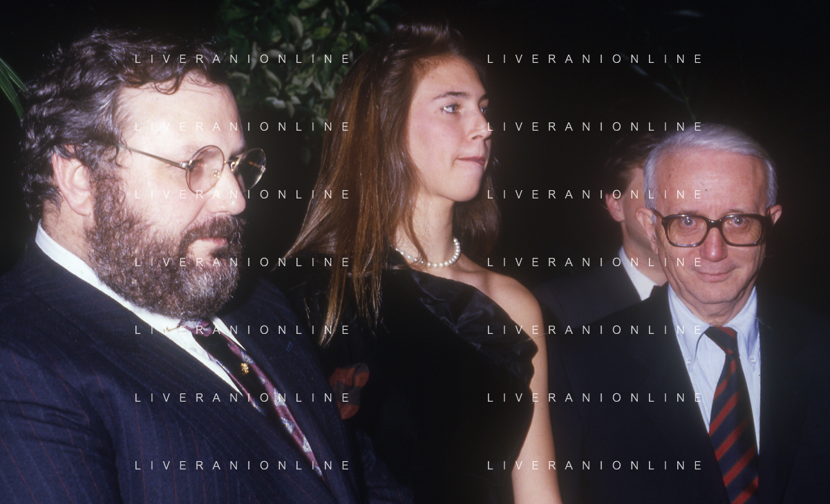 RETROSPETTIVA ENZO BIAGI GIORNALISTA E SCRITTORE E CONDUTTORE TELEVISIVO NELLA FOTO ENZO BIAGI NELL'ANNO 1985 AL PREMIO REGIA TELEVISIVA CON DANIELE PIOMBI E RENZO ARBORE AG ALDO LIVERANI SAS
