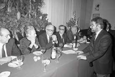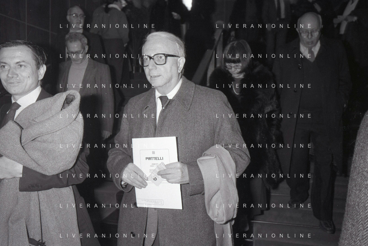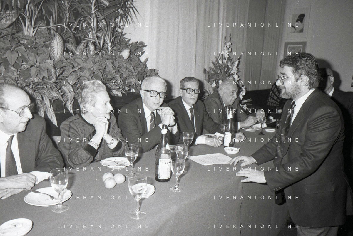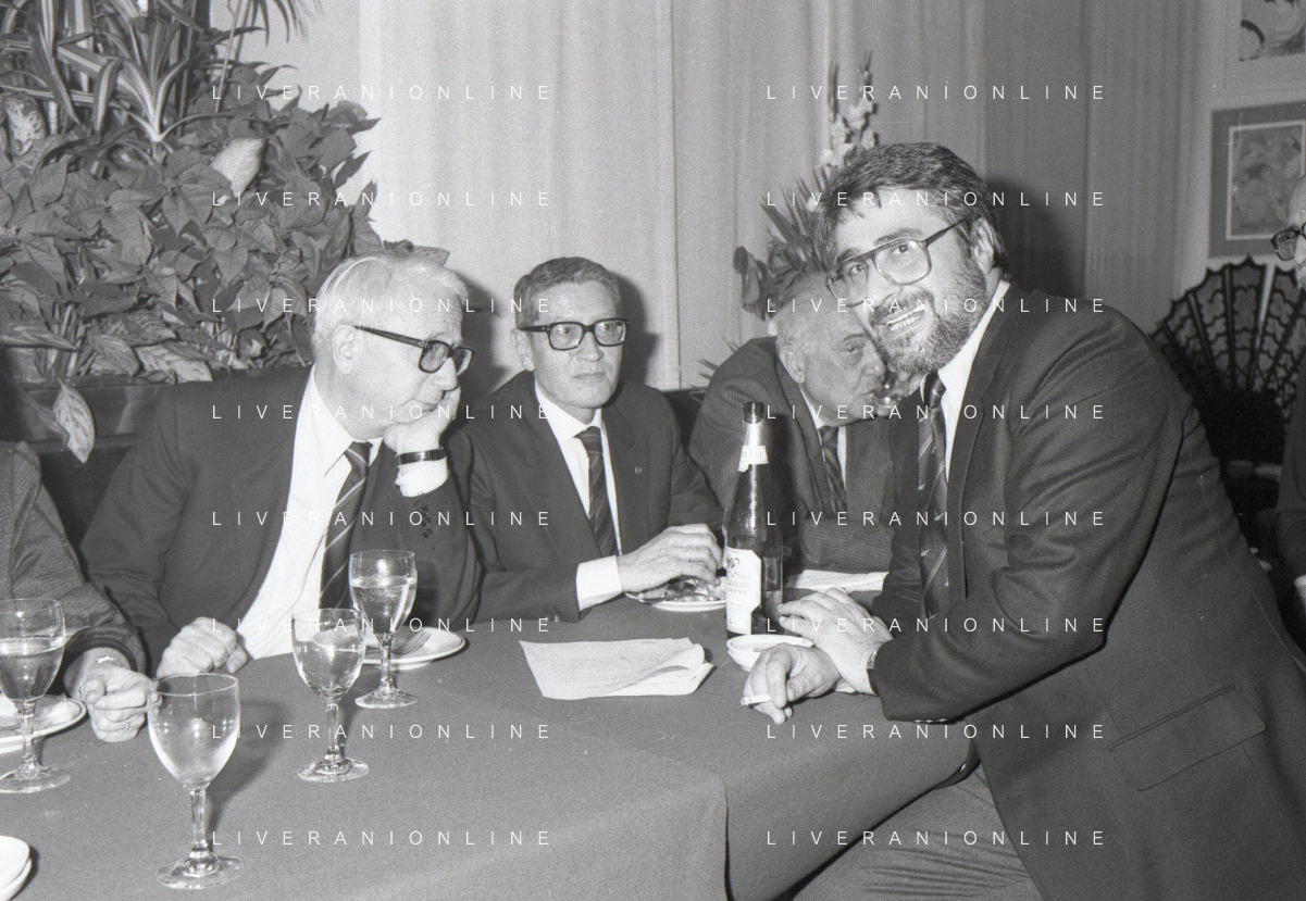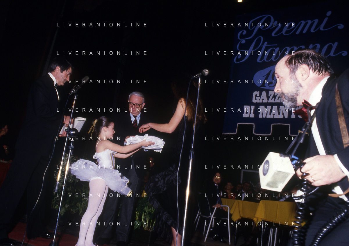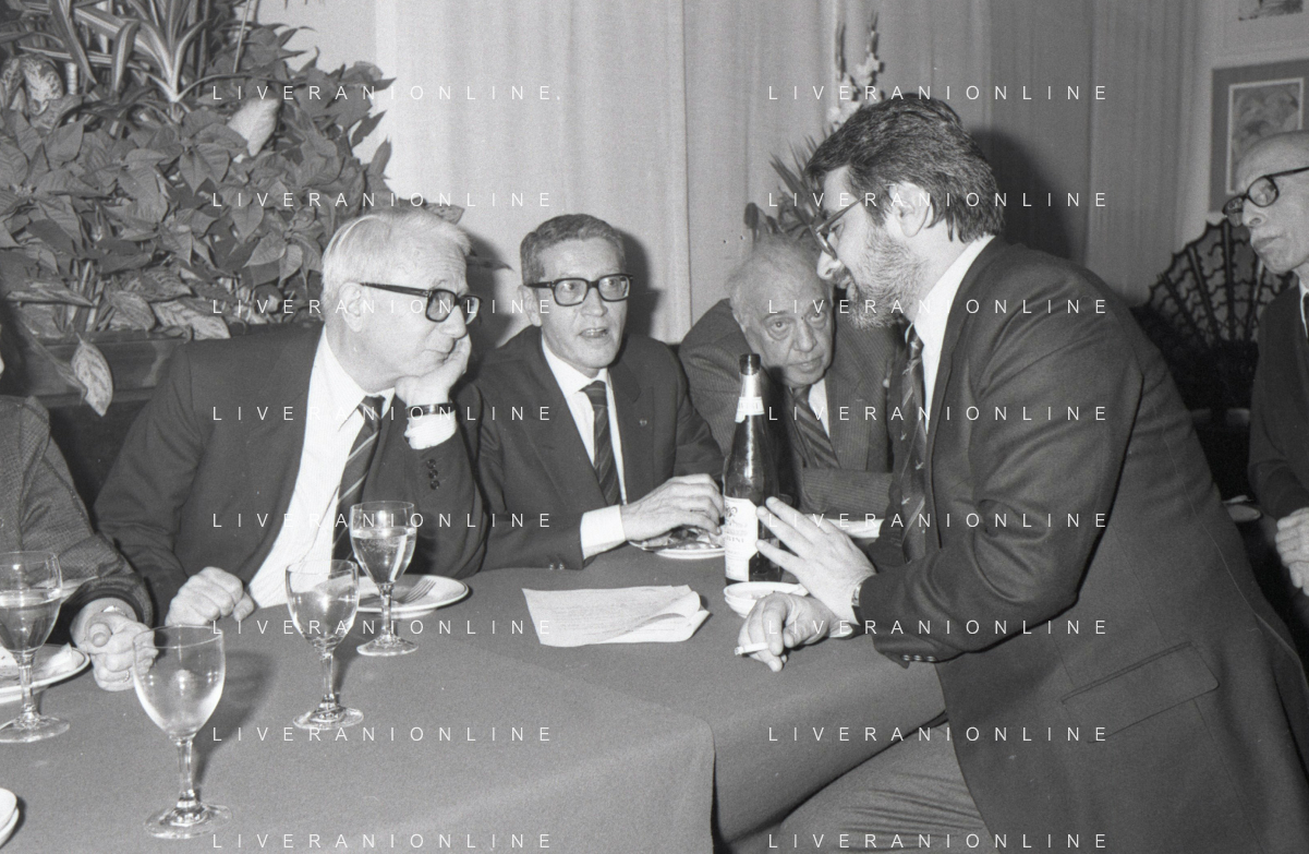 RETROSPETTIVA ENZO BIAGI GIORNALISTA E SCRITTORE E CONDUTTORE TELEVISIVO NELLA FOTO ENZO BIAGI NELL'ANNO 1985 AL PREMIO REGIA TELEVISIVA CON DANIELE PIOMBI E RENZO ARBORE AG ALDO LIVERANI SAS