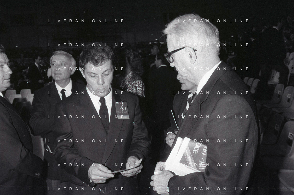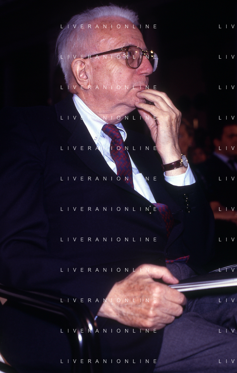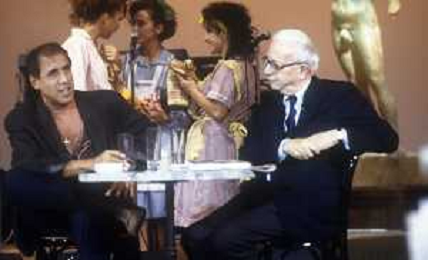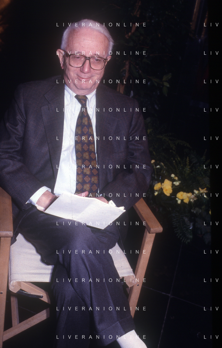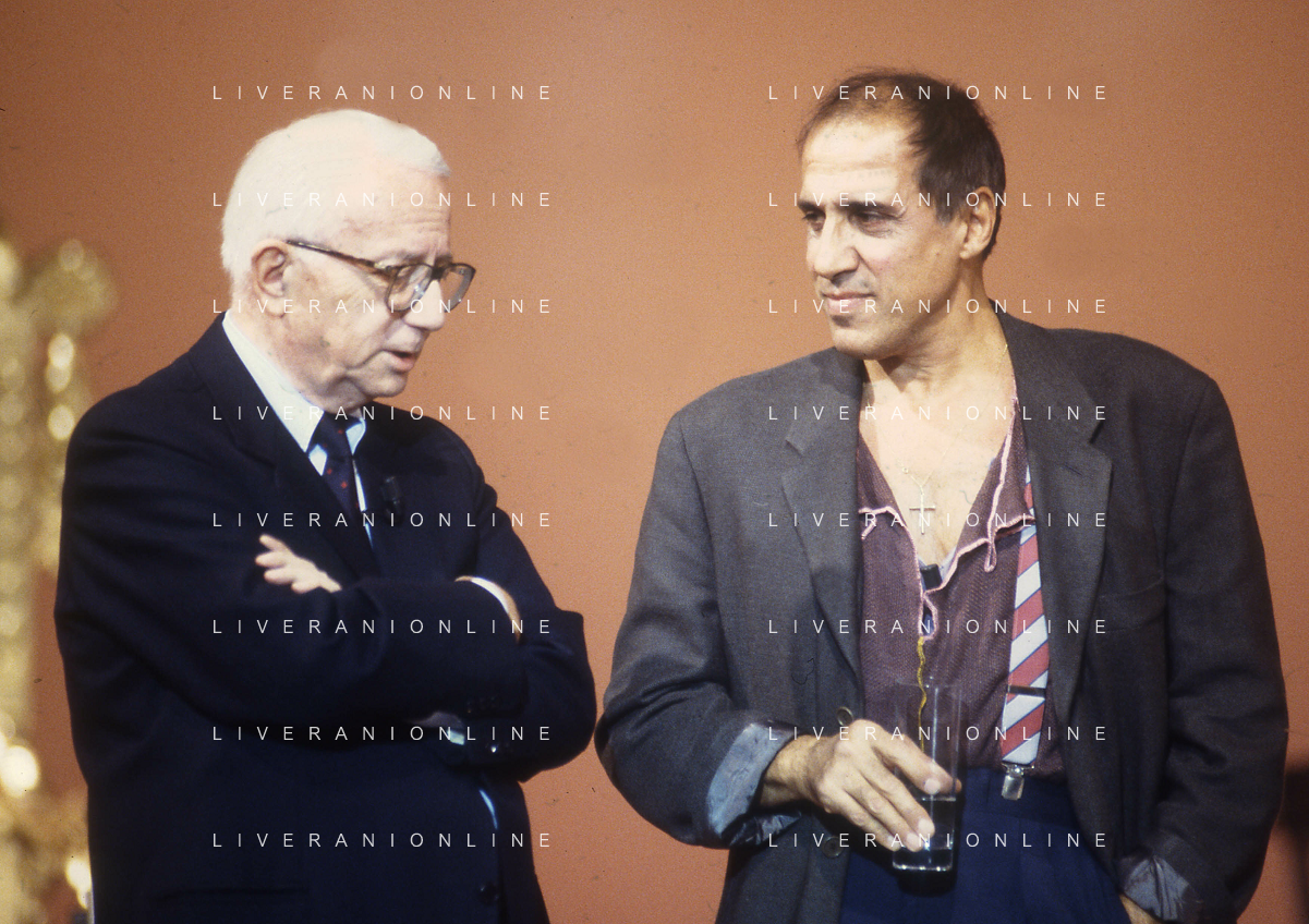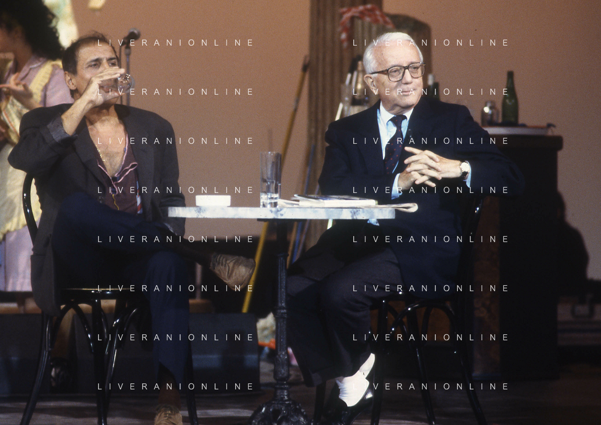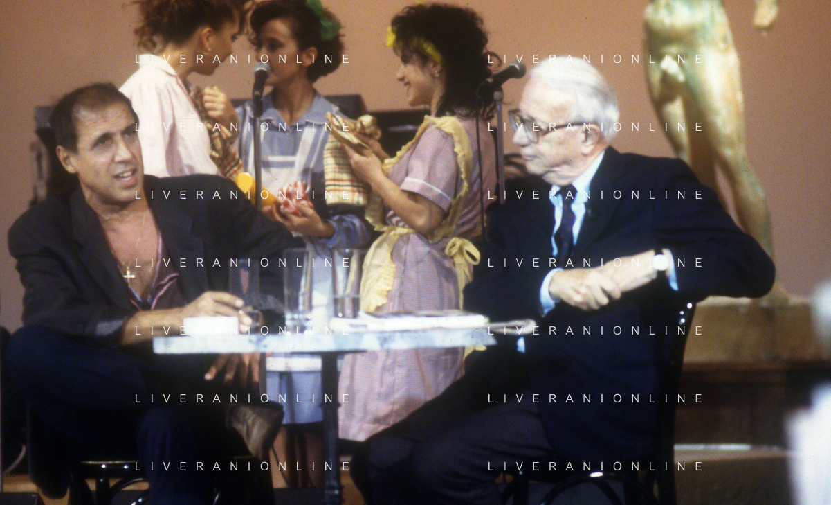 RETROSPETTIVA ENZO BIAGI GIORNALISTA E SCRITTORE E CONDUTTORE TELEVISIVO NELLA FOTO ENZO BIAGI NELL'ANNO 1991 NELLA TRASMISSIONE TELEVISIVA “NOTTE ROCK“ CON ADRIANO CELENTANO AG ALDO LIVERANI SAS