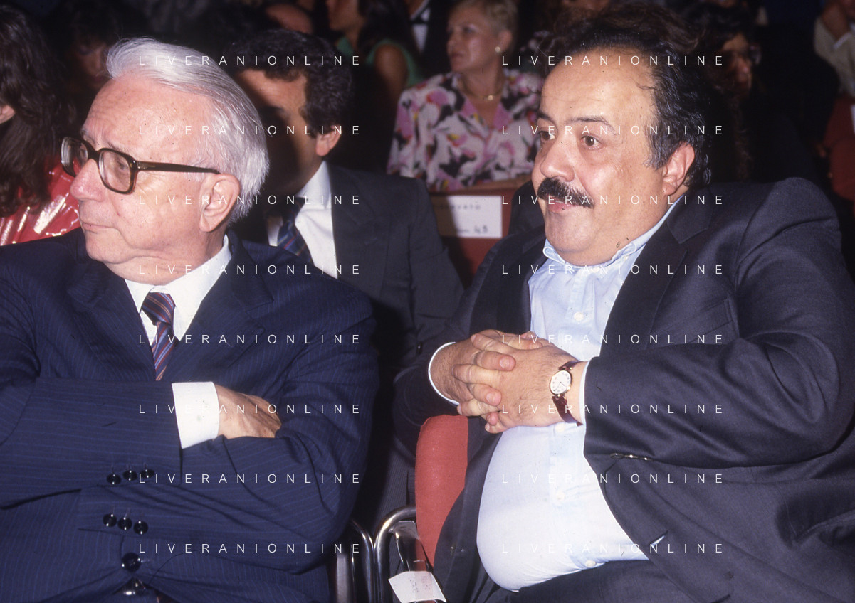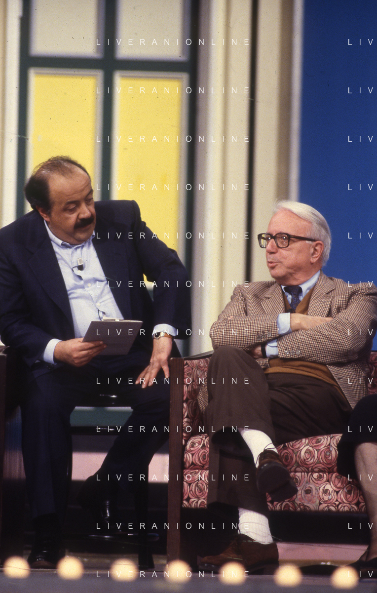RETROSPETTIVA ENZO BIAGI GIORNALISTA E SCRITTORE E CONDUTTORE TELEVISIVO NELLA FOTO ENZO BIAGI NELL'ANNO 1985 CON RENZO ARBORE ALLA MANIFESTAZIONE DEI TELEGATTI AG ALDO LIVERANI SAS