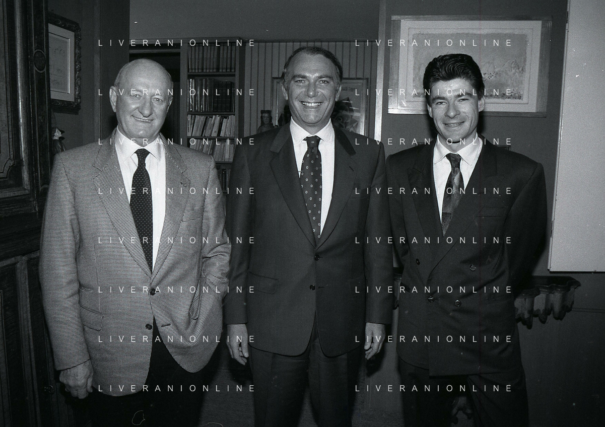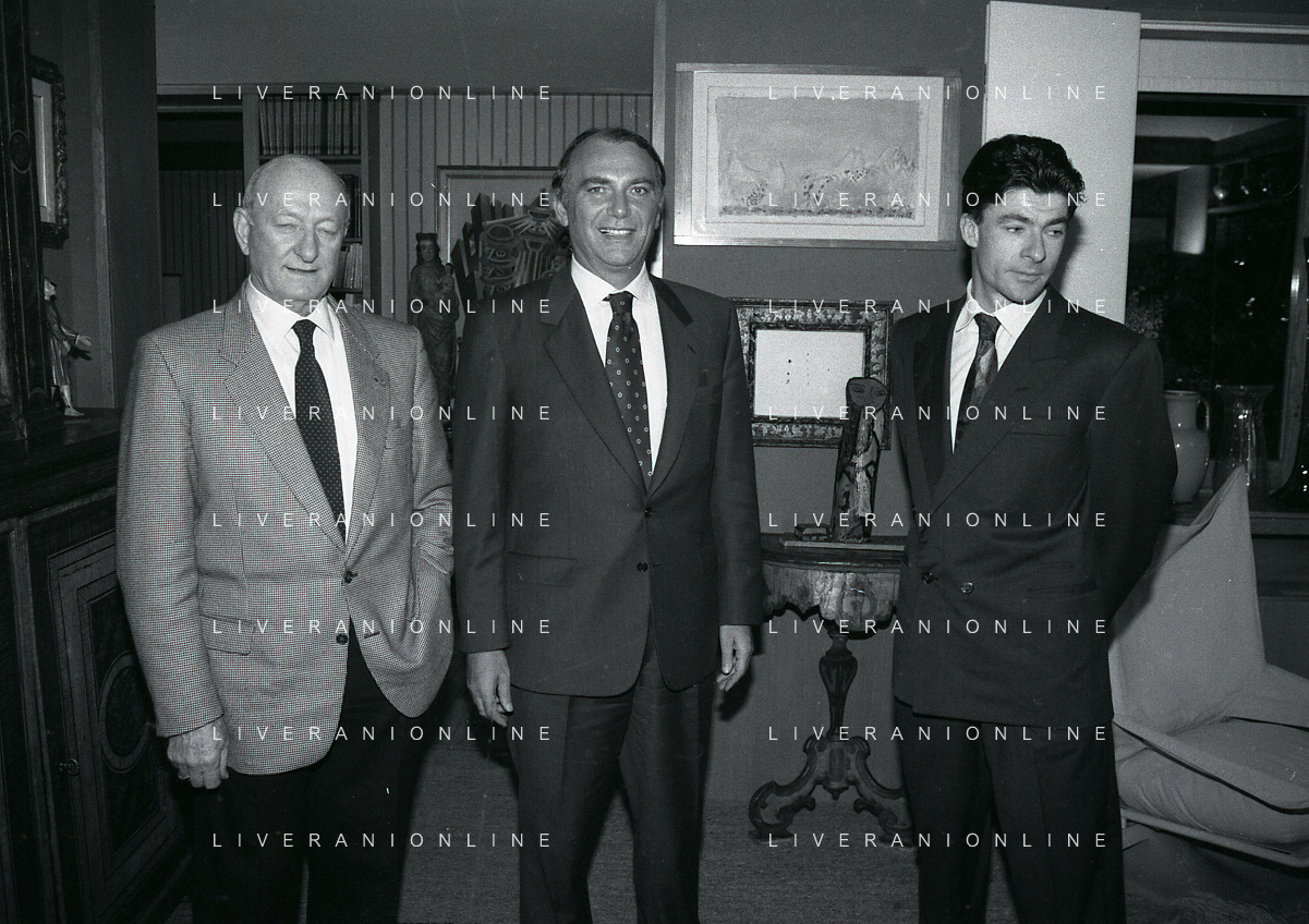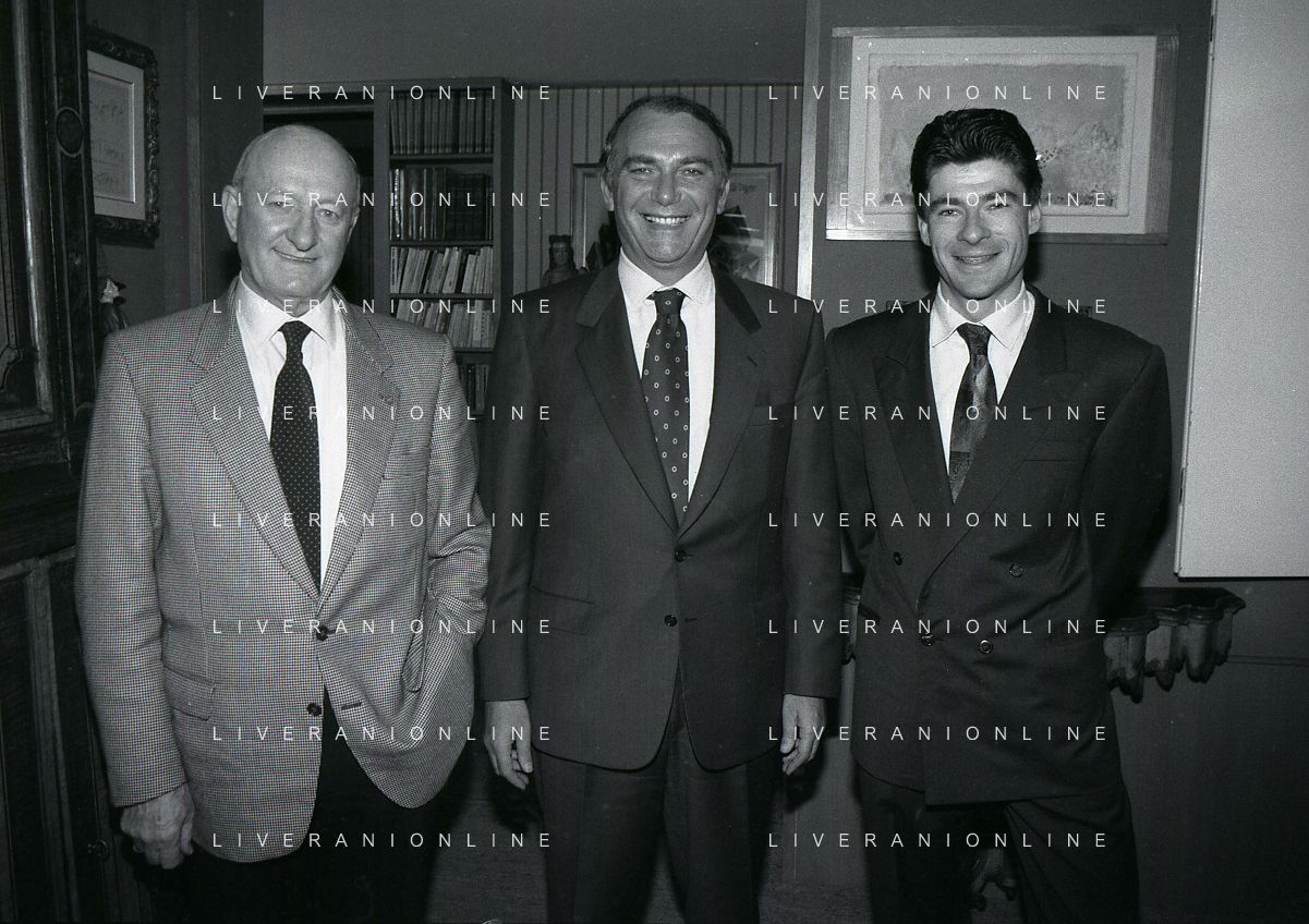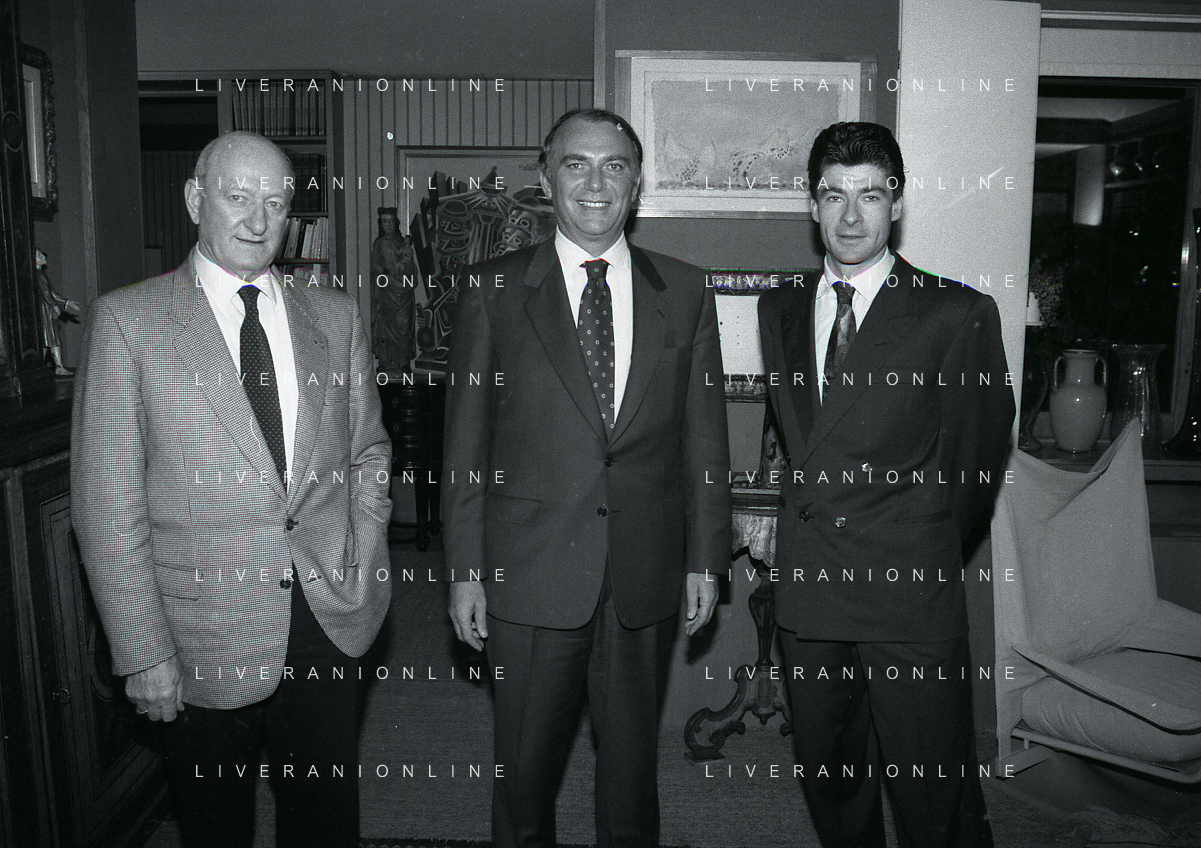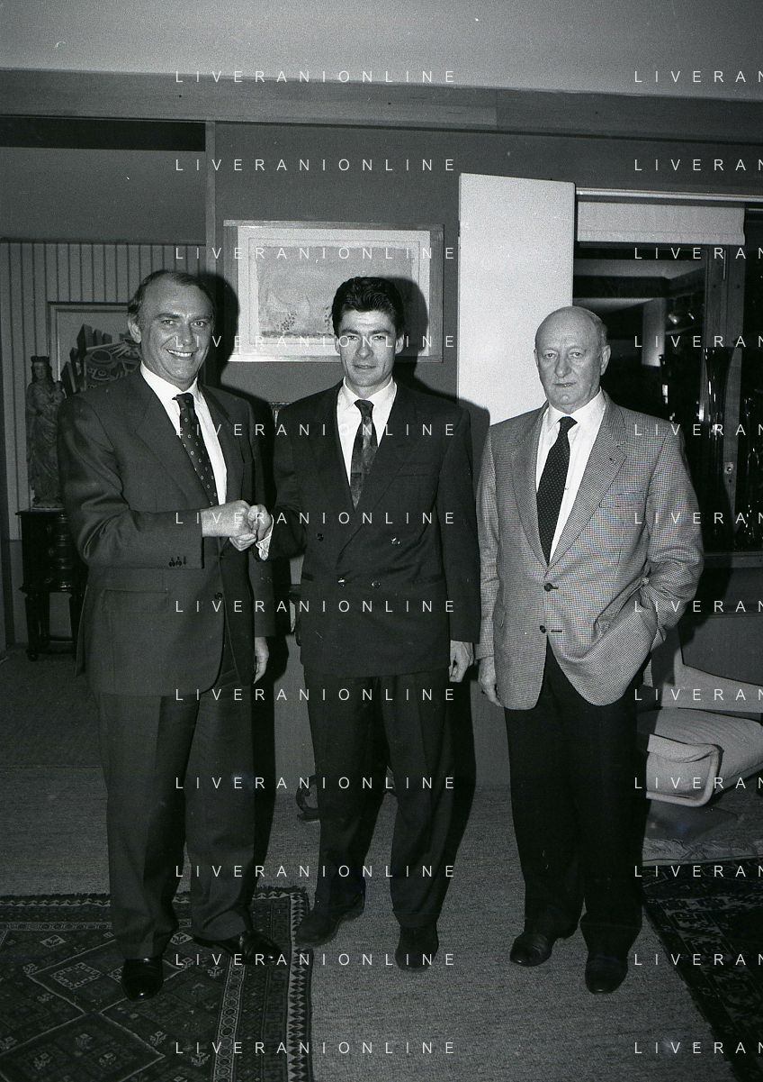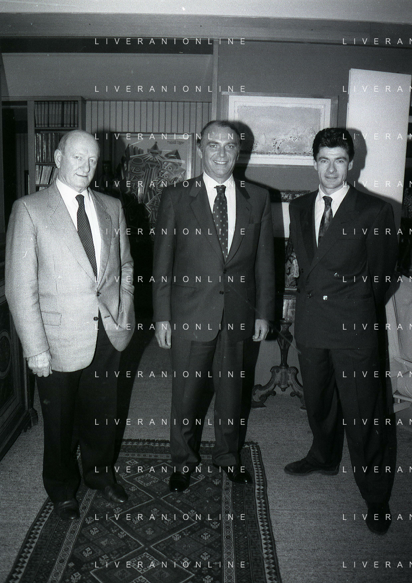 RETROSPETTIVA ERNESTO PELLEGRINI PRESIDENTE FC INTER NELLA FOTO ERNESTO PELLEGRINI NELL'ANNO 1992-1993 CON AGOSTINO OMINI E GIANNI BUGNO IN VILLA DA ERNESTO PELLEGRINI AG ALDO LIVERANI SAS
