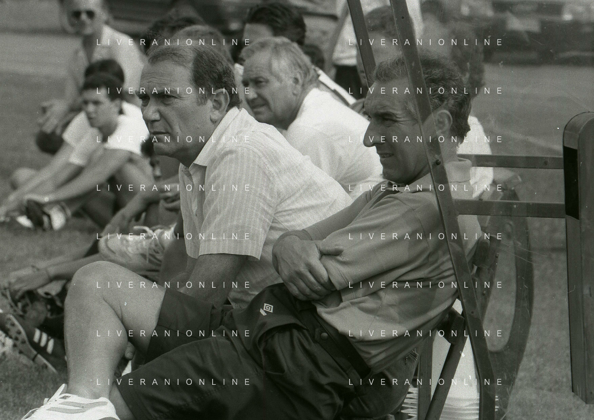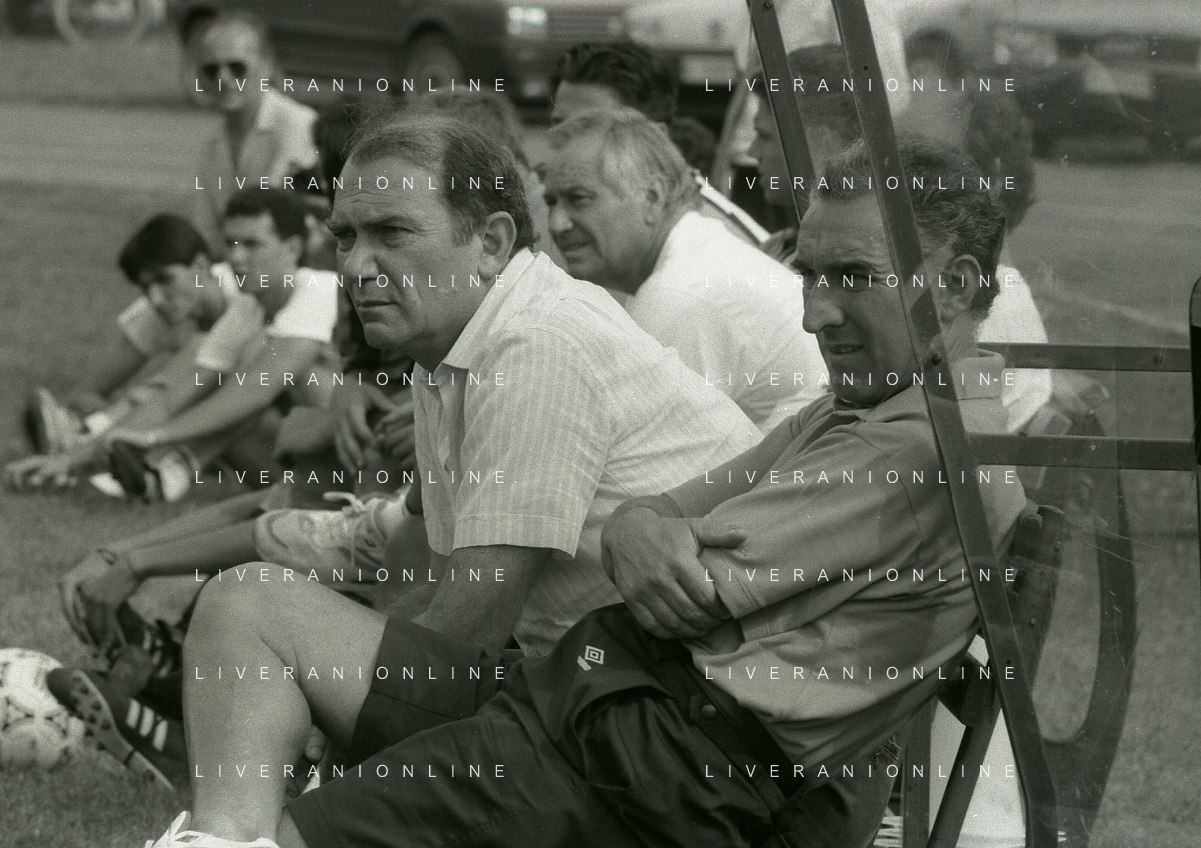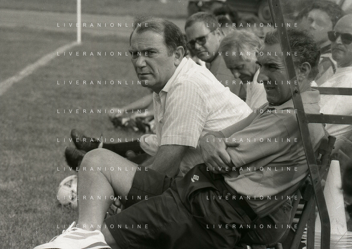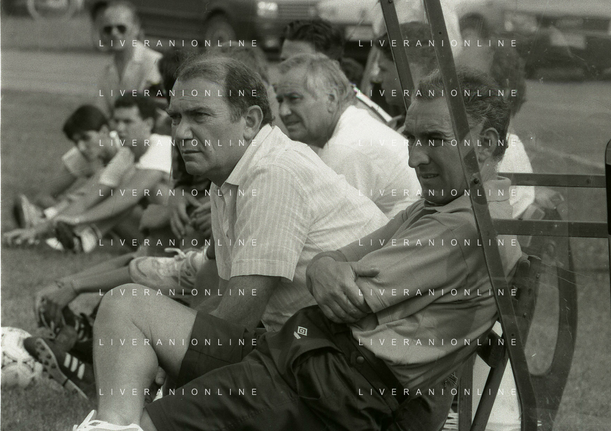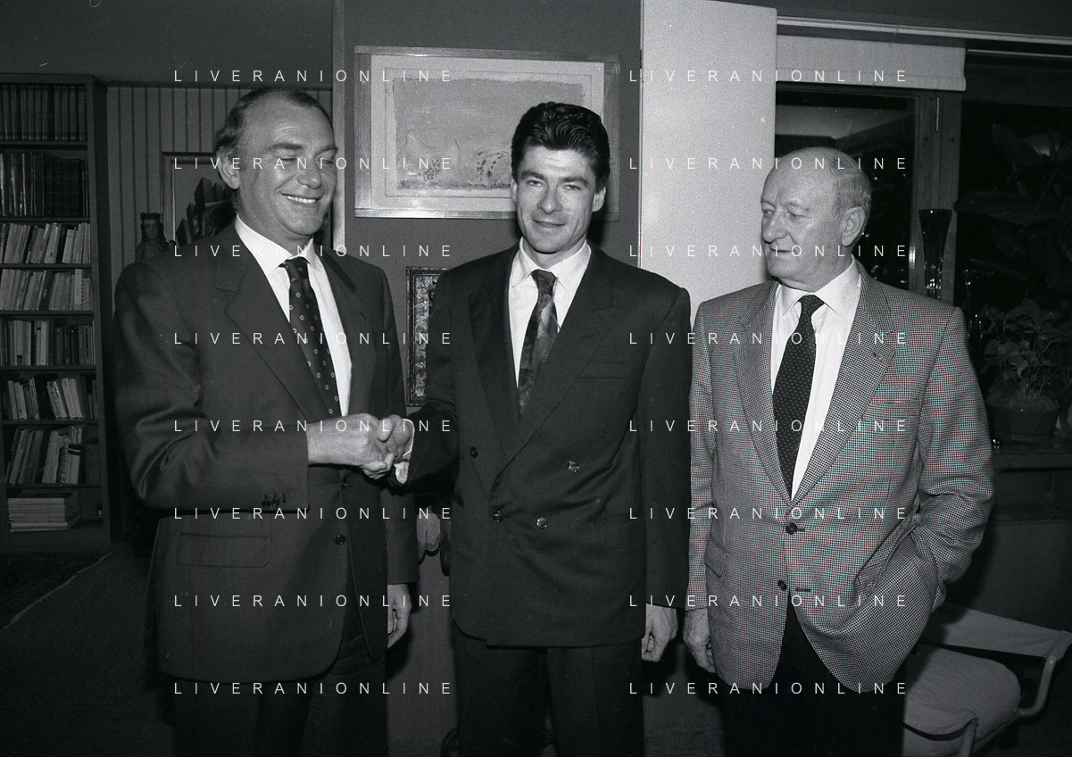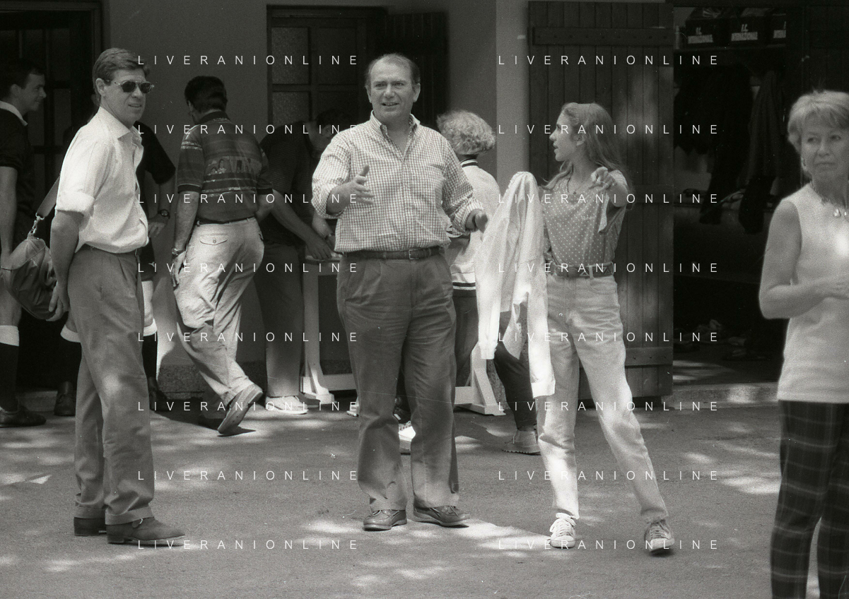 RETROSPETTIVA ERNESTO PELLEGRINI PRESIDENTE FC INTER NELLA FOTO ERNESTO PELLEGRINI NELL'ANNO 1992-1993 CON AGOSTINO OMINI E GIANNI BUGNO IN VILLA DA ERNESTO PELLEGRINI AG ALDO LIVERANI SAS