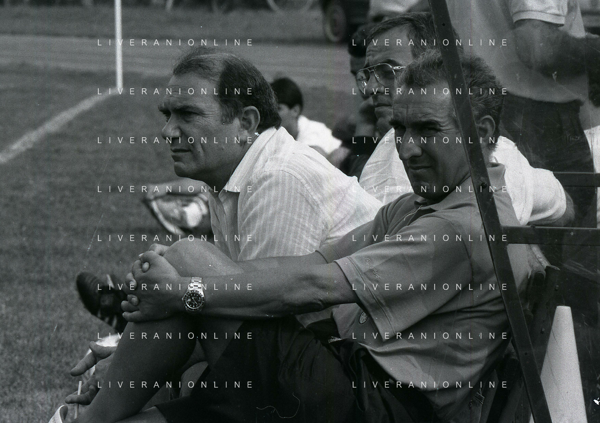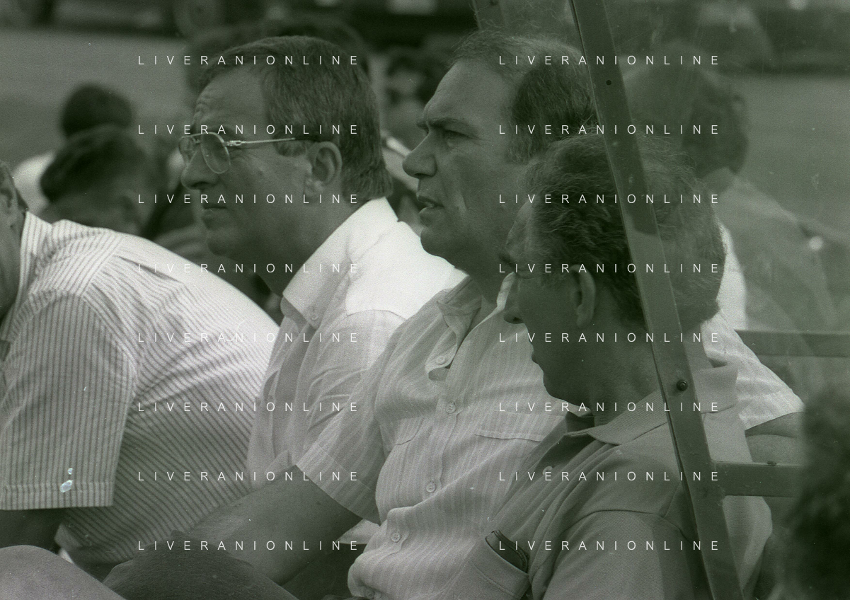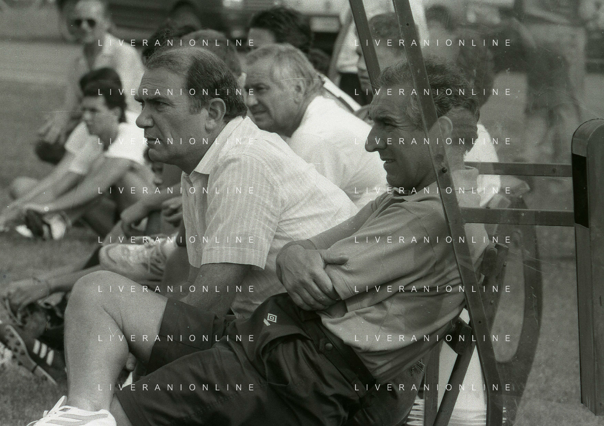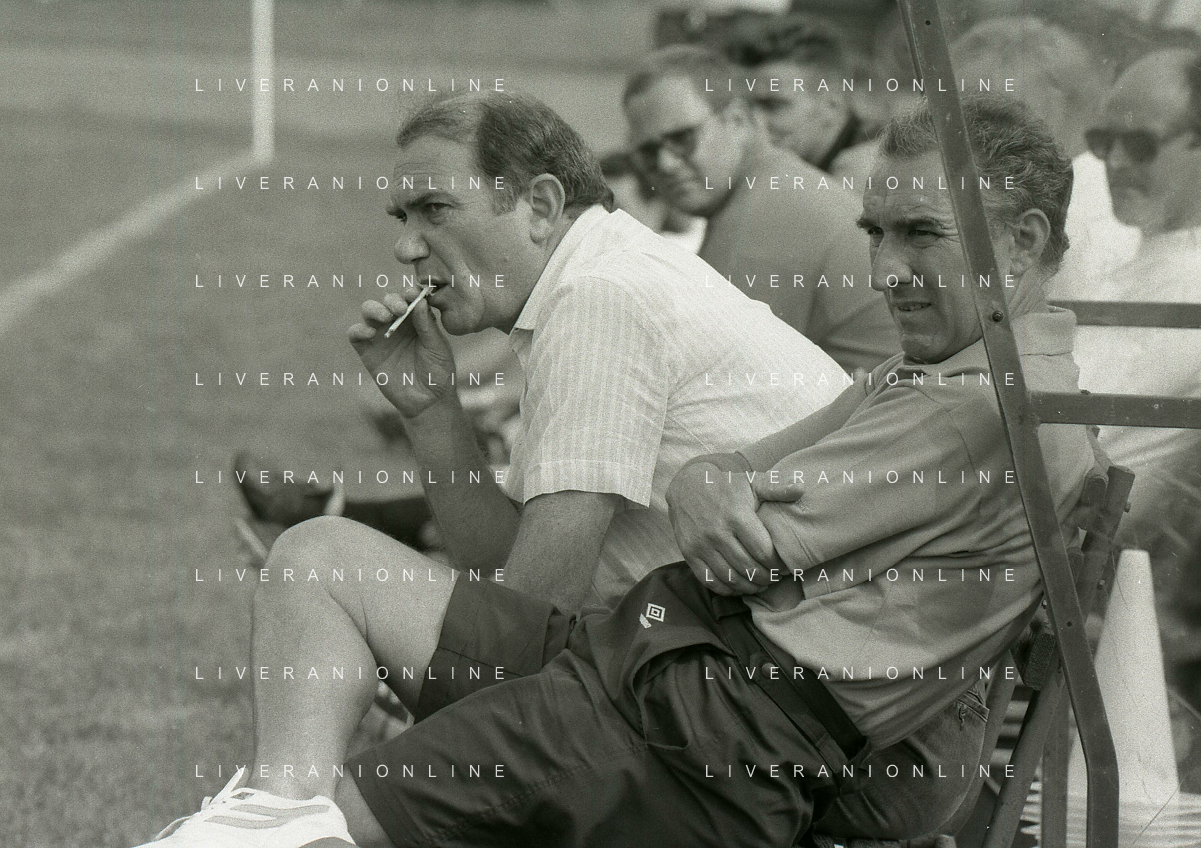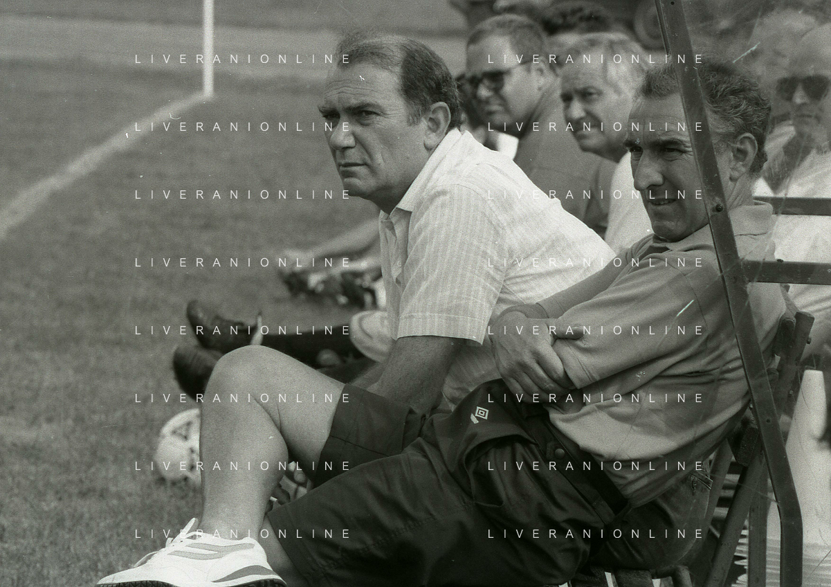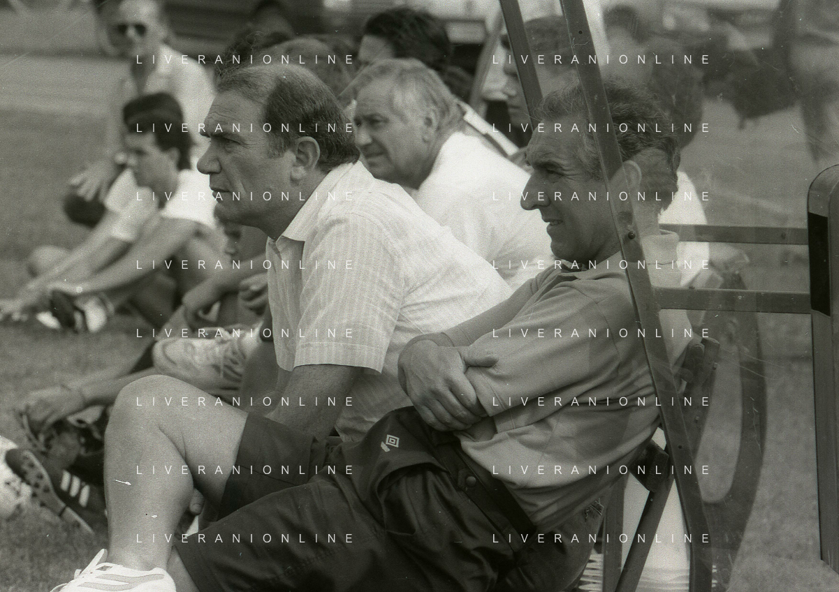 RETROSPETTIVA ERNESTO PELLEGRINI PRESIDENTE FC INTER NELLA FOTO ERNESTO PELLEGRINI NELL'ANNO 1992-1993 CON AGOSTINO OMINI E GIANNI BUGNO IN VILLA DA ERNESTO PELLEGRINI AG ALDO LIVERANI SAS