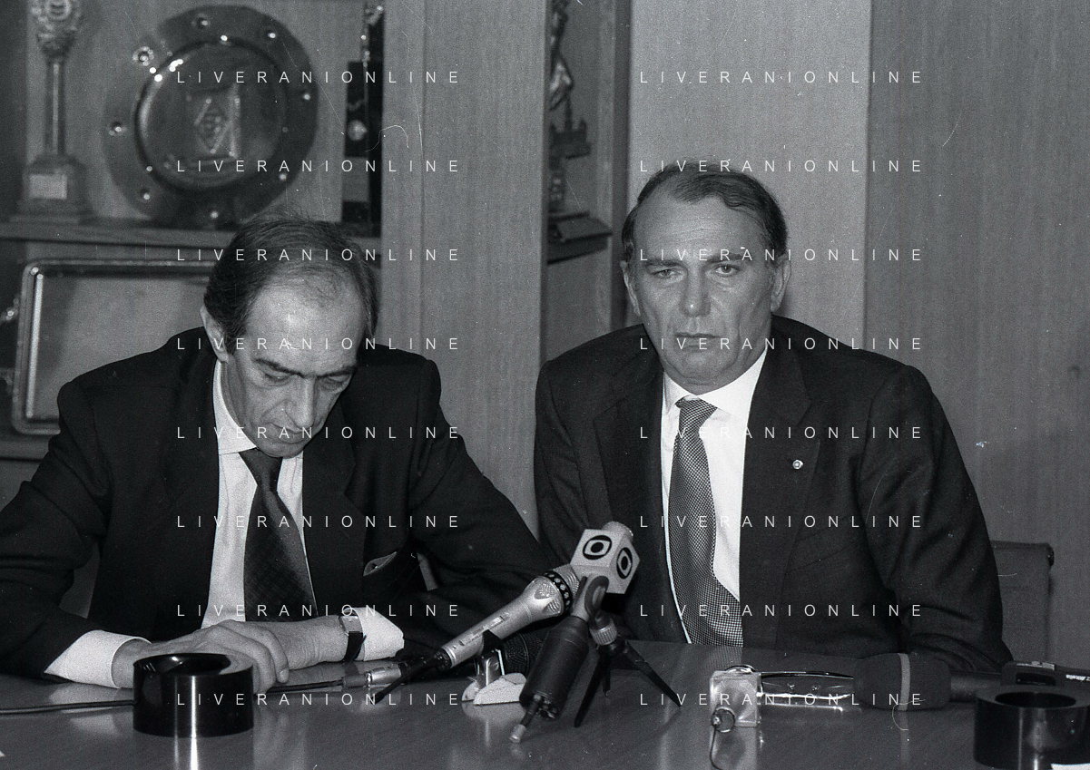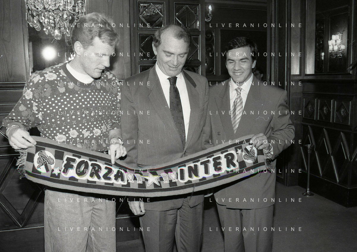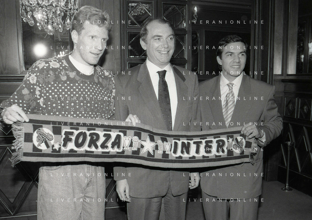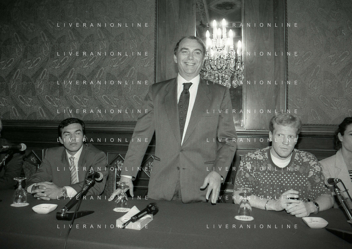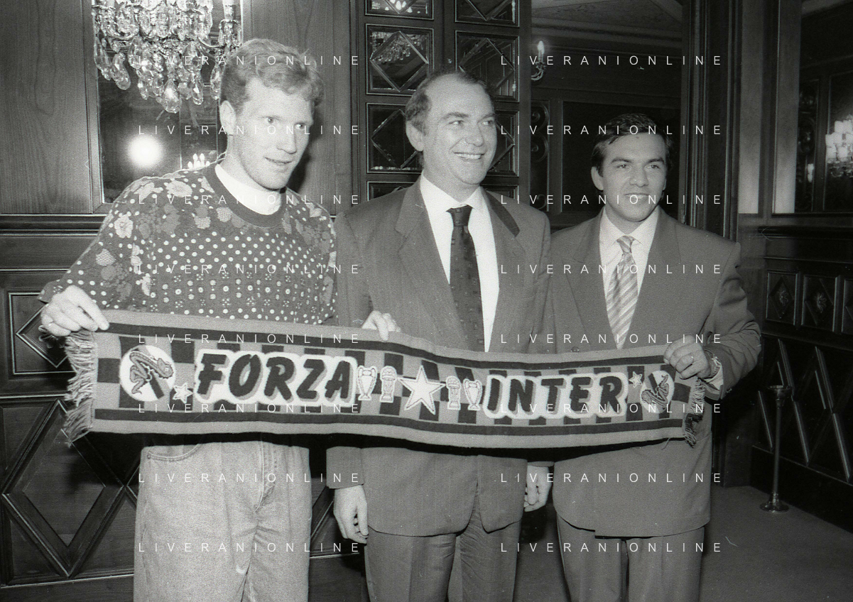 RETROSPETTIVA ERNESTO PELLEGRINI PRESIDENTE FC INTER NELLA FOTO ERNESTO PELLEGRINI NELL'ANNO 1992-1993 ALLA PRESENTAZIONE DEI NUOVI ACQUISTI MATTHIAS SAMMER E RUBEN SOSA AG ALDO LIVERANI SAS