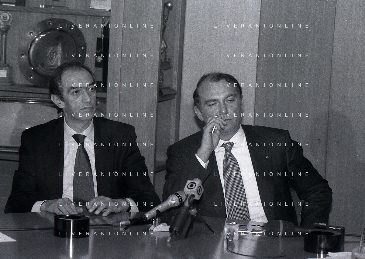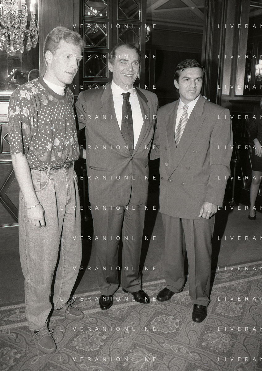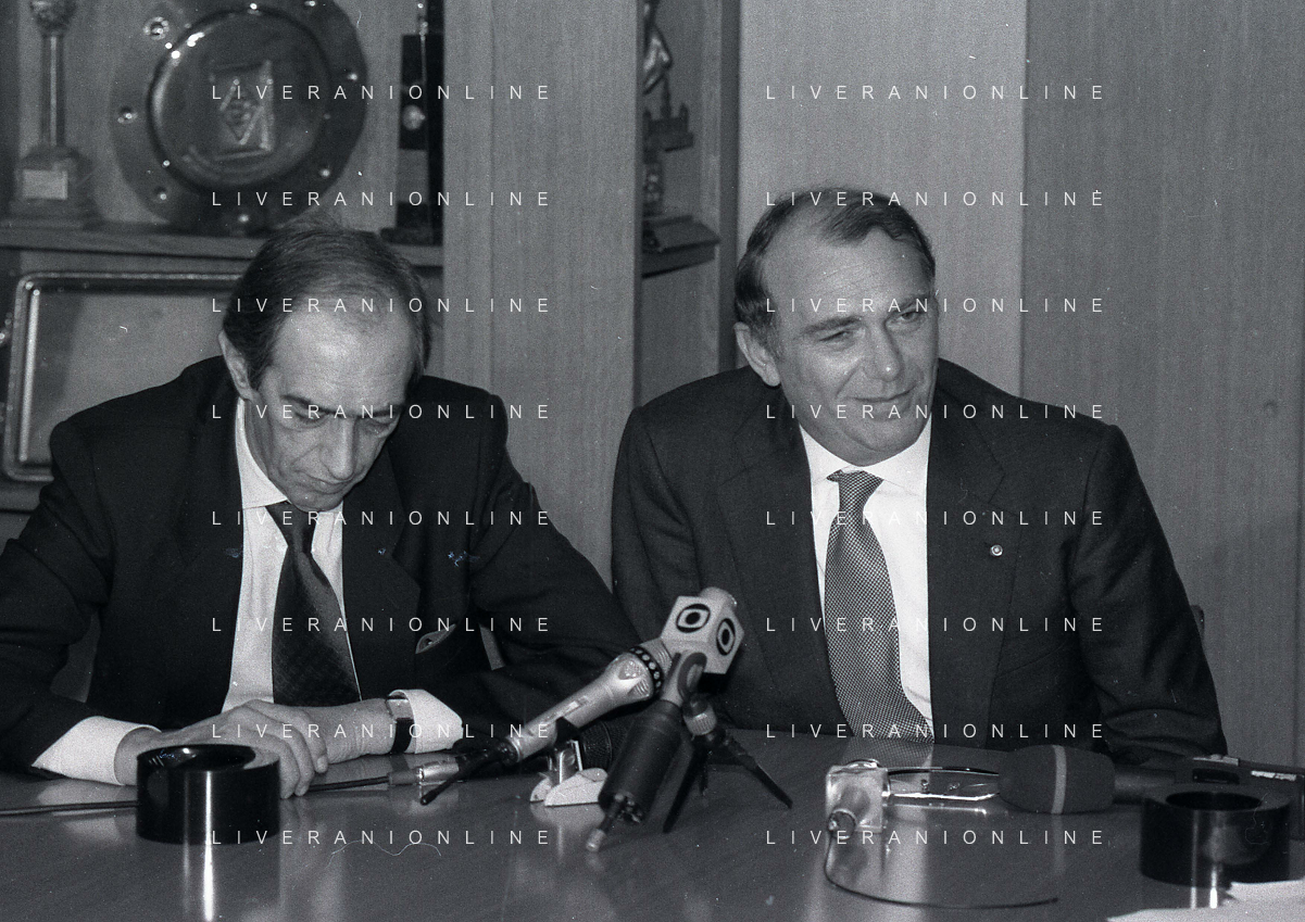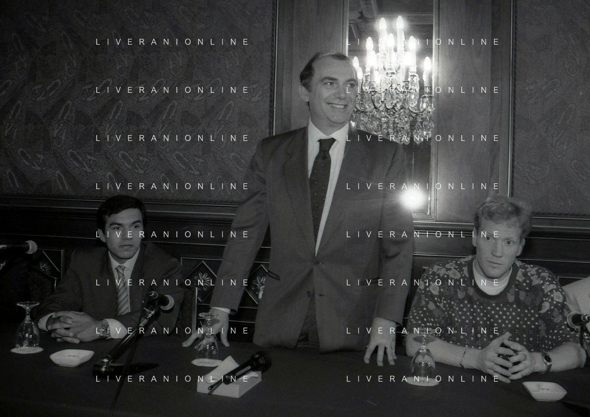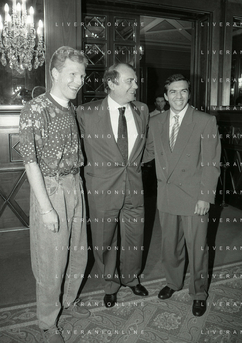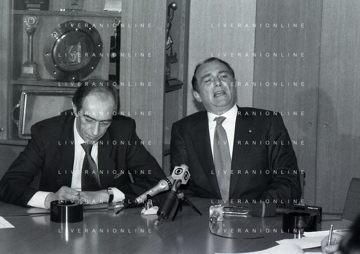 RETROSPETTIVA ERNESTO PELLEGRINI PRESIDENTE FC INTER NELLA FOTO ERNESTO PELLEGRINI NELL'ANNO 1992-1993 ALLA PRESENTAZIONE DEI NUOVI ACQUISTI MATTHIAS SAMMER E RUBEN SOSA AG ALDO LIVERANI SAS