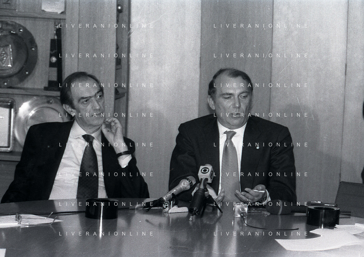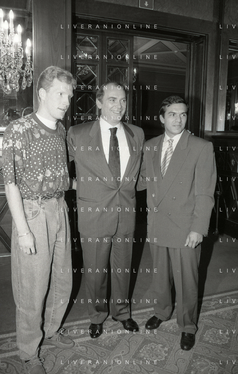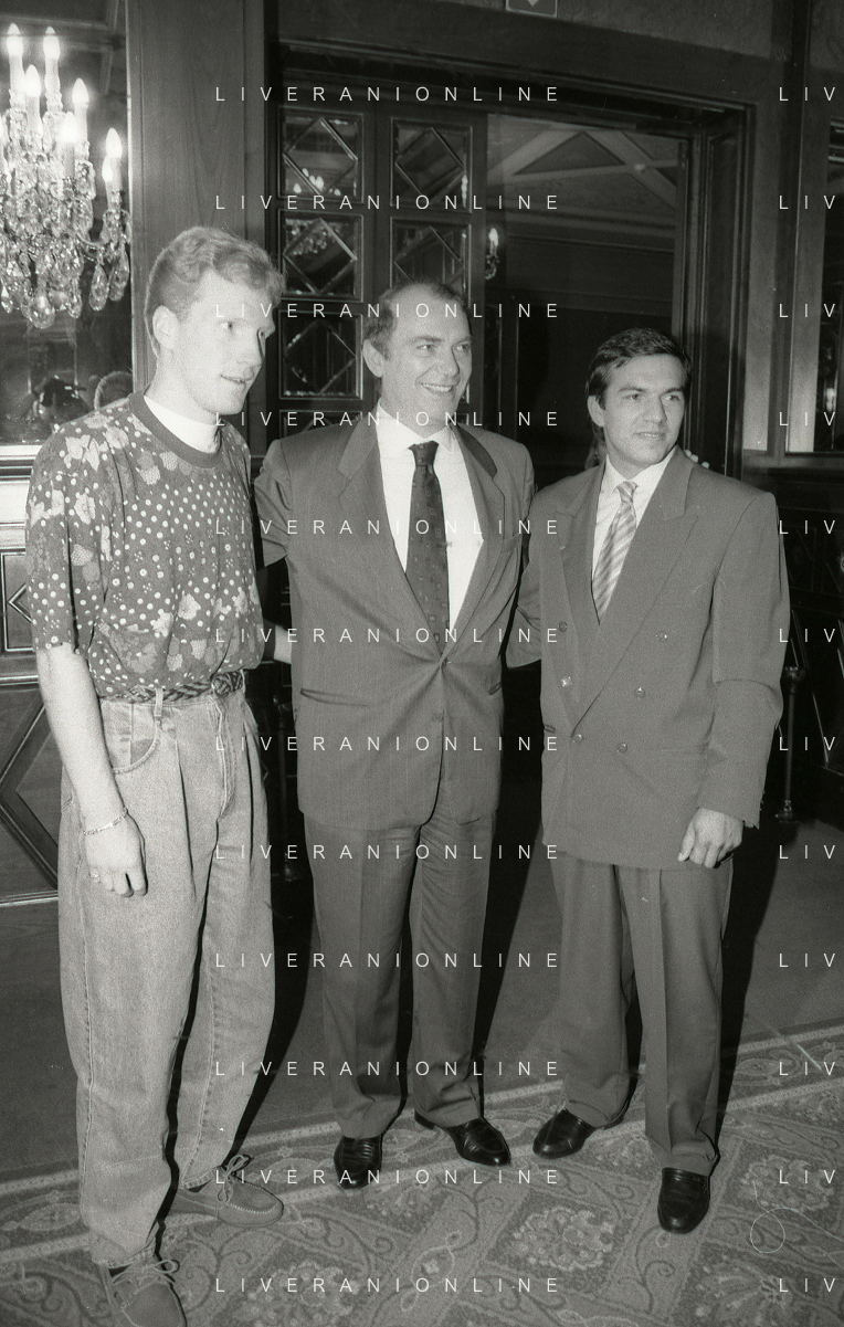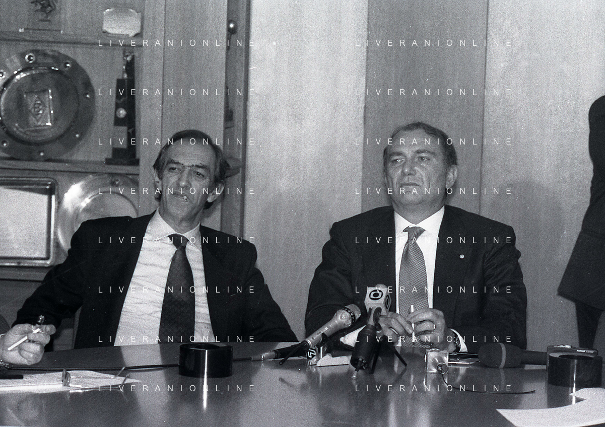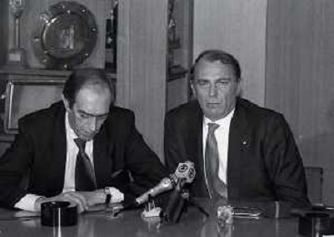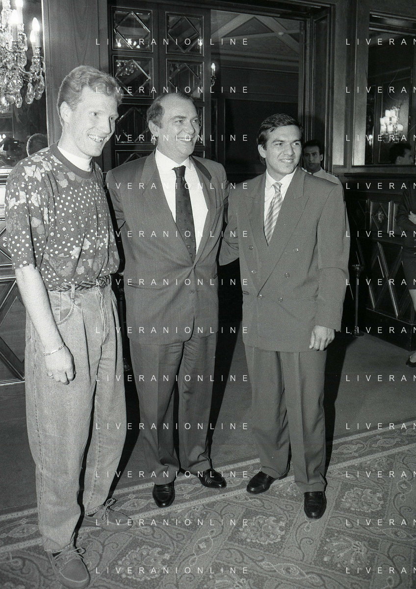 RETROSPETTIVA ERNESTO PELLEGRINI PRESIDENTE FC INTER NELLA FOTO ERNESTO PELLEGRINI NELL'ANNO 1992-1993 ALLA PRESENTAZIONE DEI NUOVI ACQUISTI MATTHIAS SAMMER E RUBEN SOSA AG ALDO LIVERANI SAS
