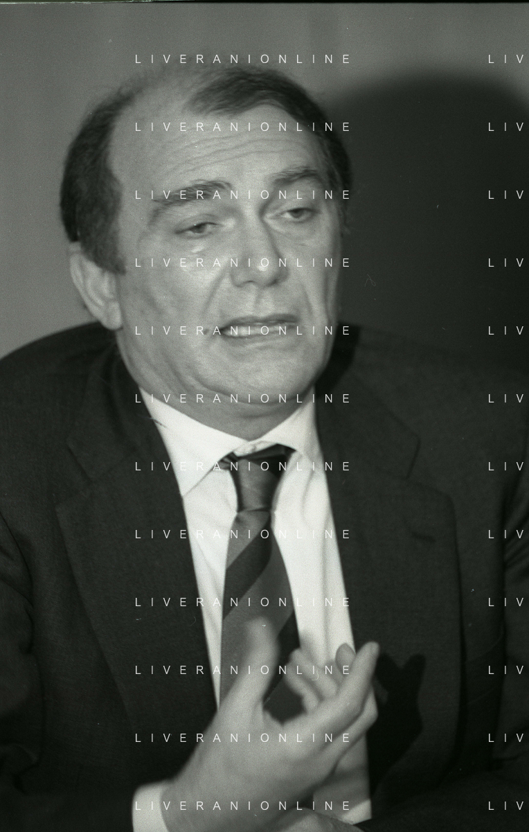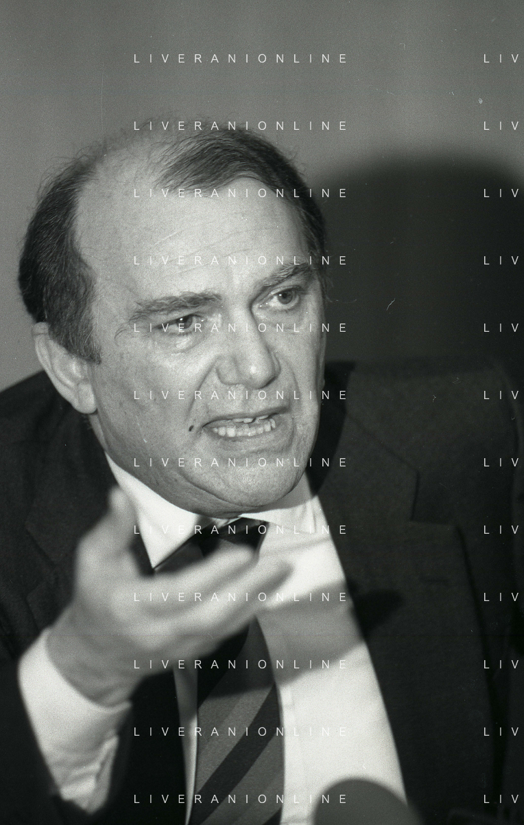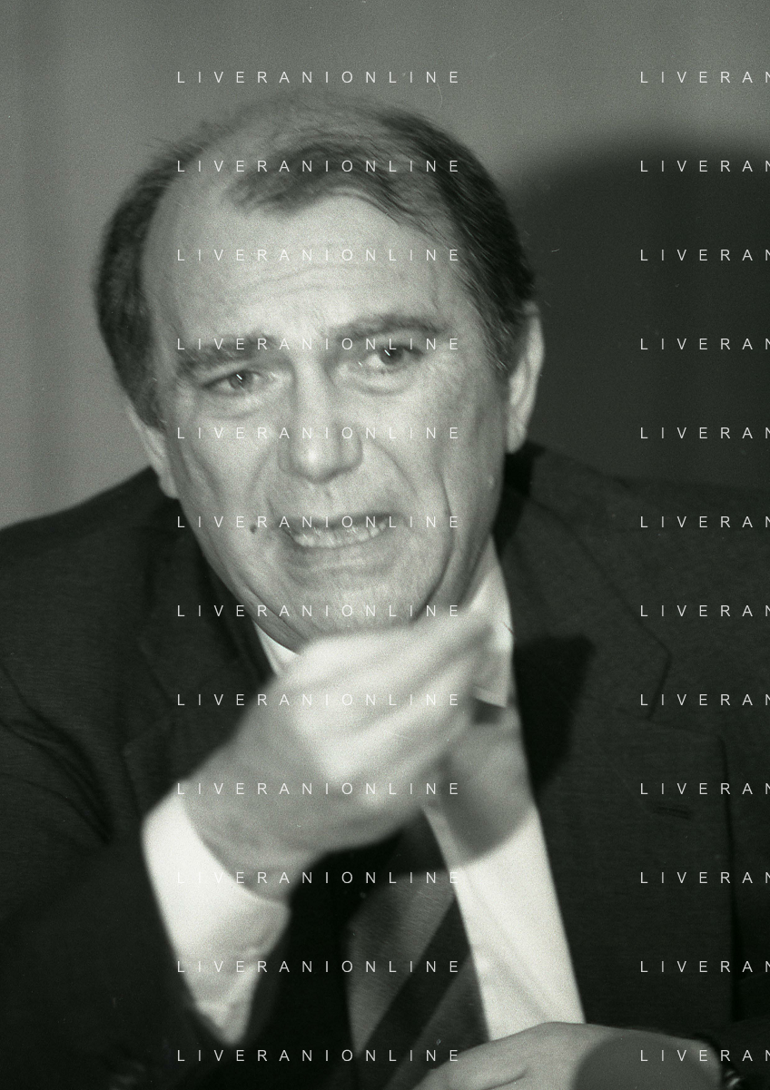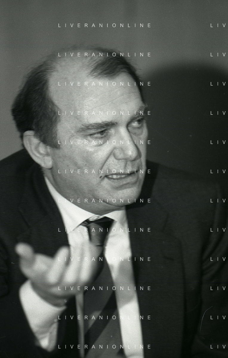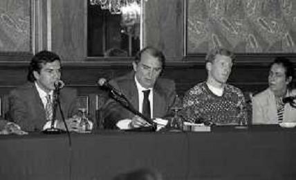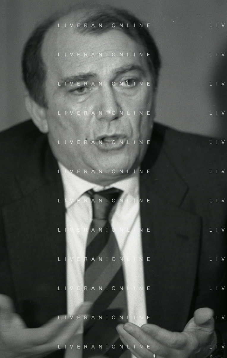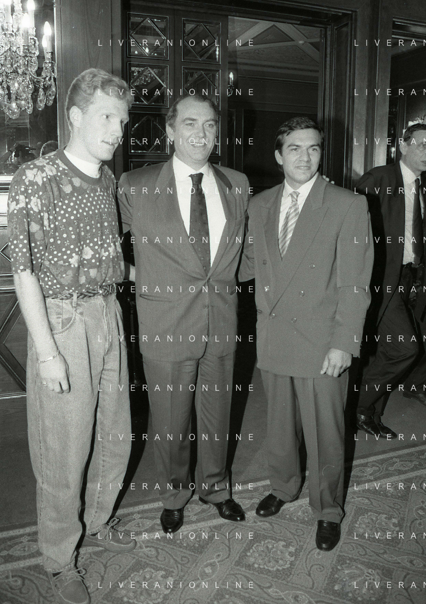 RETROSPETTIVA ERNESTO PELLEGRINI PRESIDENTE FC INTER NELLA FOTO ERNESTO PELLEGRINI NELL'ANNO 1992-1993 ALLA PRESENTAZIONE DEI NUOVI ACQUISTI MATTHIAS SAMMER E RUBEN SOSA AG ALDO LIVERANI SAS