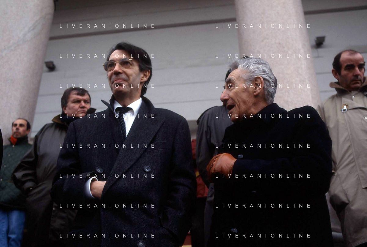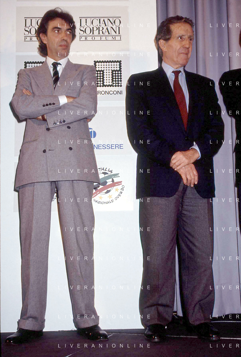 Massimo Moratti, Presidente dell'Inter dal 1995, con l'ex calciatore dell'Inter negli anni '50 Benito Lorenzi foto del 1994 ph archivio ag. aldo liverani sas