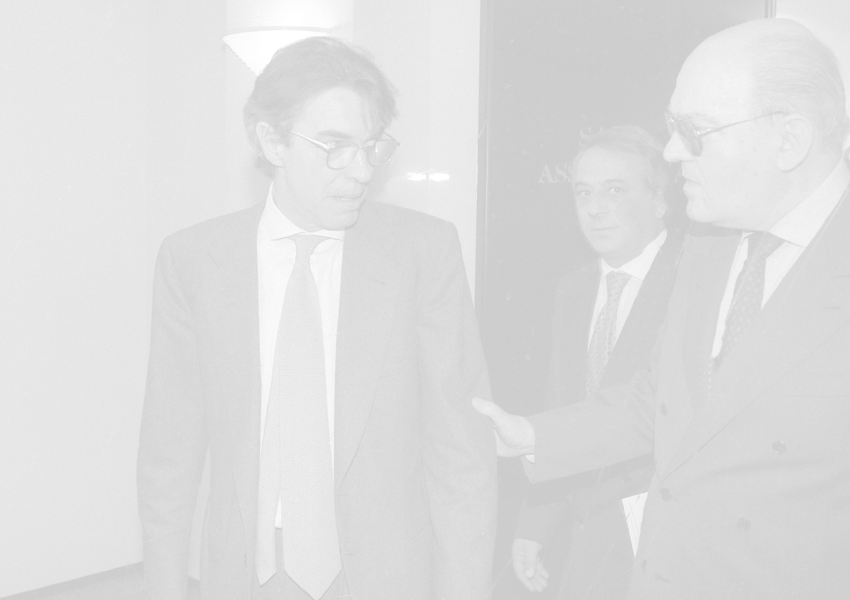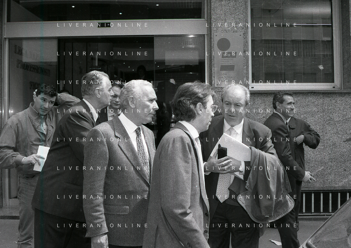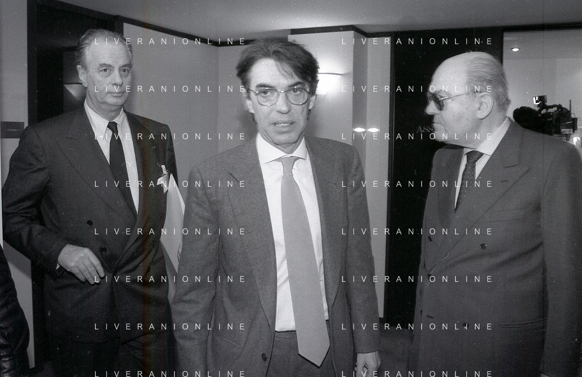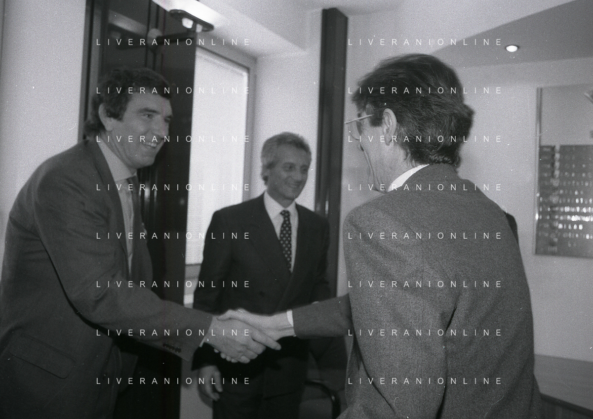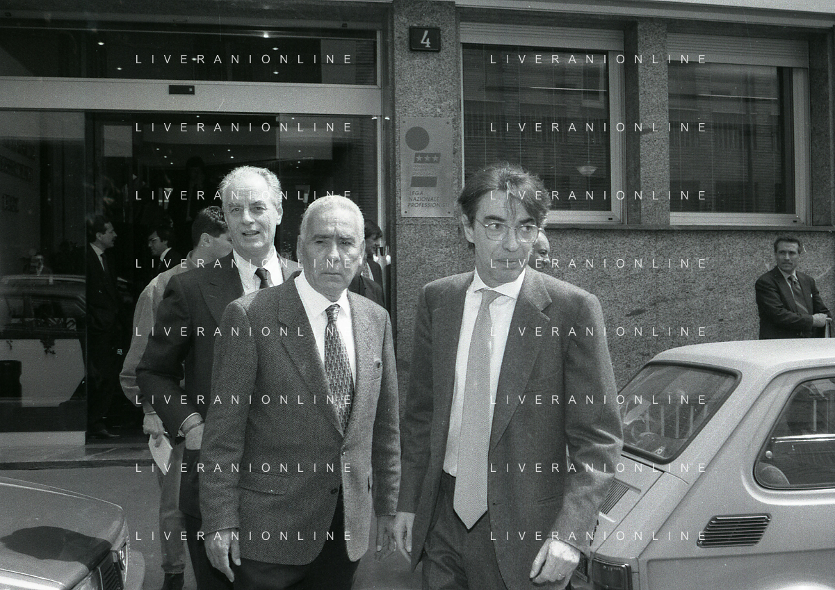 NEG-RETROSPETTIVA MASSIMO MORATTI PRESIDENTE INTER NELLA FOTO MASSIMO MORATTI IL PRIMO GIORNO IN LEGA CALCIO DA PRESIDENTE INTER NELL'ANNO 1995 CON VITTORIO CHIUSANO E GINO CORIONI AG ALDO LIVERANI SAS