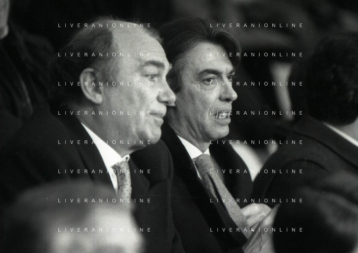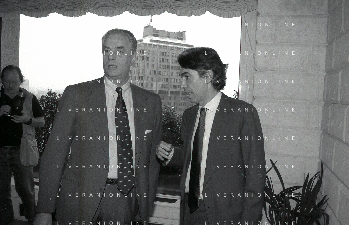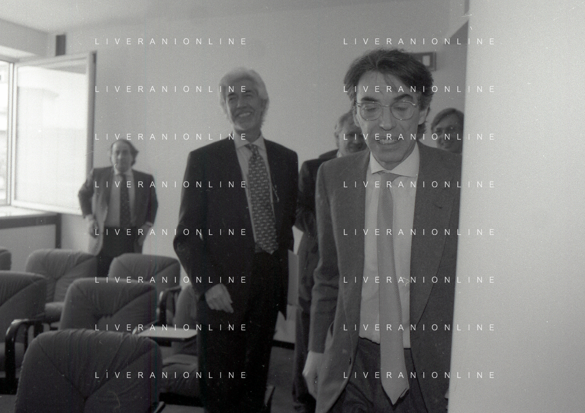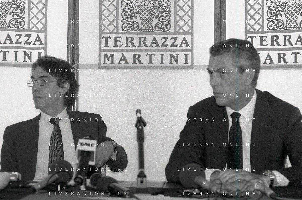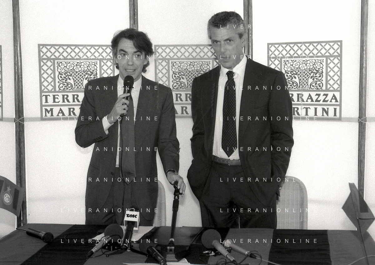 NEG-RETROSPETTIVA MASSIMO MORATTI PRESIDENTE INTER NELLA FOTO MASSIMO MORATTI PRESIDENTE INTER CON GIAMMARIA VISCONTI DI MODRONE NELL'ANNO 1995 IN CONFERENZA STAMPA A MILANO SEDE INTER AG ALDO LIVERANI SAS