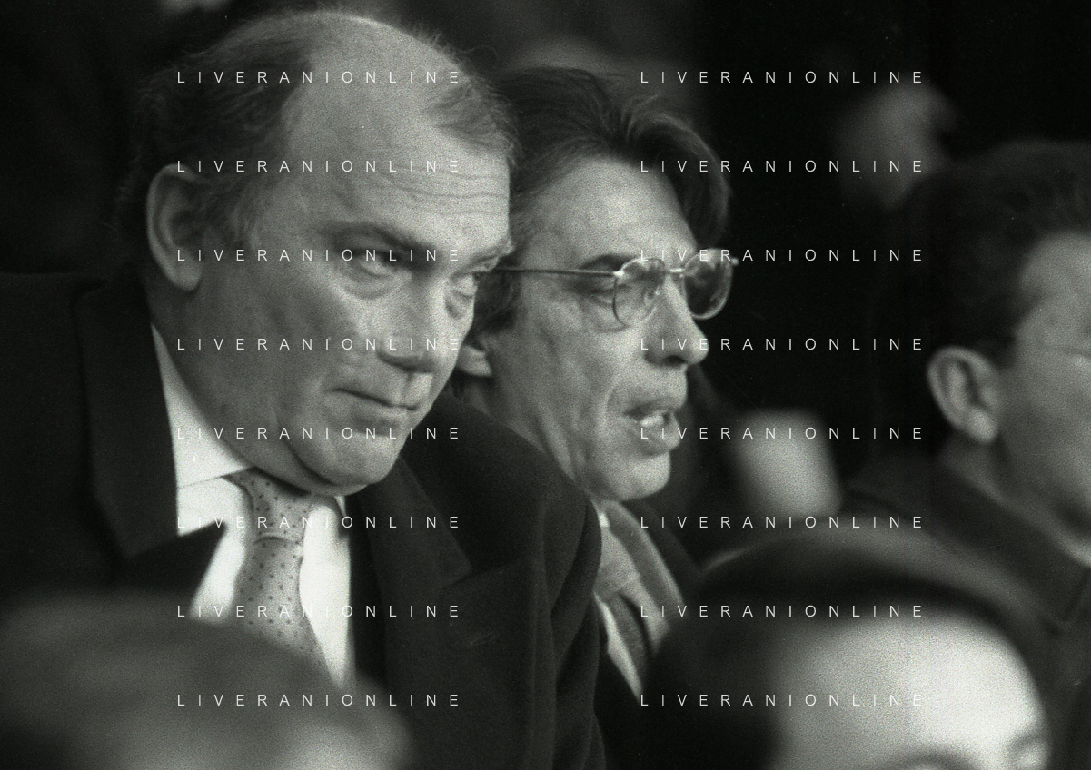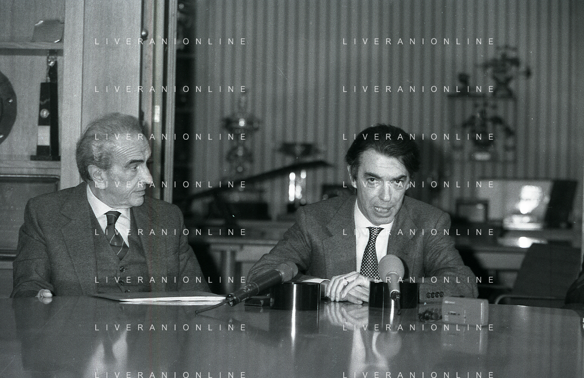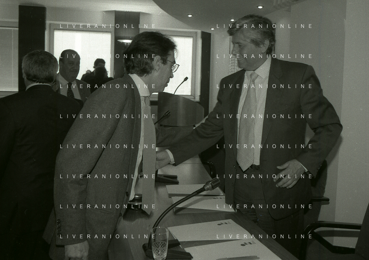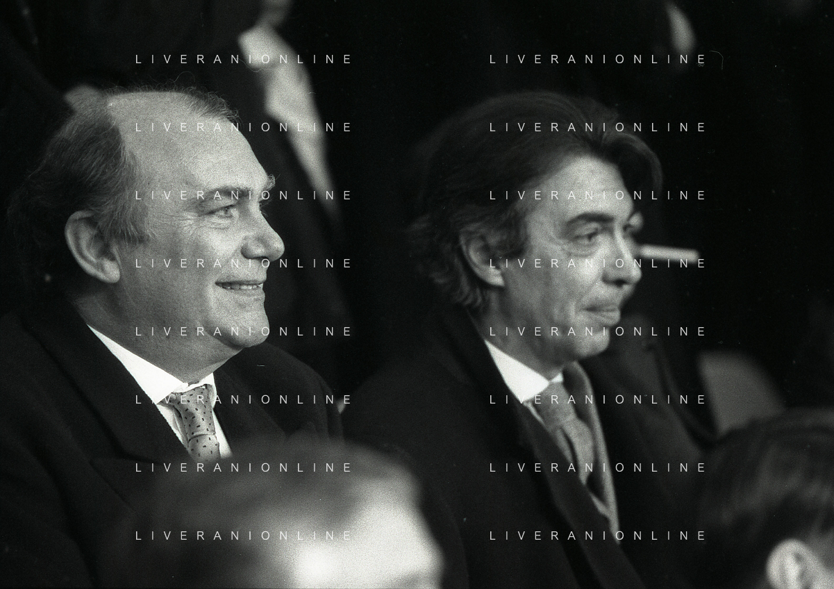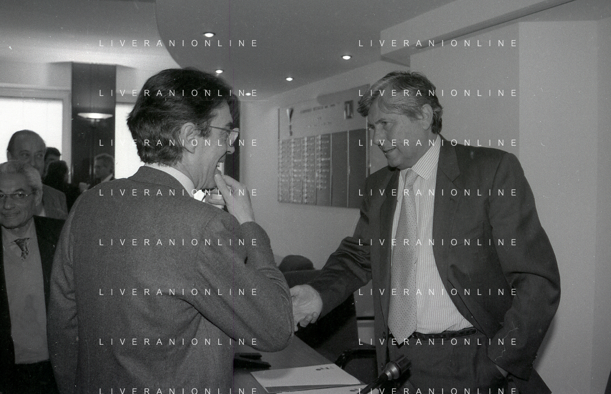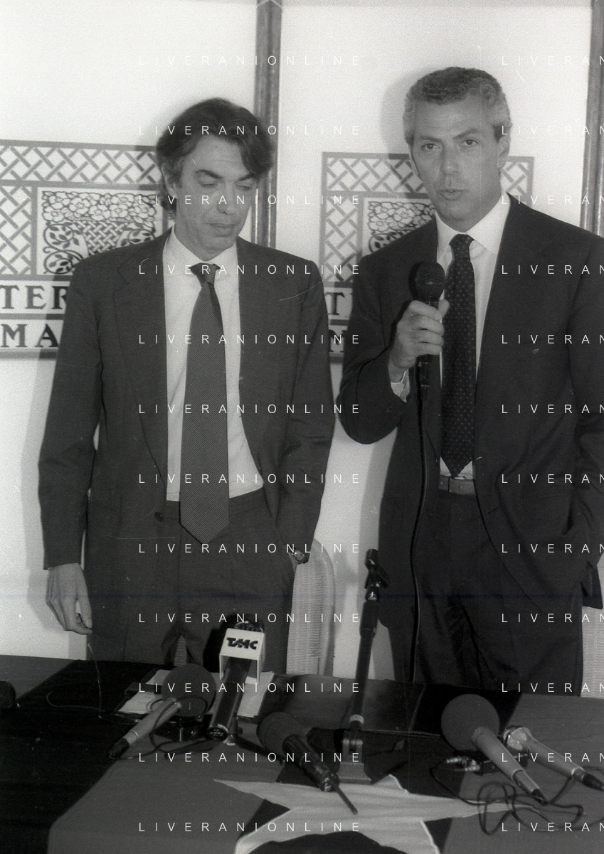 NEG-RETROSPETTIVA MASSIMO MORATTI PRESIDENTE INTER NELLA FOTO MASSIMO MORATTI PRESIDENTE INTER CON GIAMMARIA VISCONTI DI MODRONE NELL'ANNO 1995 IN CONFERENZA STAMPA A MILANO SEDE INTER AG ALDO LIVERANI SAS