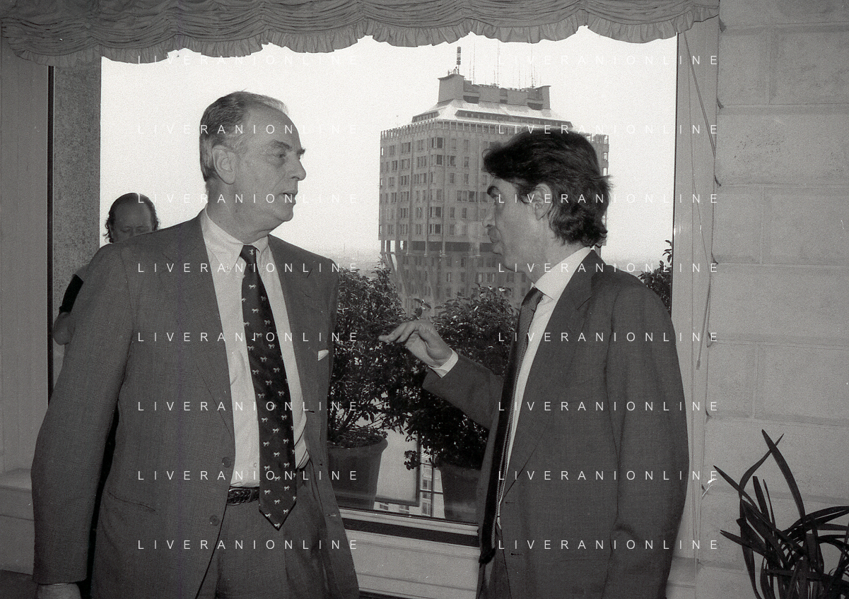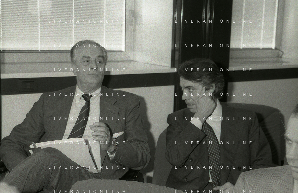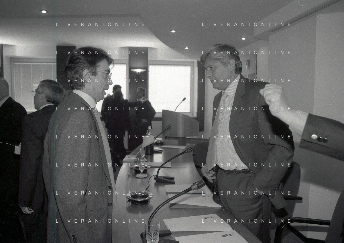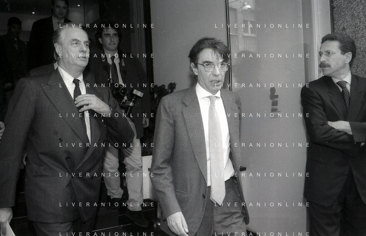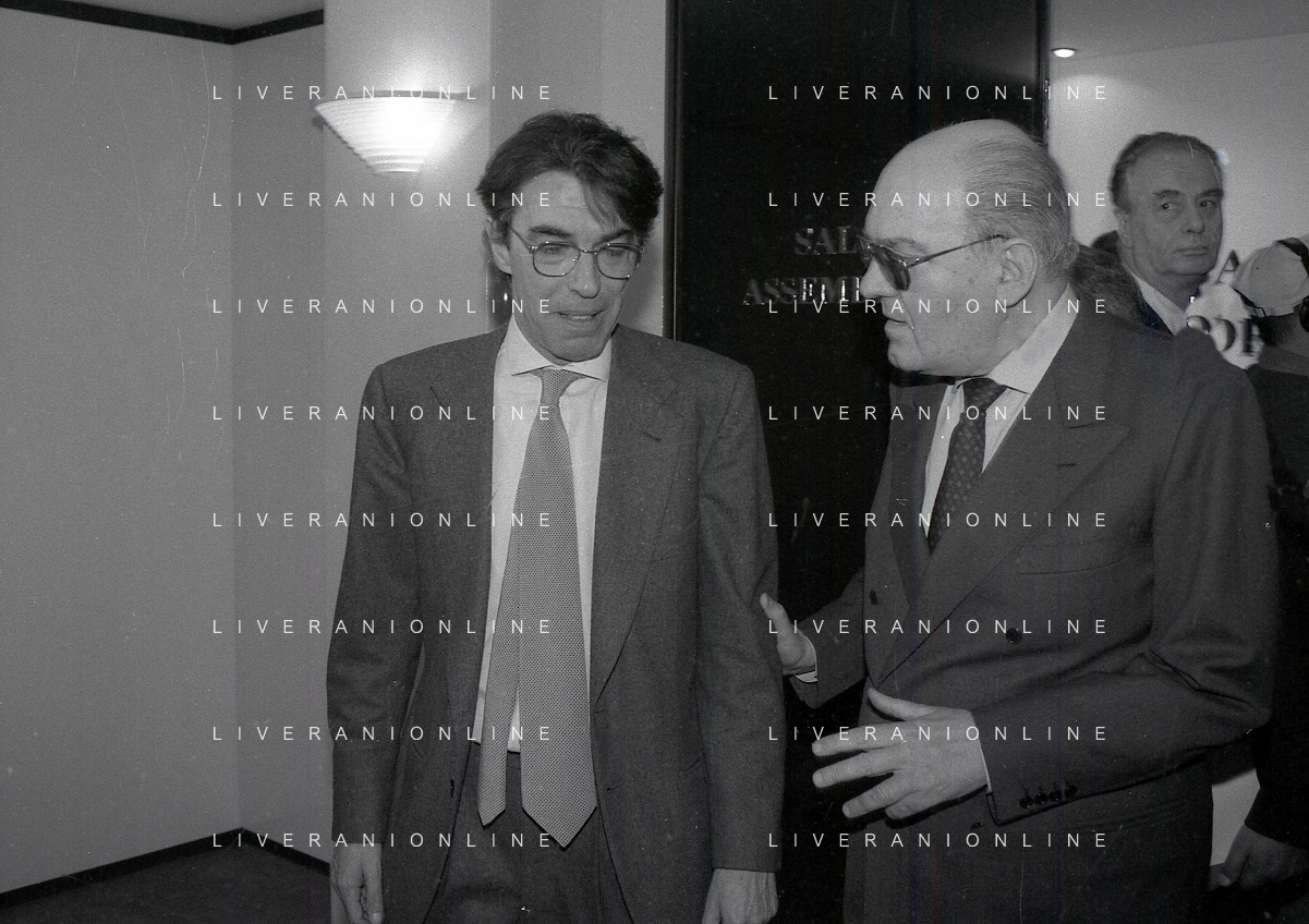 NEG-RETROSPETTIVA MASSIMO MORATTI PRESIDENTE INTER NELLA FOTO MASSIMO MORATTI PRESIDENTE INTER CON GIAMMARIA VISCONTI DI MODRONE NELL'ANNO 1995 IN CONFERENZA STAMPA A MILANO SEDE INTER AG ALDO LIVERANI SAS