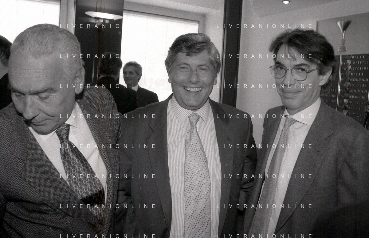 NEG-RETROSPETTIVA MASSIMO MORATTI PRESIDENTE INTER NELLA FOTO MASSIMO MORATTI IL PRIMO GIORNO IN LEGA CALCIO DA PRESIDENTE INTER NELL'ANNO 1995 CON MICHELE TIGANI E LUCIANO NIZZOLA AG ALDO LIVERANI SAS