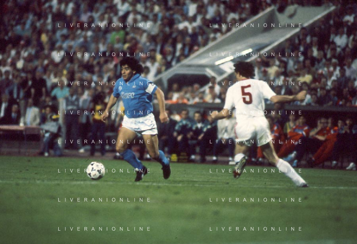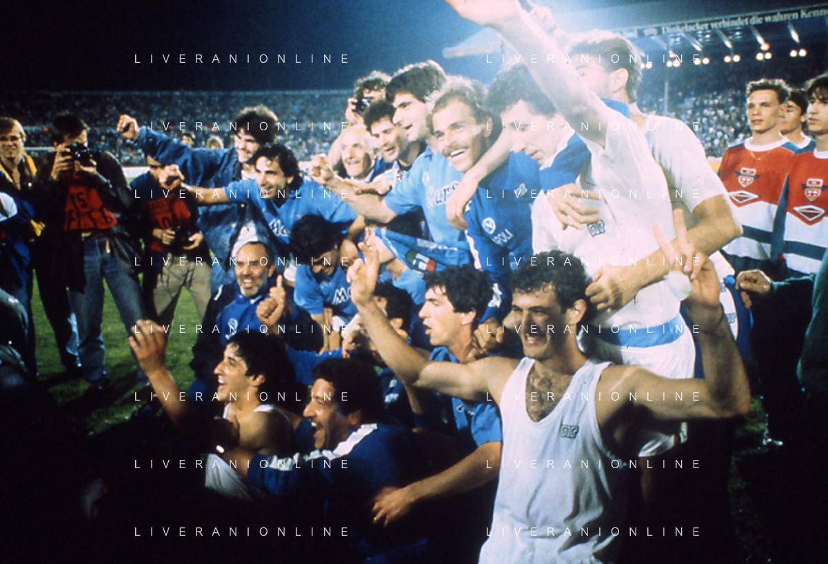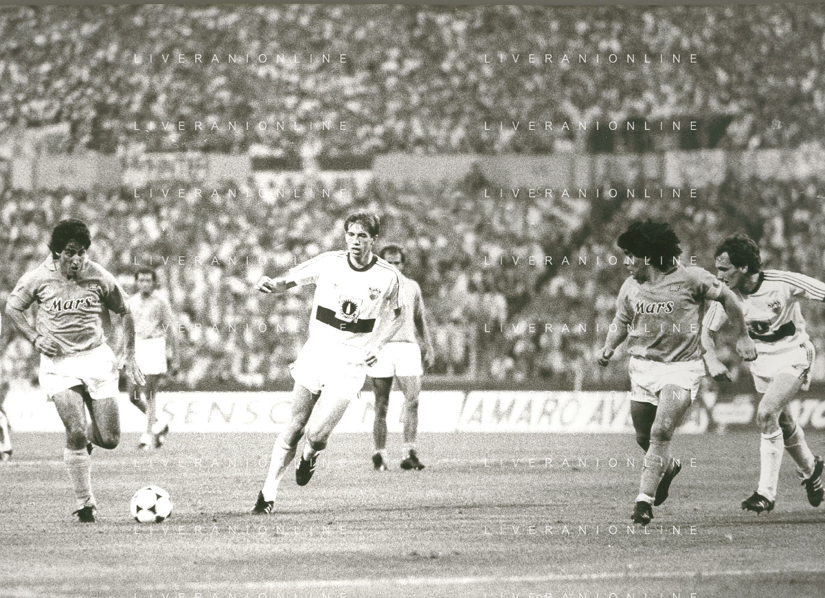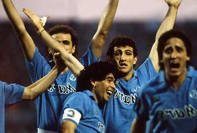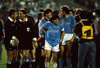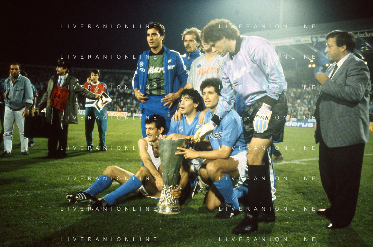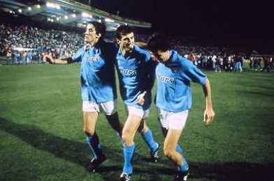 ARCHIVIO COPPA UEFA 1988/1989 STOCCARDA - NAPOLI NELLA FOTO. CIRO FERRARA ESULTA PER LA RETE SIGLATA ABBRACCIATO DA MARADONA E DE NAPOLI AG.ARCHIVIO AG.A .LIVERANI SAS