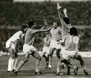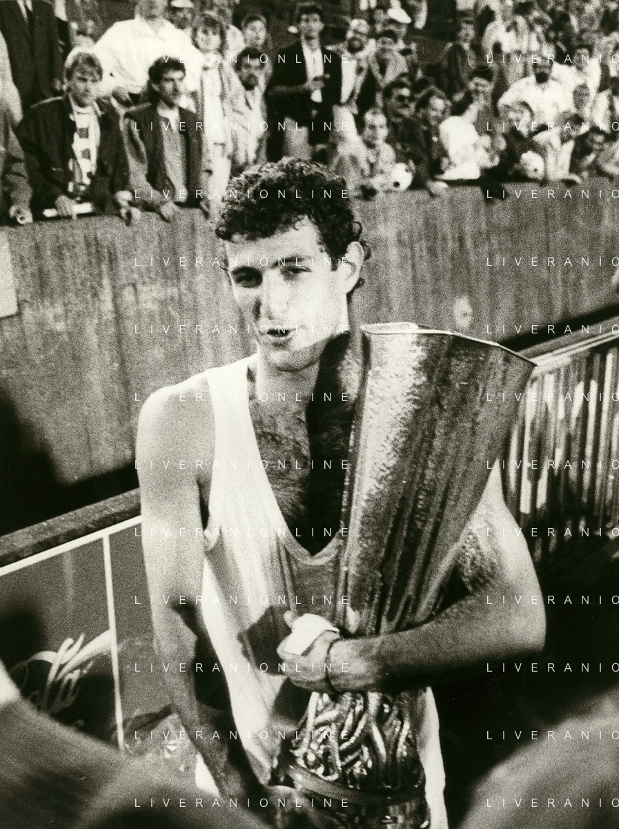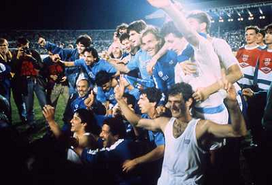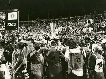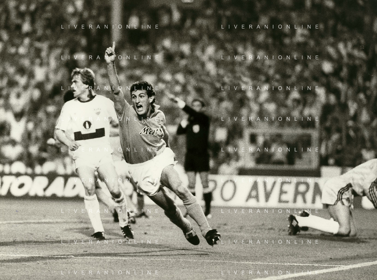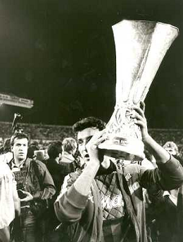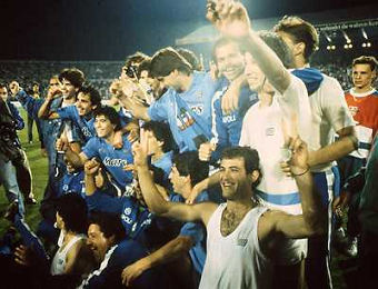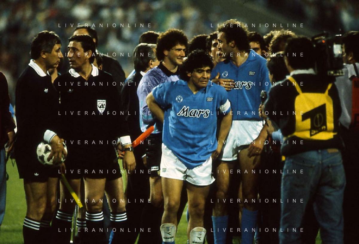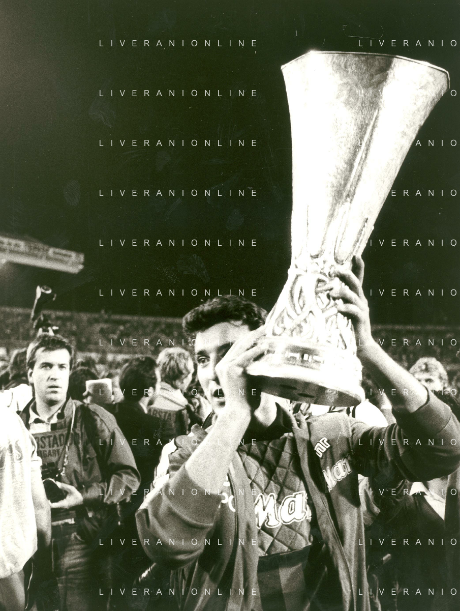 ARCHIVIO COPPA UEFA 1988/1989 STOCCARDA - NAPOLI NELLA FOTO. CIRO FERRARA ESULTA PER LA RETE SIGLATA ABBRACCIATO DA MARADONA E DE NAPOLI AG.ARCHIVIO AG.A .LIVERANI SAS