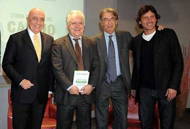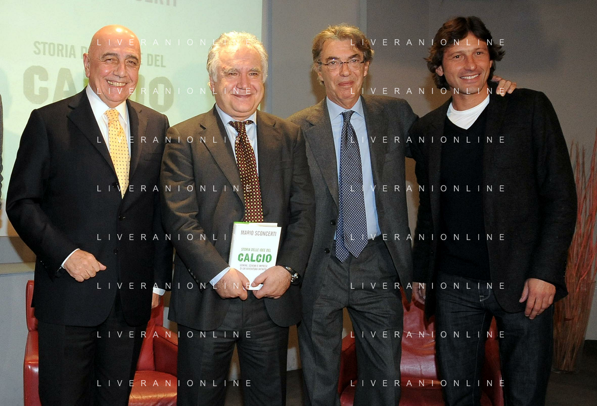 MILANO 11/11/2009 MONDADORI MULTICENTER VIA MARGHERA, 28 PRESENTAZIONE DEL LIBRO DI MARIO SCONCERTI: 'STORIA DELLE IDEE DEL CALCIO' NELLA FOTO ADRIANO GALLIANI, MARIO SCONCERTI, MASSIMO MORATTI E LEONARDO FOTO ROMANO/AG ALDO LIVERANI