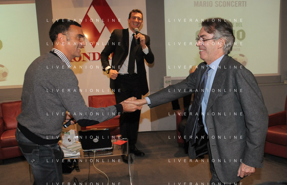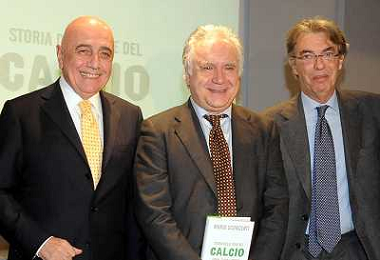 MILANO 11/11/2009 MONDADORI MULTICENTER VIA MARGHERA, 28 PRESENTAZIONE DEL LIBRO DI MARIO SCONCERTI: 'STORIA DELLE IDEE DEL CALCIO' NELLA FOTO ADRIANO GALLIANI, MARIO SCONCERTI E MASSIMO MORATTI FOTO ROMANO/AG ALDO LIVERANI