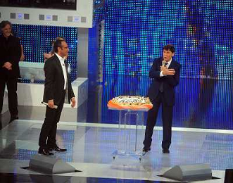 ROMA - STUDIOS VIA TIBURTINA 11.12.09 TRASMISSIONE I MIGLIORI ANNI PUNTATA DEL 11.12.09 nella foto: LA TORTA PER FESTEGGIARE I 60 ANNI DI GIANNI MORANDI - CARLO CONTI