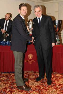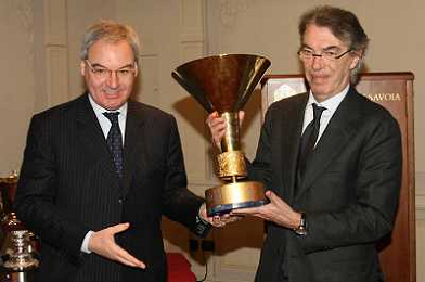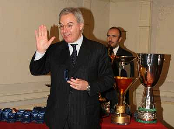 MILANO 13-12-2010 HOTEL PRINCIPE DI SAVOIA CALCIO LEGA CALCIO PREMIAZIONI ANNO CALCISTICO SERIE A TIM 2009-2010 NELLA FOTO MASSIMO MORATTI CON LE COPPE PH.FIOCHI/AG ALDO LIVERANI SAS