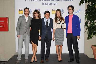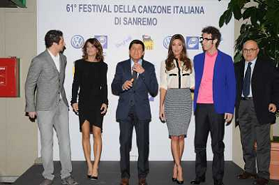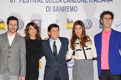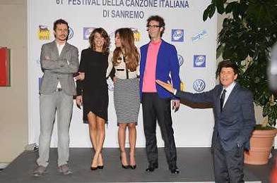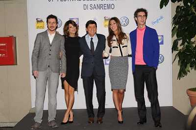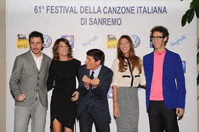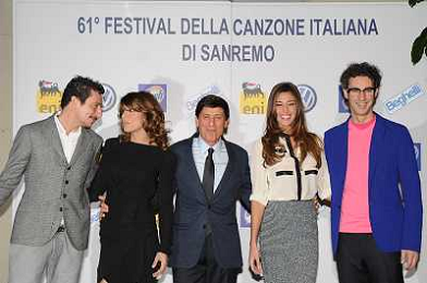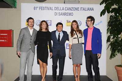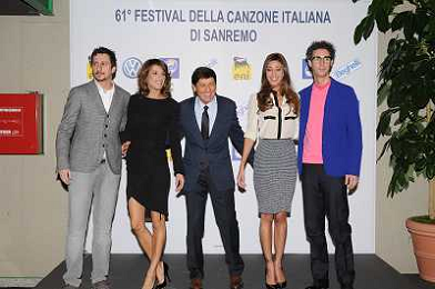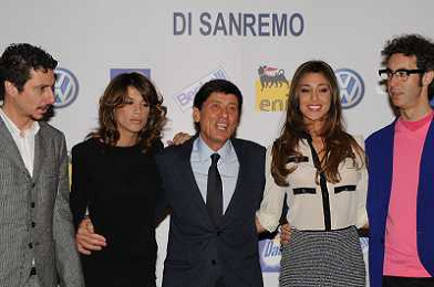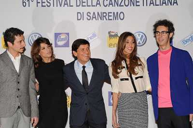 SANREMO 14 FEBBRAIO 2011 61mo FESTIVAL DELLA CANZONE ITALIANA CONFERENZA STAMPA DI PRESENTAZIONE UFFICIALE NELLLA FOTO LUCA BIZZARRI , ELISABETTA CANALIS , BELEN RODRIGUEZ , PAOLO KESSISOGLU , GIANNI MORANDI FOTO GAZZANICA/AG. ALDO LIVERANI SAS