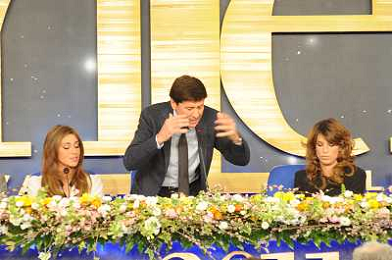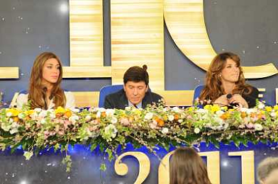 SANREMO 14 FEBBRAIO 2011 61mo FESTIVAL DELLA CANZONE ITALIANA CONFERENZA STAMPA DI PRESENTAZIONE UFFICIALE NELLLA FOTO ELISABETTA CANALIS , GIANNI MORANDI , BELEN RODRIGUEZ FOTO GAZZANICA/AG. ALDO LIVERANI SAS