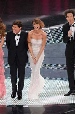 61mo FESTIVAL DELLA CANZONE ITALIANA DI SANREMO 19/02/2011 - QUINTA ED ULTIMA SERATA NELLA FOTO ELISABETTA CANALIS CON PAOLO KESSISSOGLU E GIANNI MORANDI ©GAZZANIGA/AGENZIA ALDO LIVERANI SAS