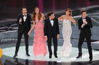 61mo FESTIVAL DELLA CANZONE ITALIANA DI SANREMO 19/02/2011 - QUINTA ED ULTIMA SERATA NELLA FOTO BELEN RODRIGUEZ, ELISABETTA CANALIS CON PAOLO KESSISSOGLU, LUCA BIZZARRI E GIANNI MORANDI ©GAZZANIGA/AGENZIA ALDO LIVERANI SAS